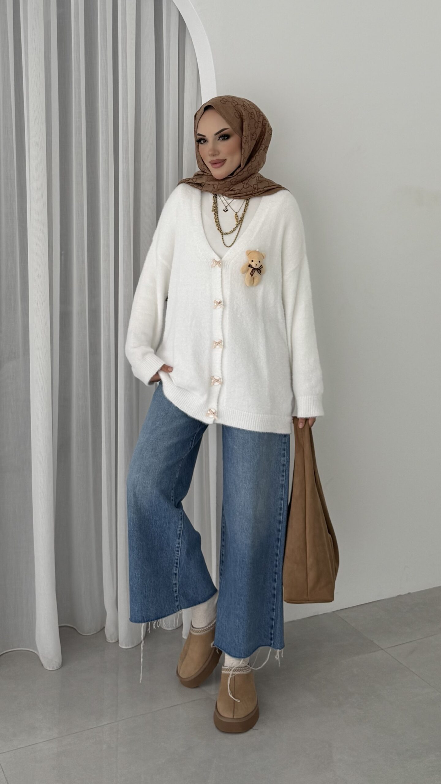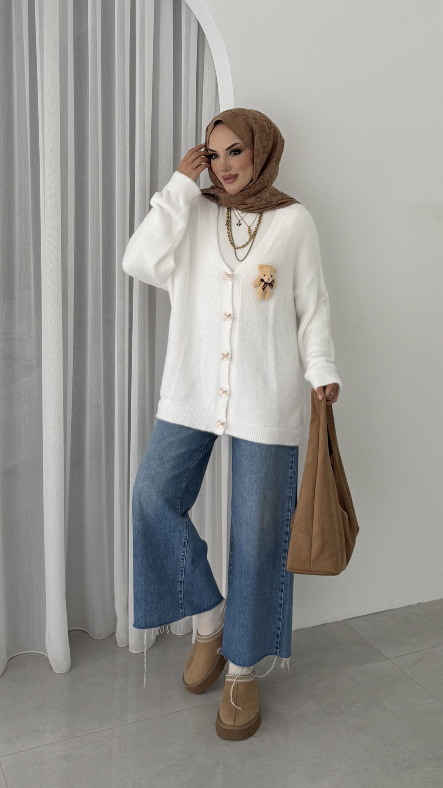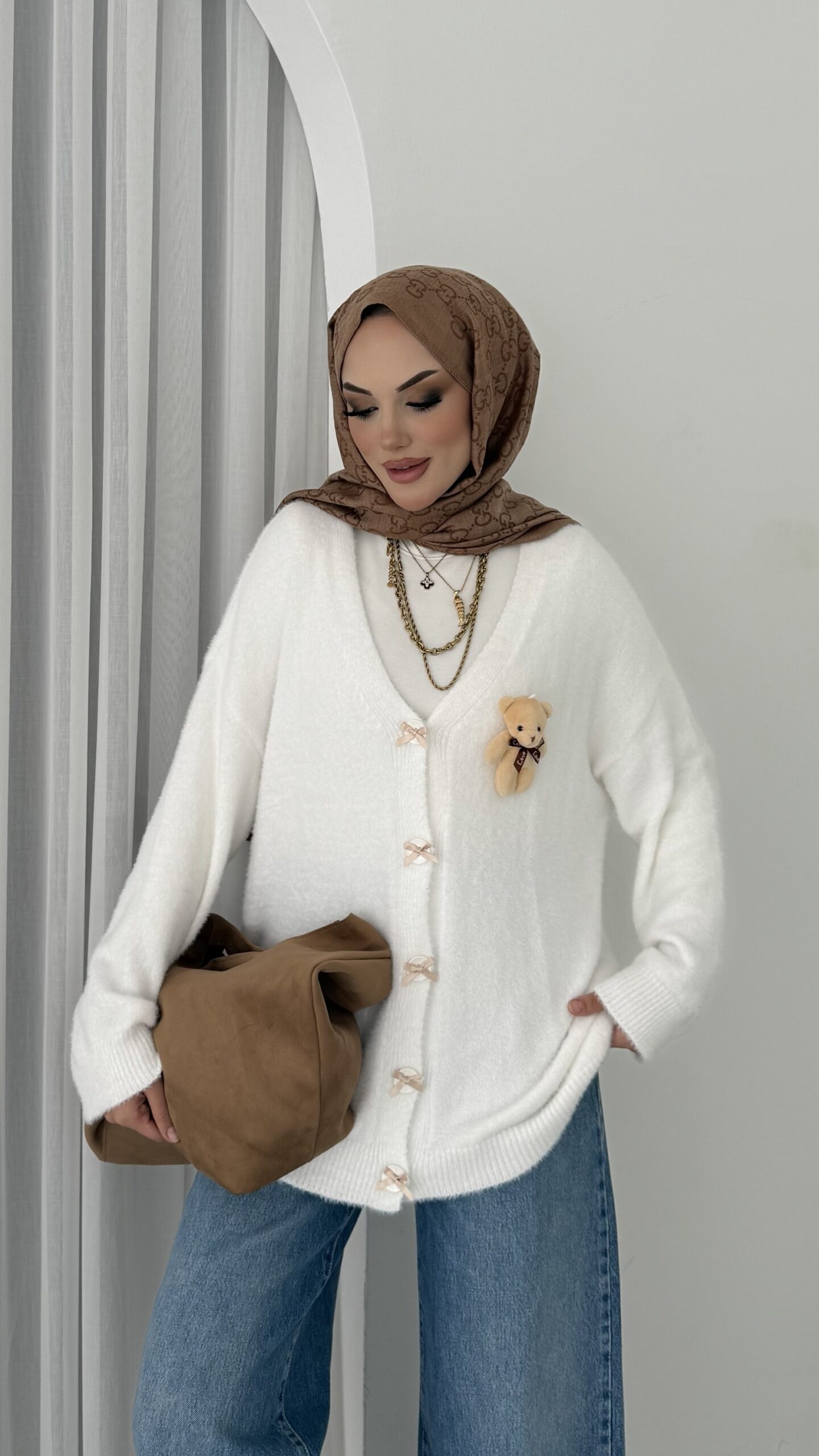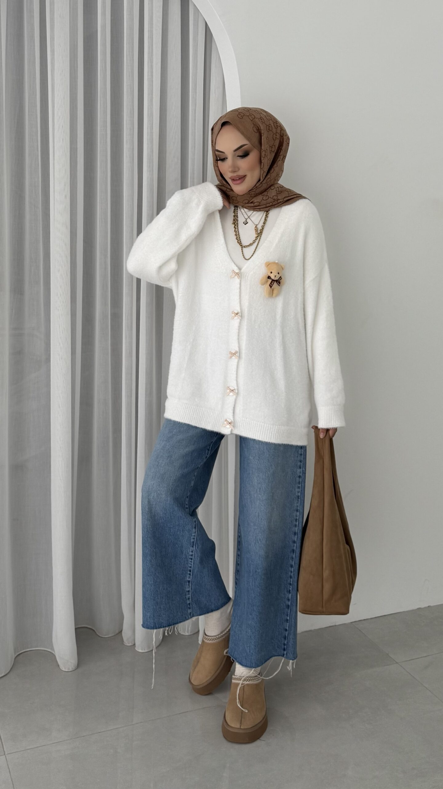 Ayıcık Aksesuarlı Sakallı Yumoş Hırka – Beyaz