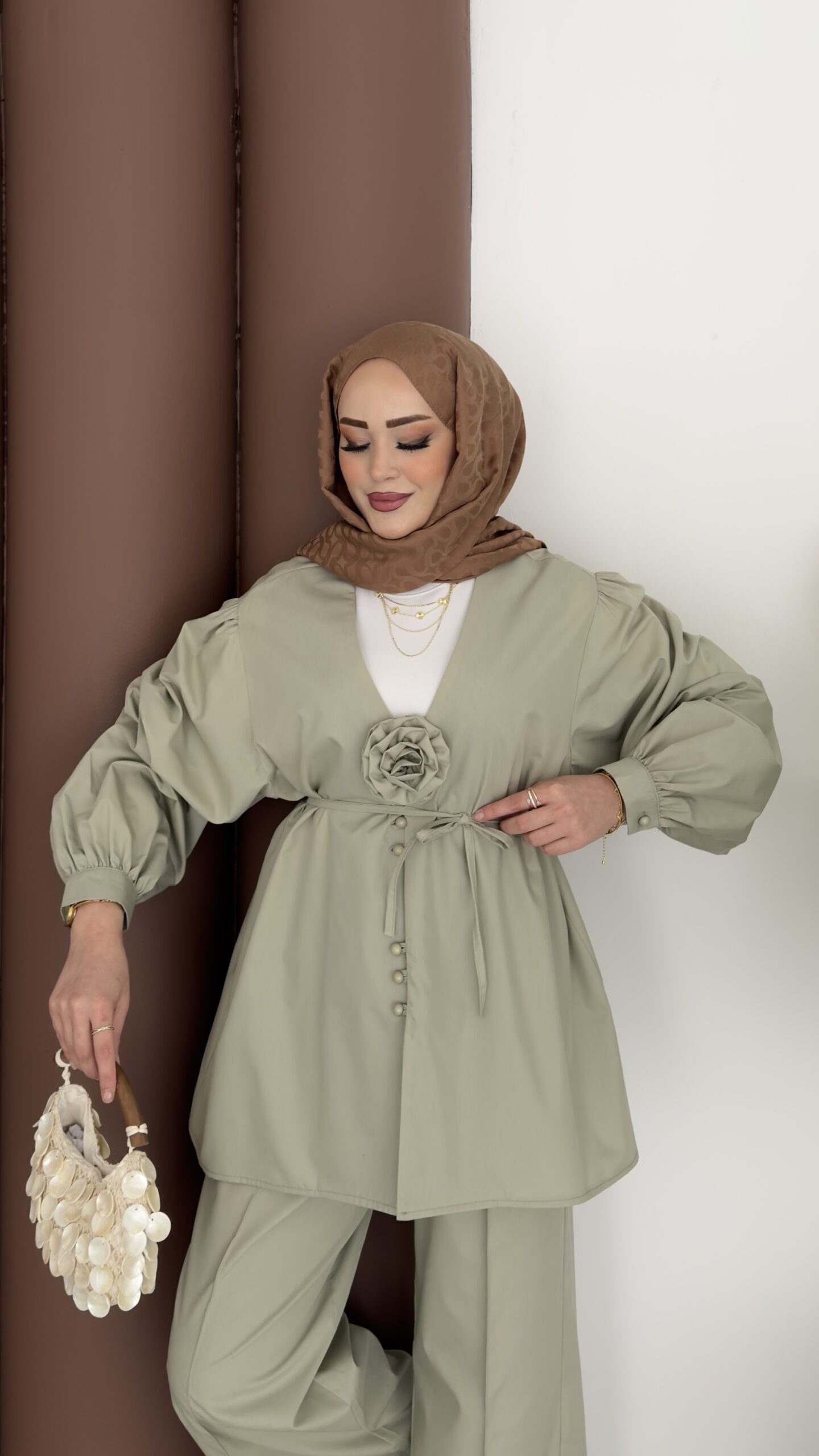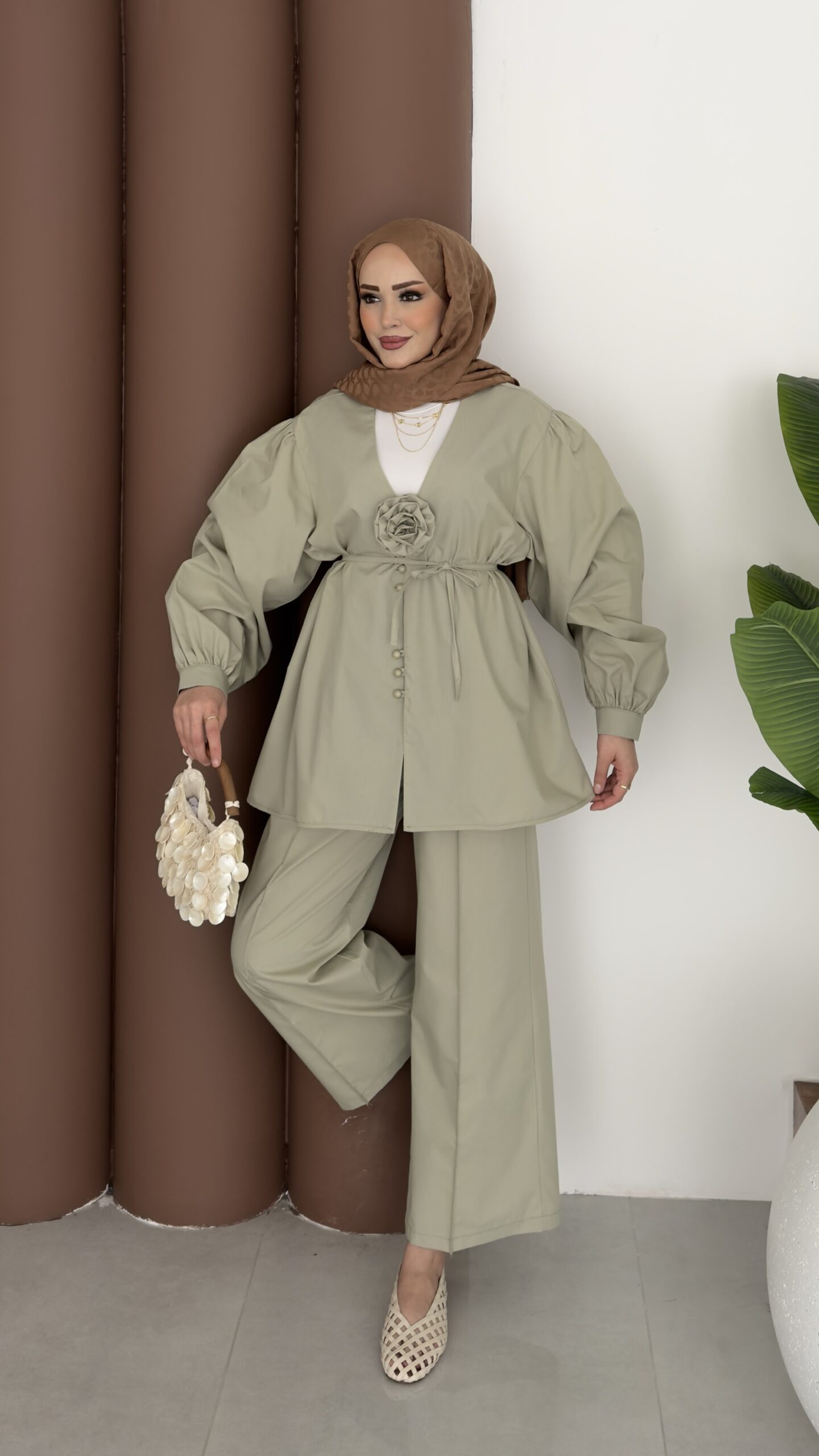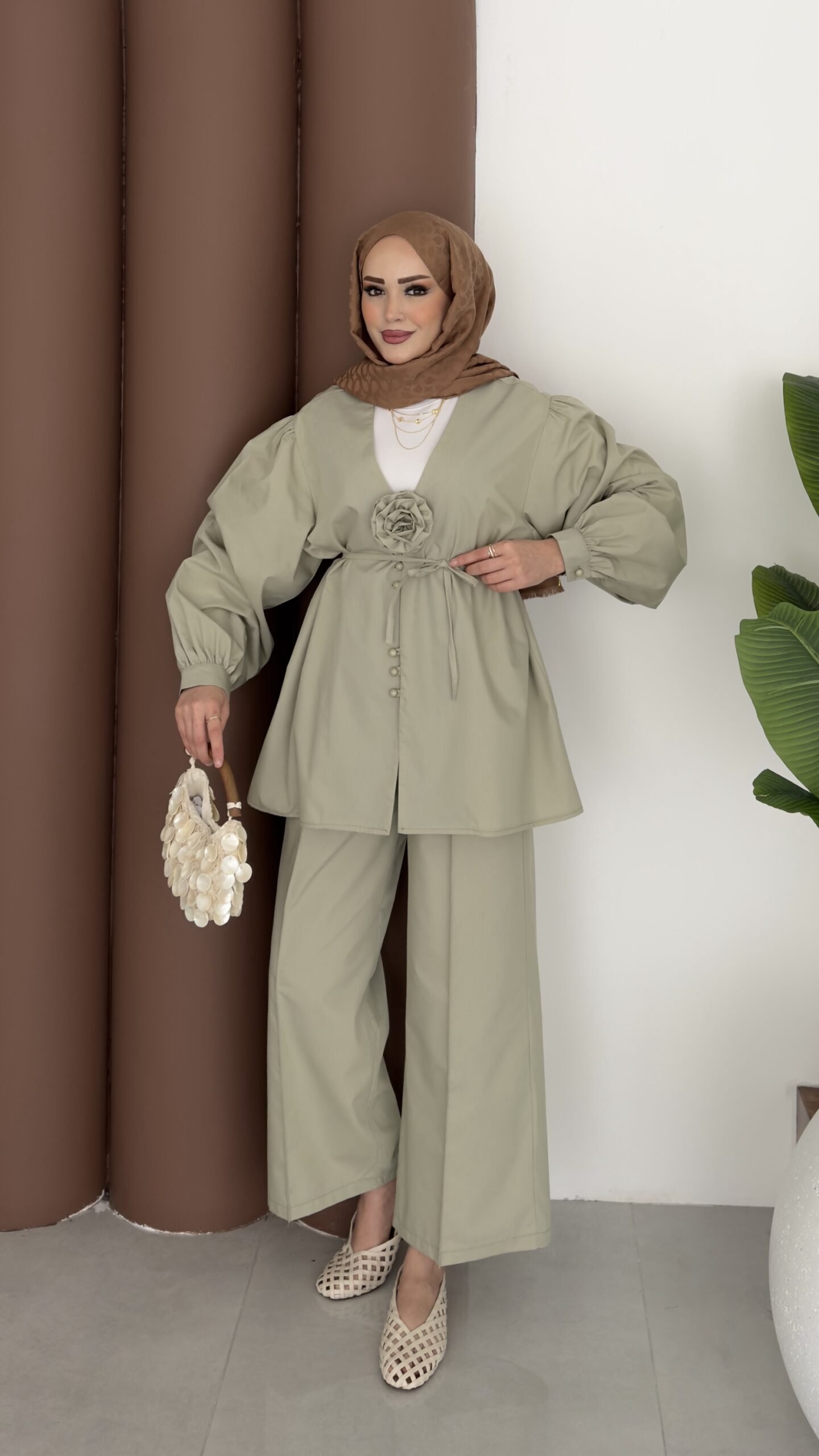 Muadil Biye Detaylı Etek İkili Takım – Haki