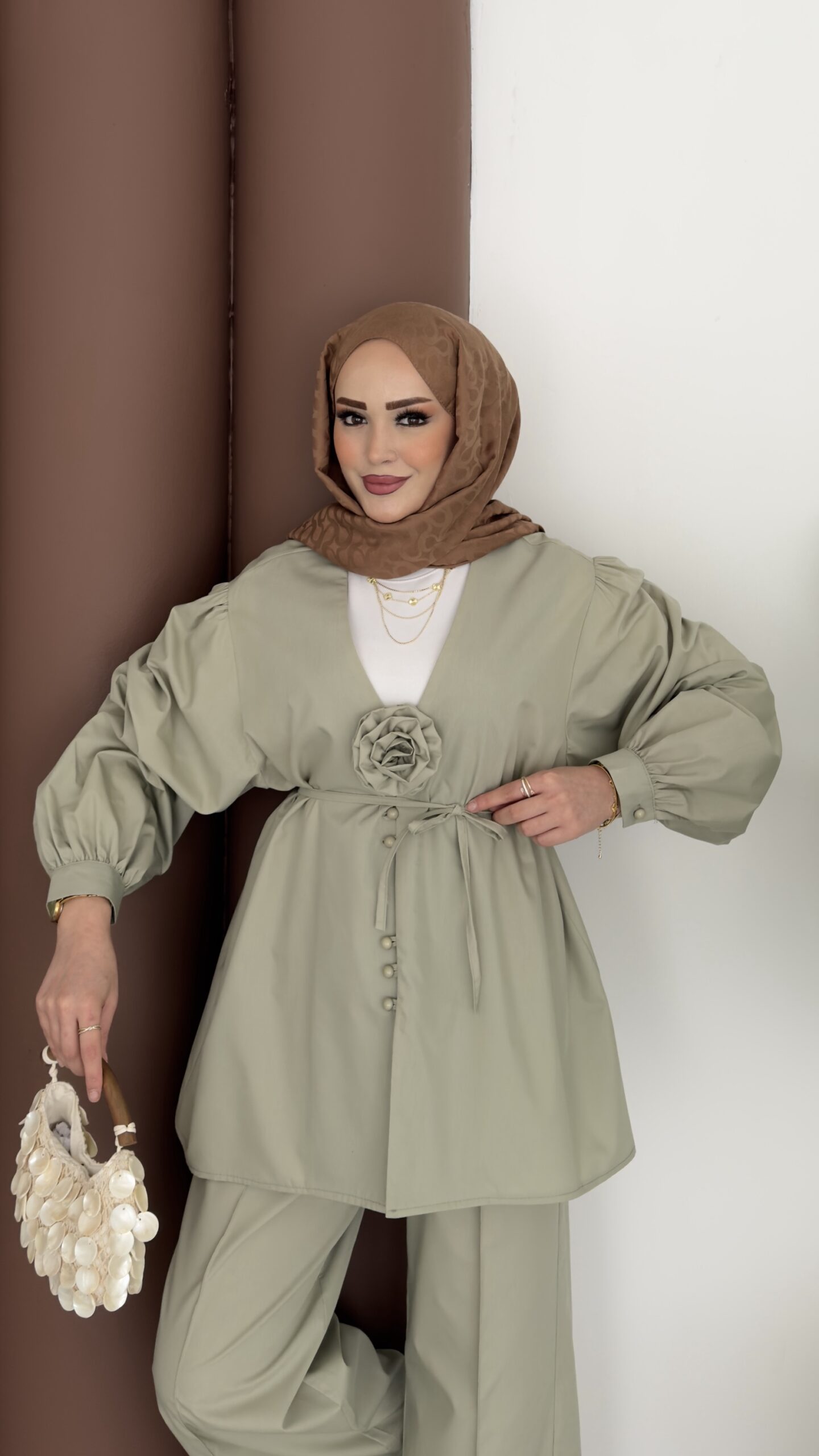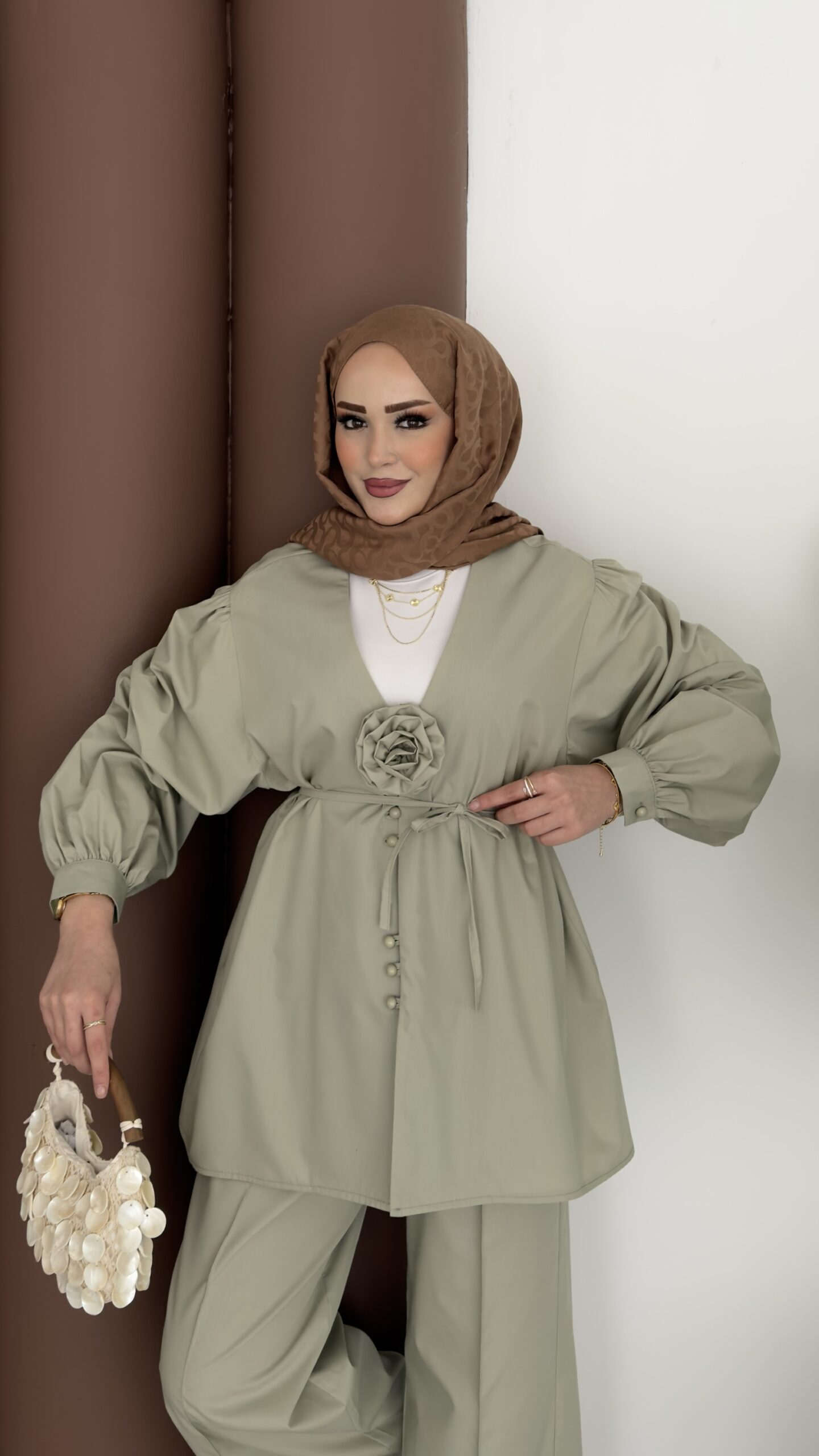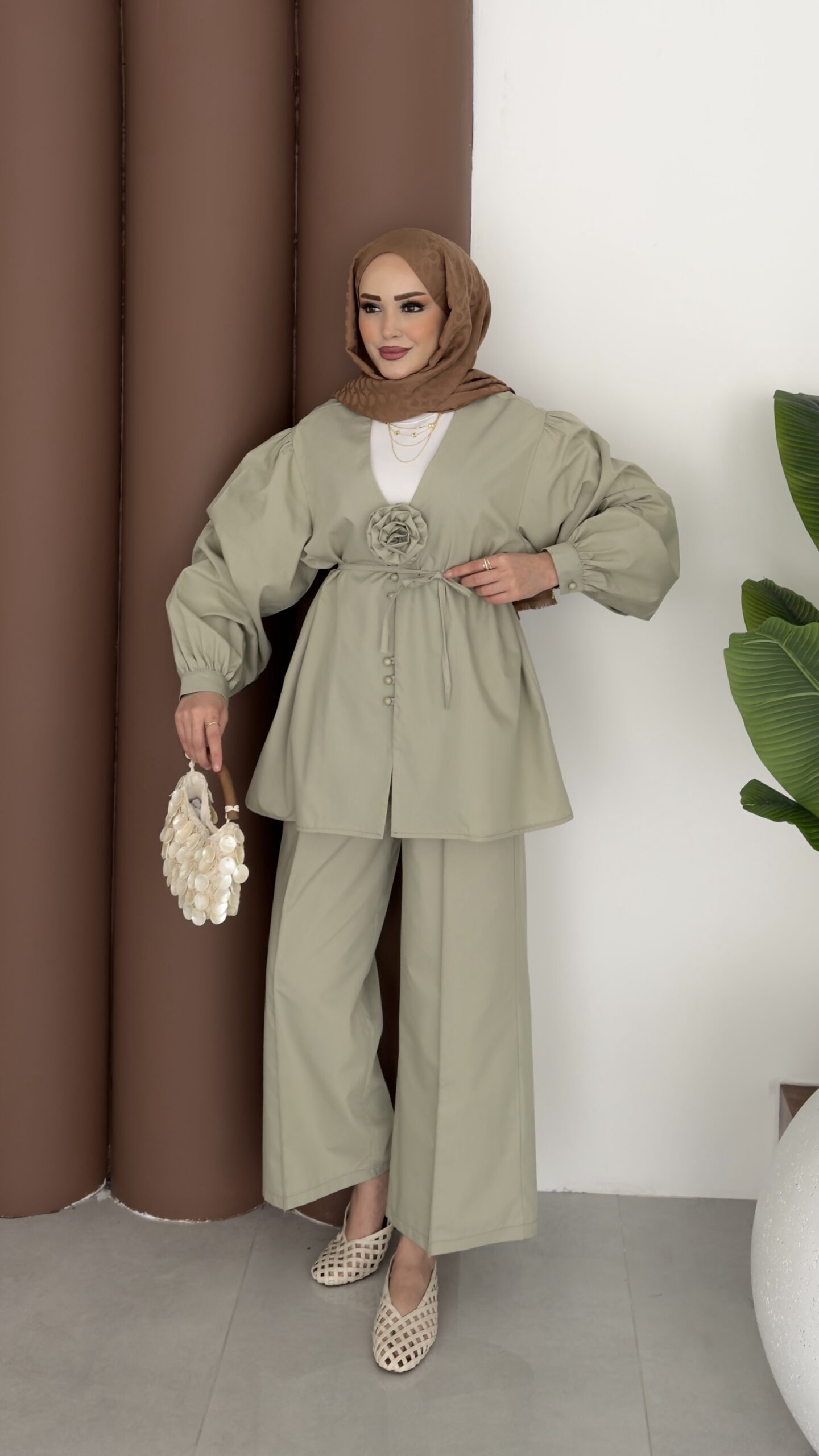 Muadil Biye Detaylı Etek İkili Takım – Haki