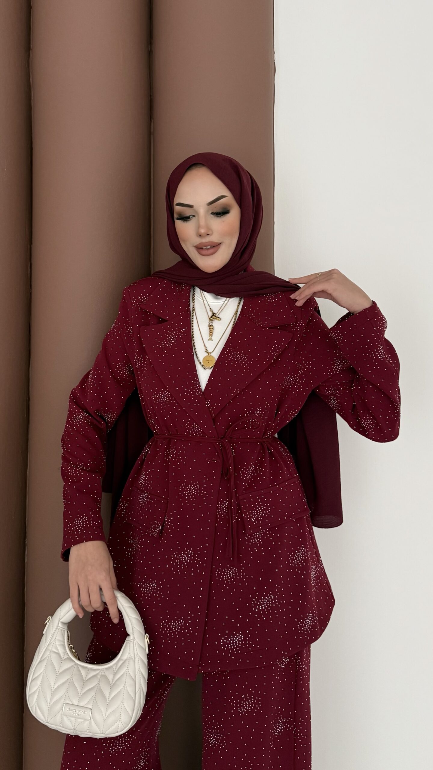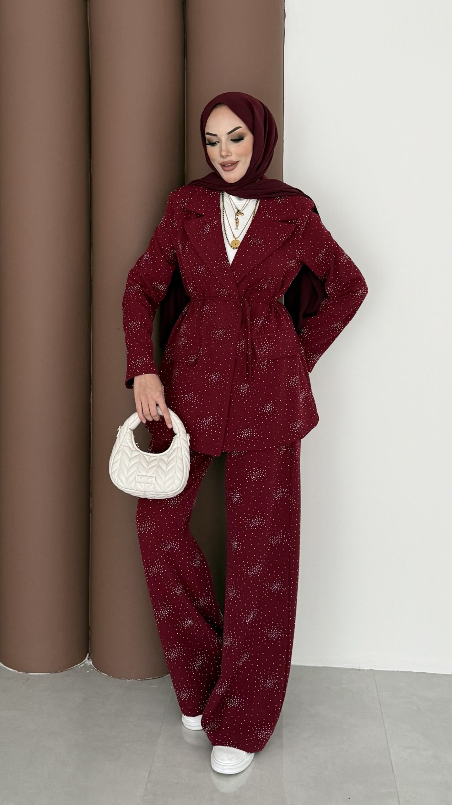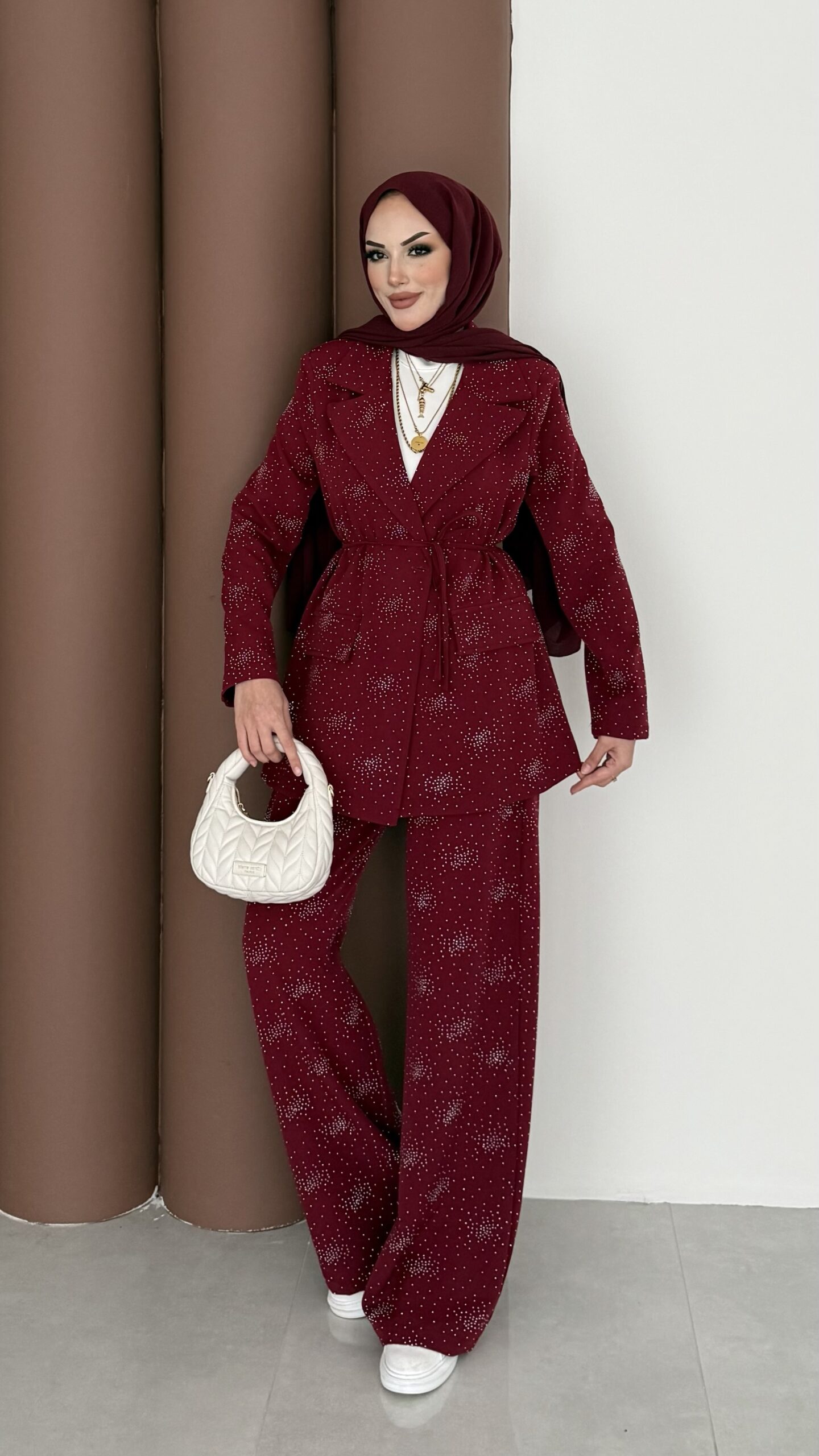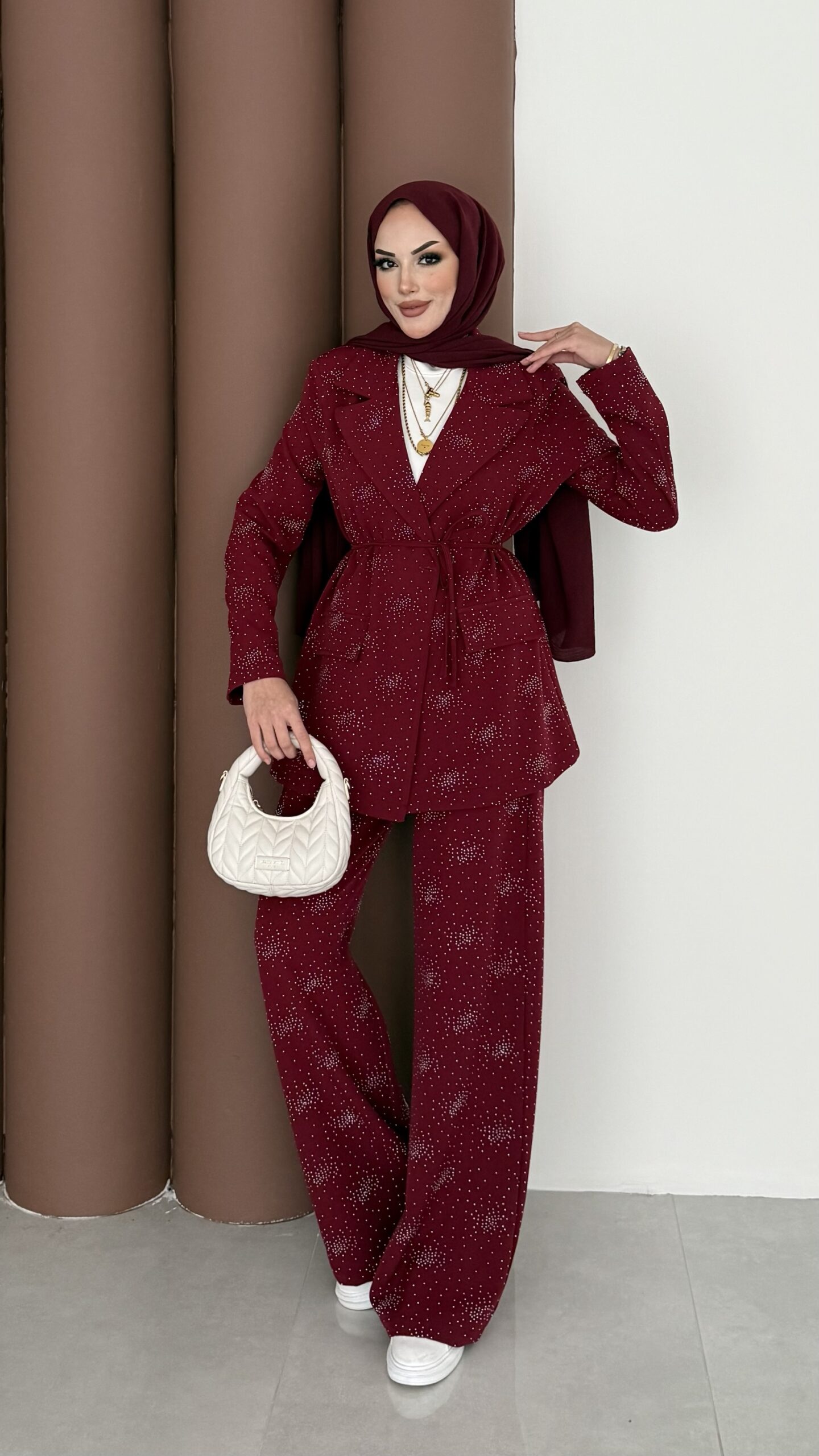Diamond Taşlı Büzgülü Scuba İkili Takım – Bordo
