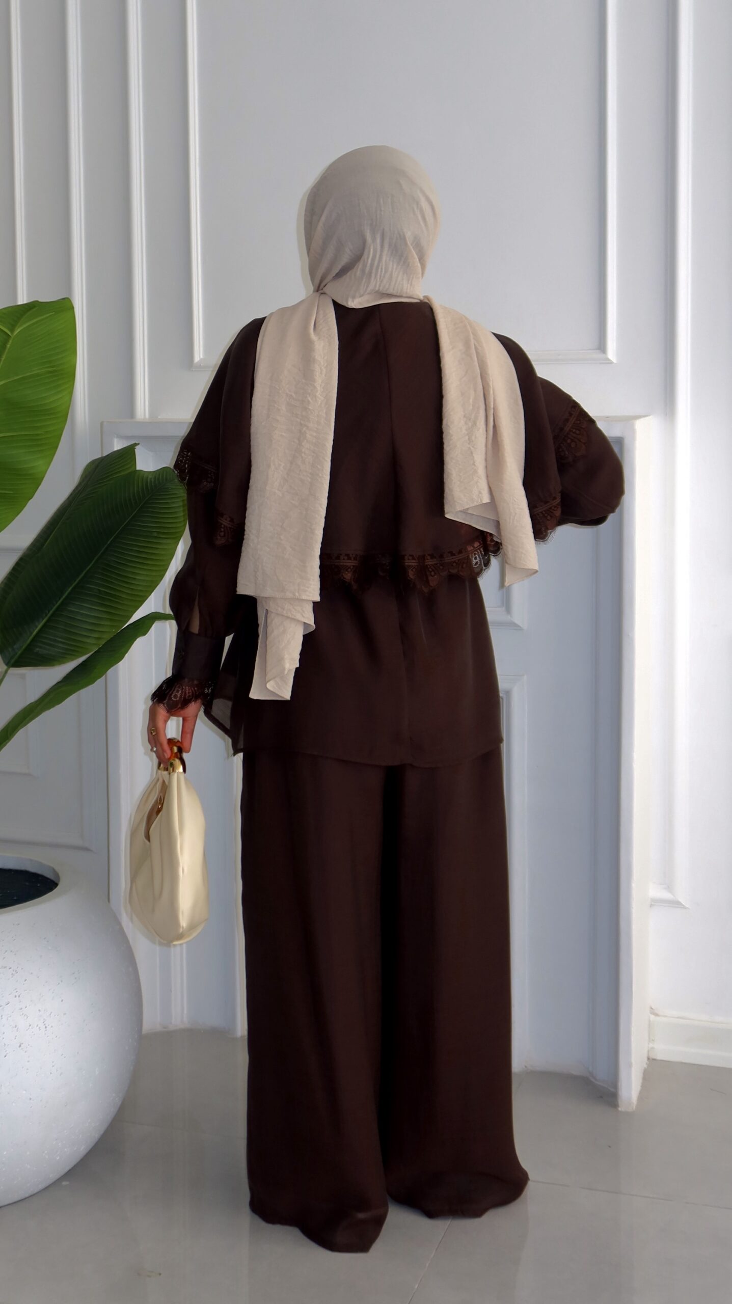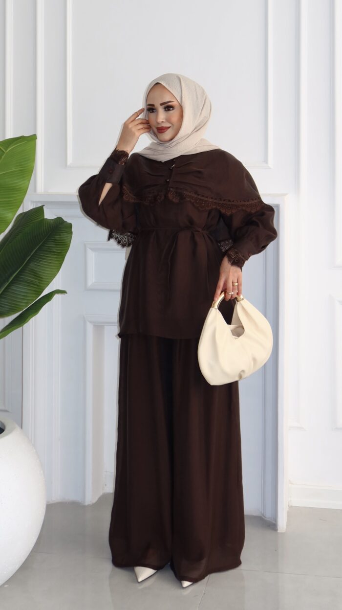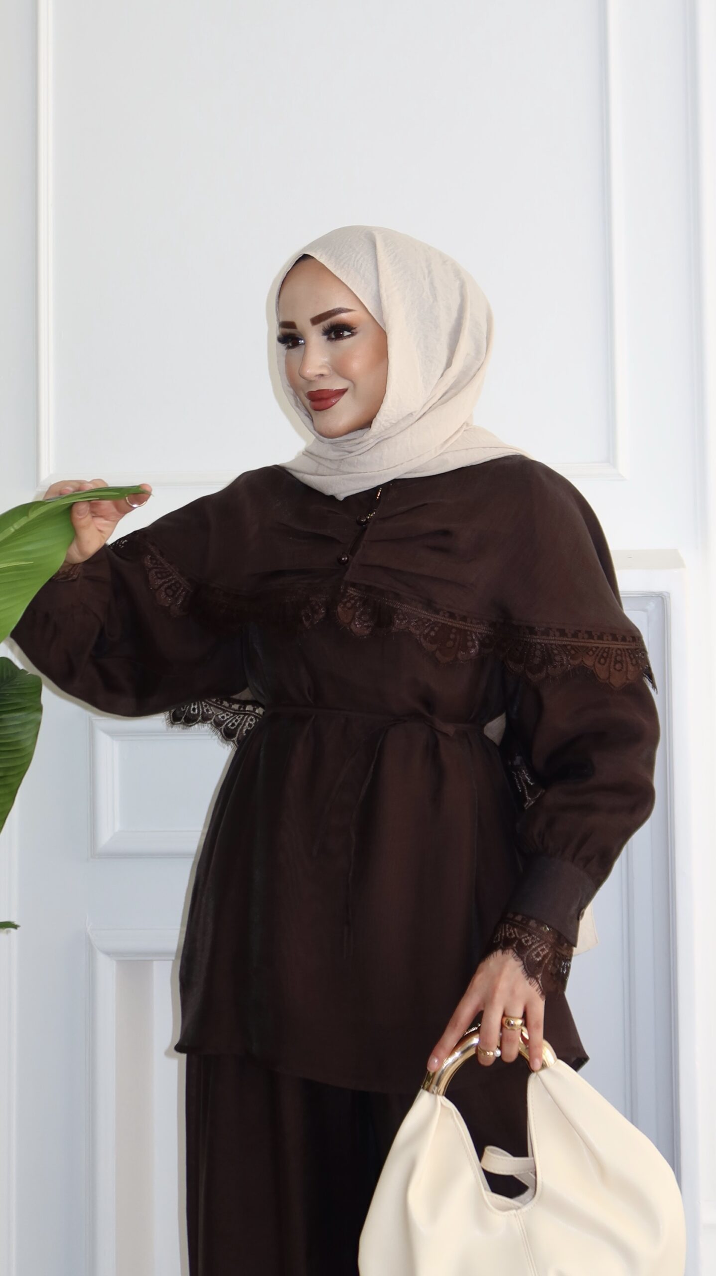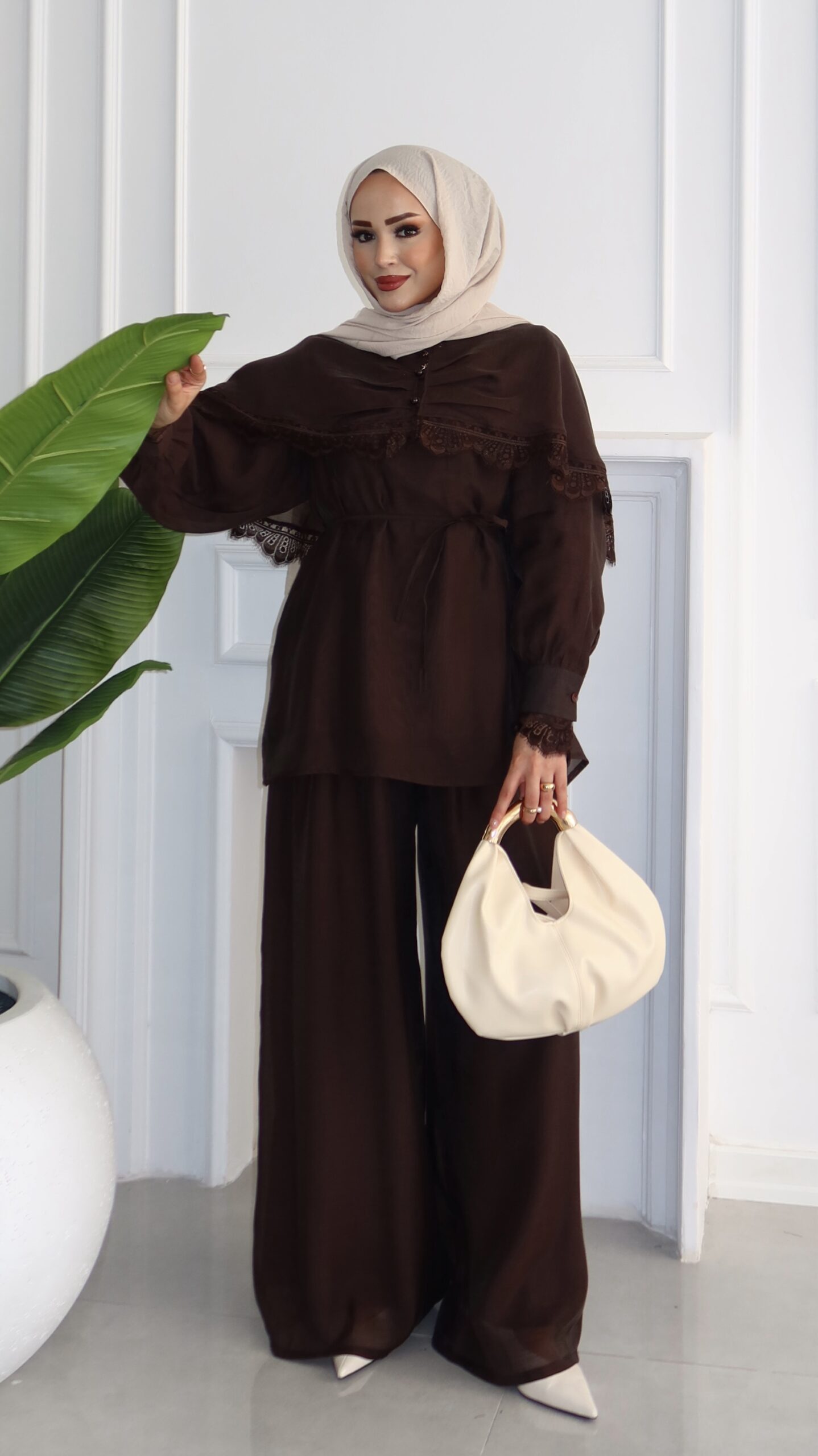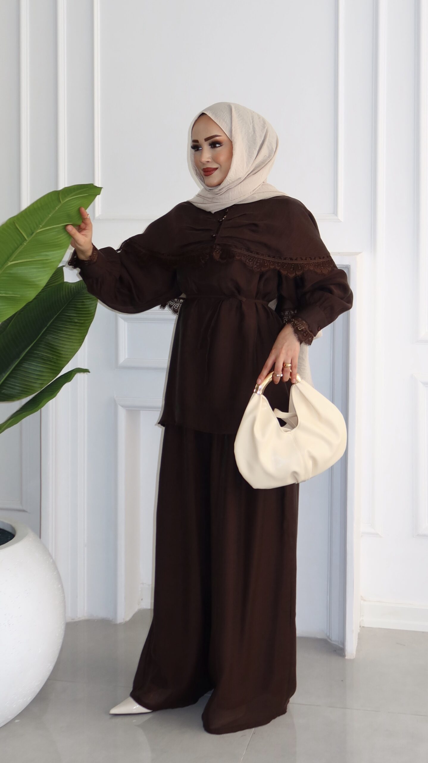 Güpür Yakalı Pelerin Vual İkili Takım – Kahverengi