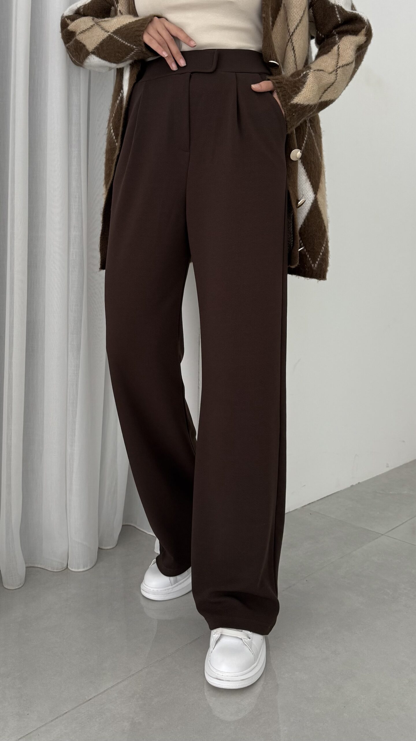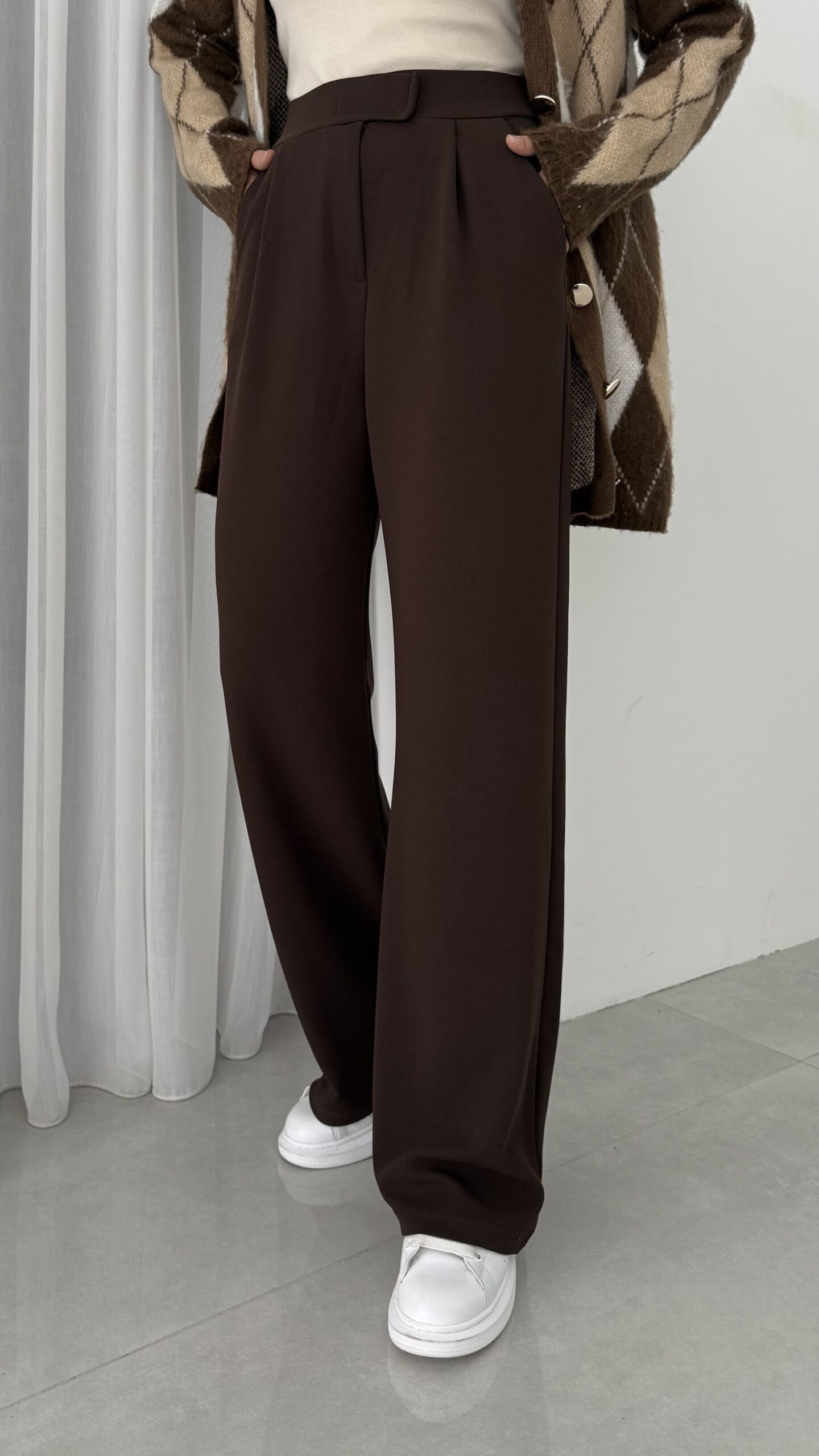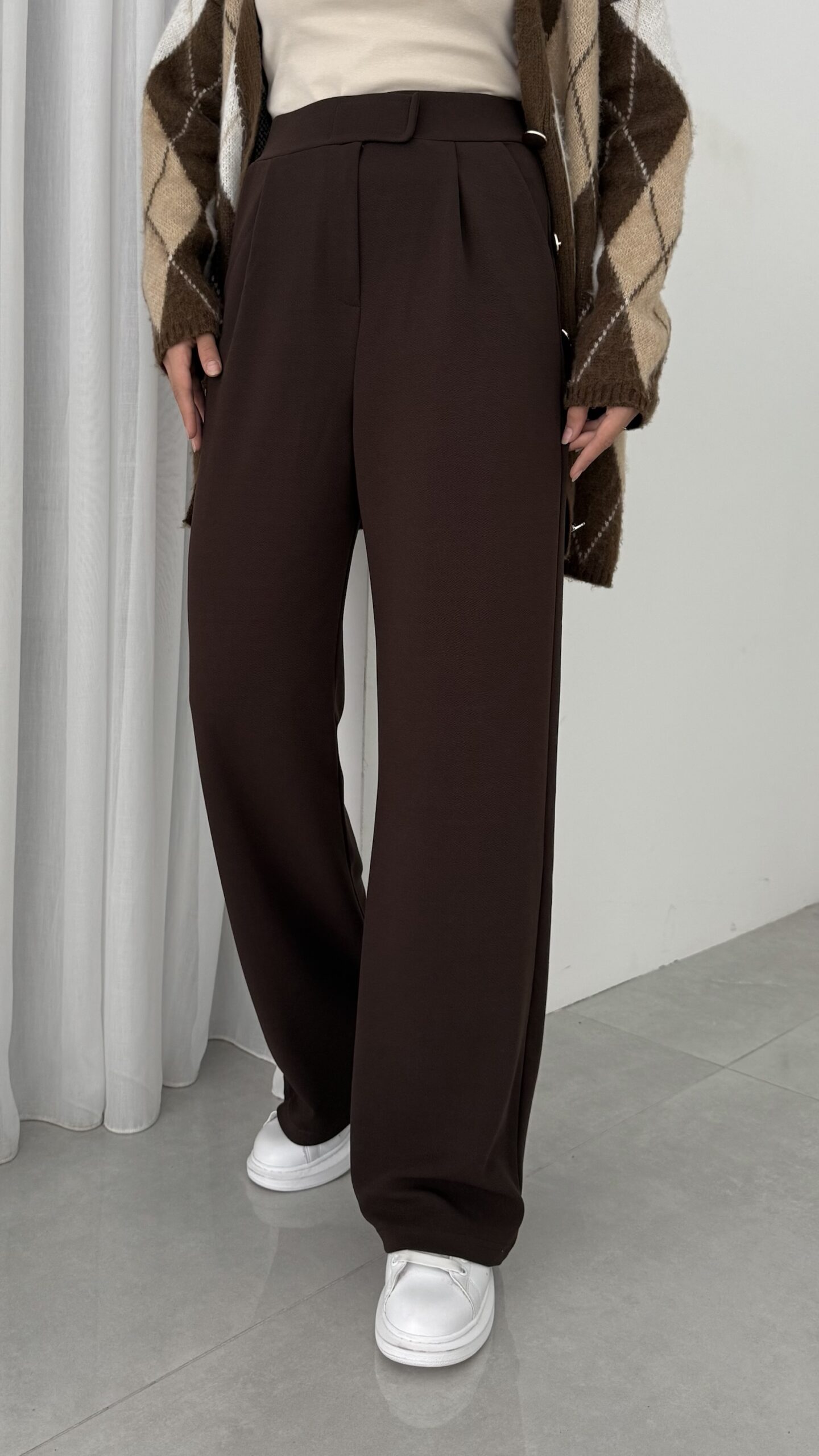 Çırtçırtlı Palazzo Krep Pantolon – Kahverengi