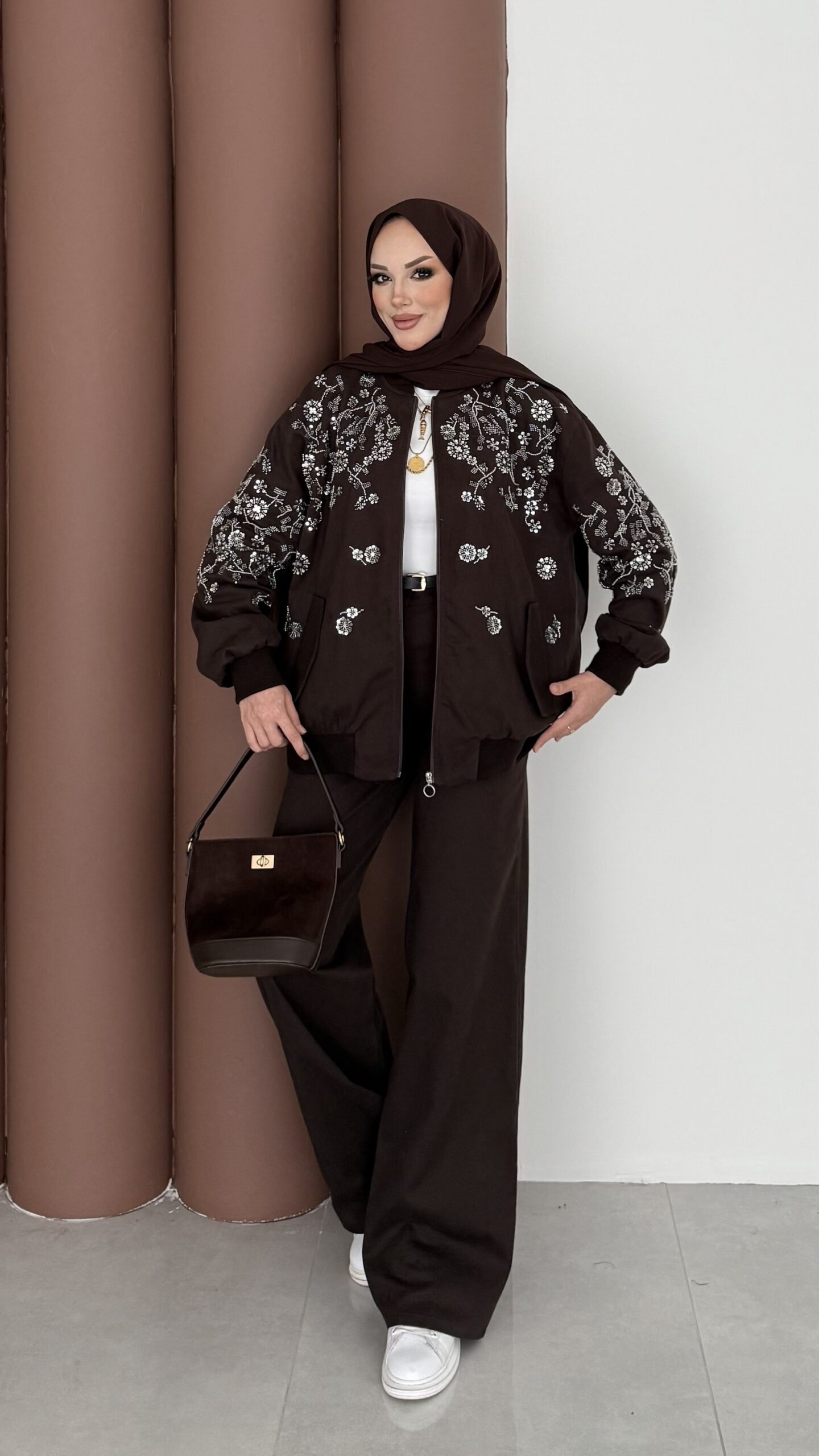 Peluş Garnili Şardonlu İkili Takım – Acı Kahverengi