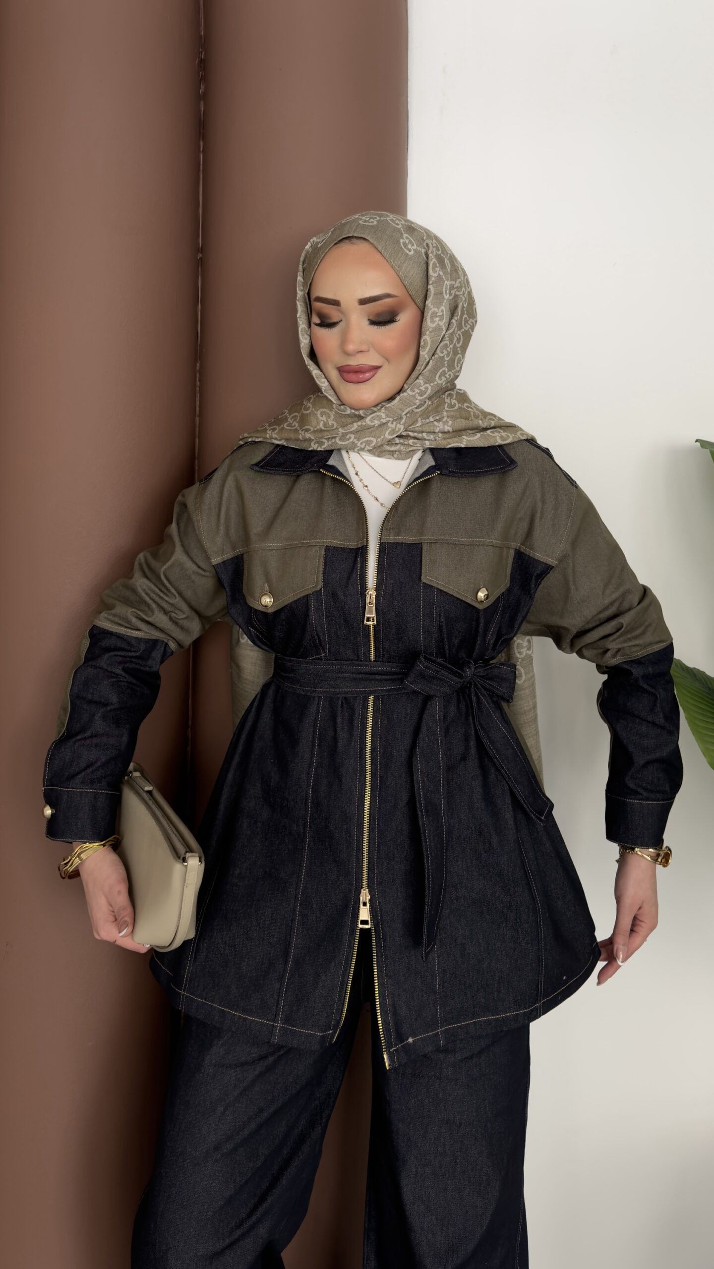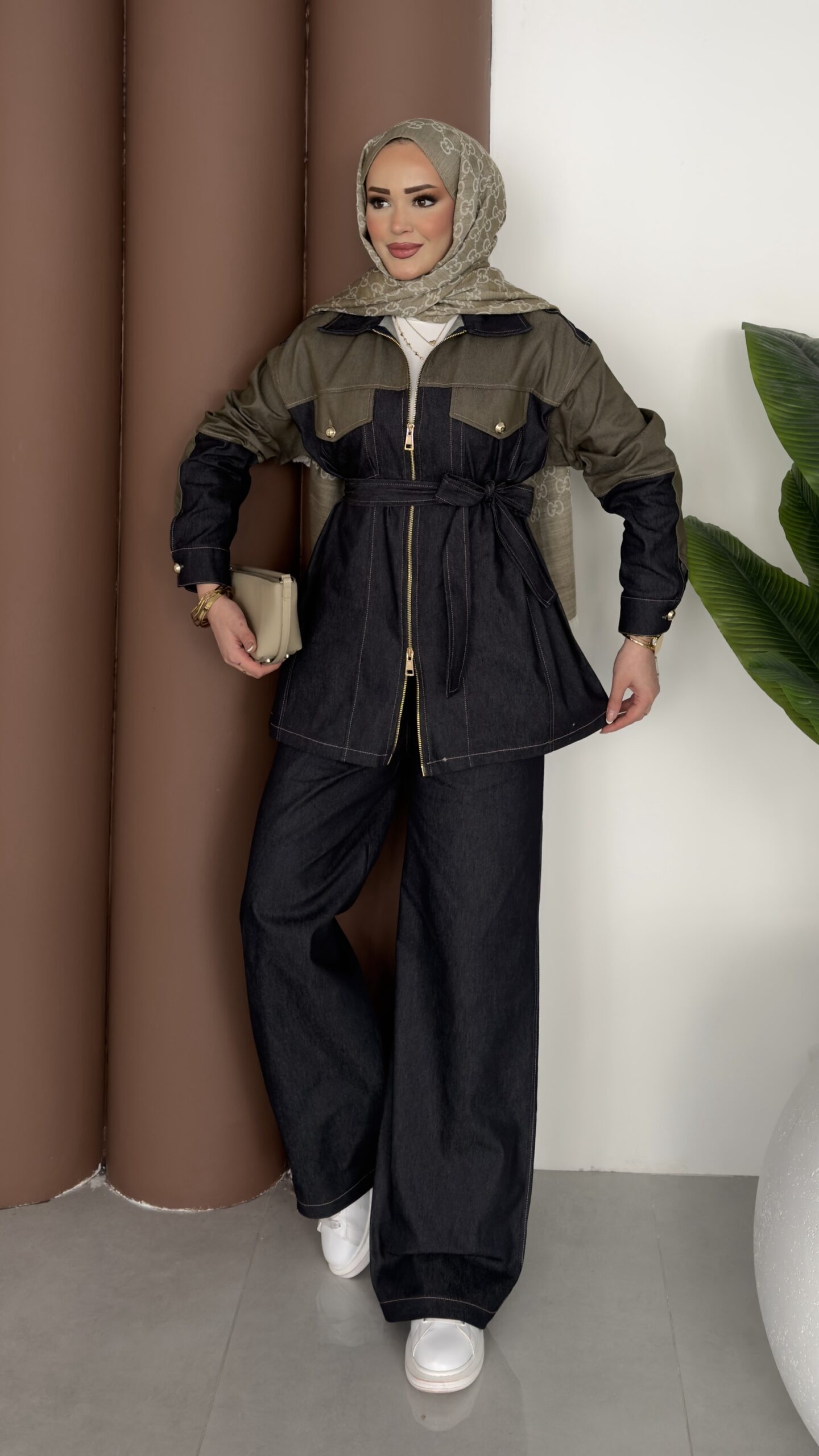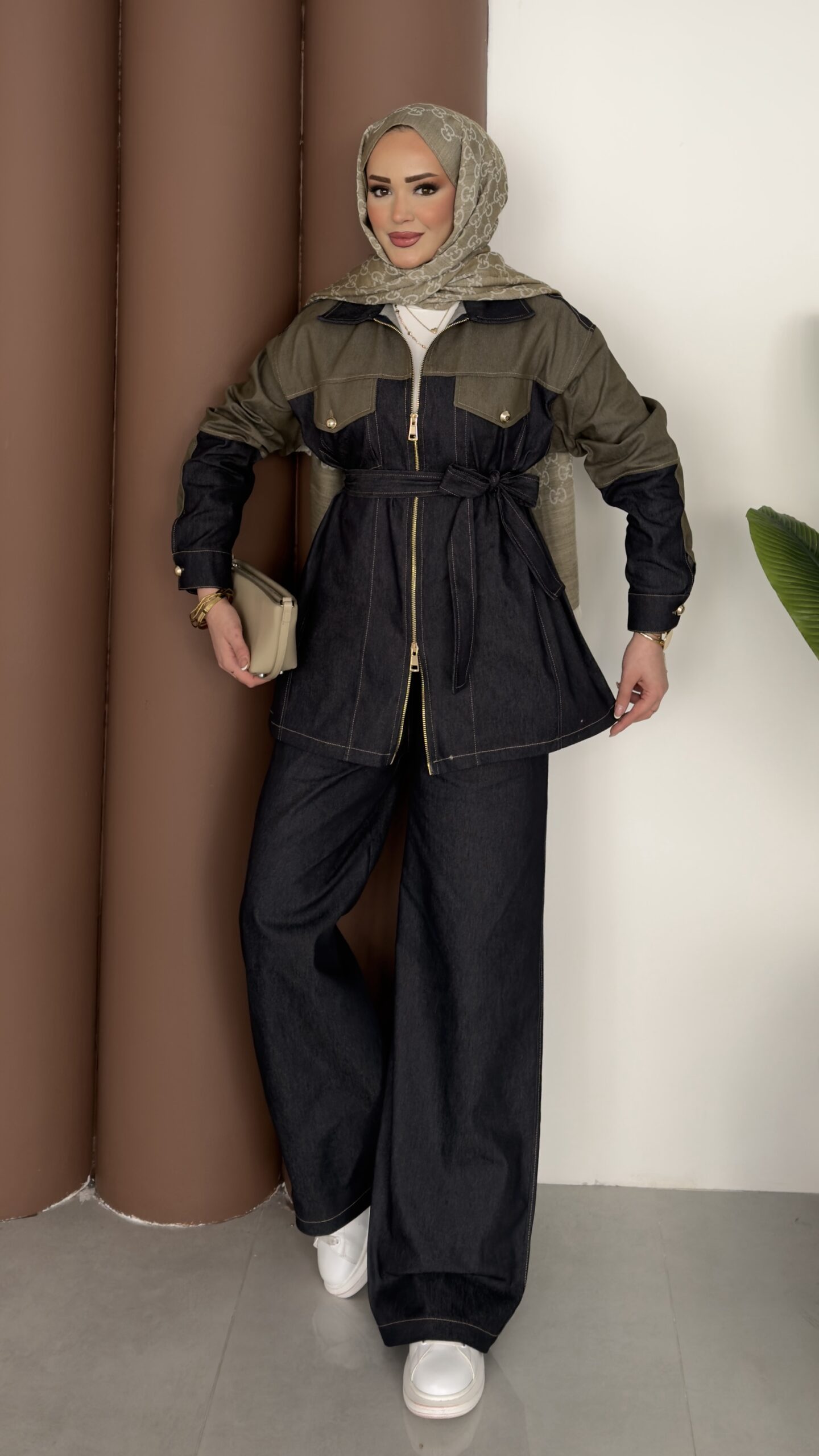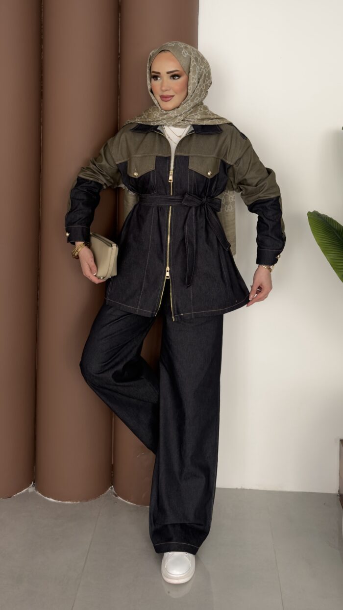 Dark Çift Fermuarlı Denim İkili Takım – Haki