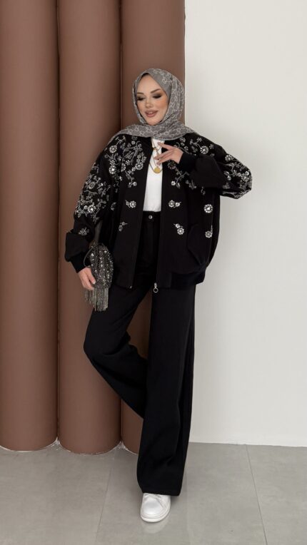 Marka Muadili Gabardin Bomber Ceket İkili Takım – Siyah