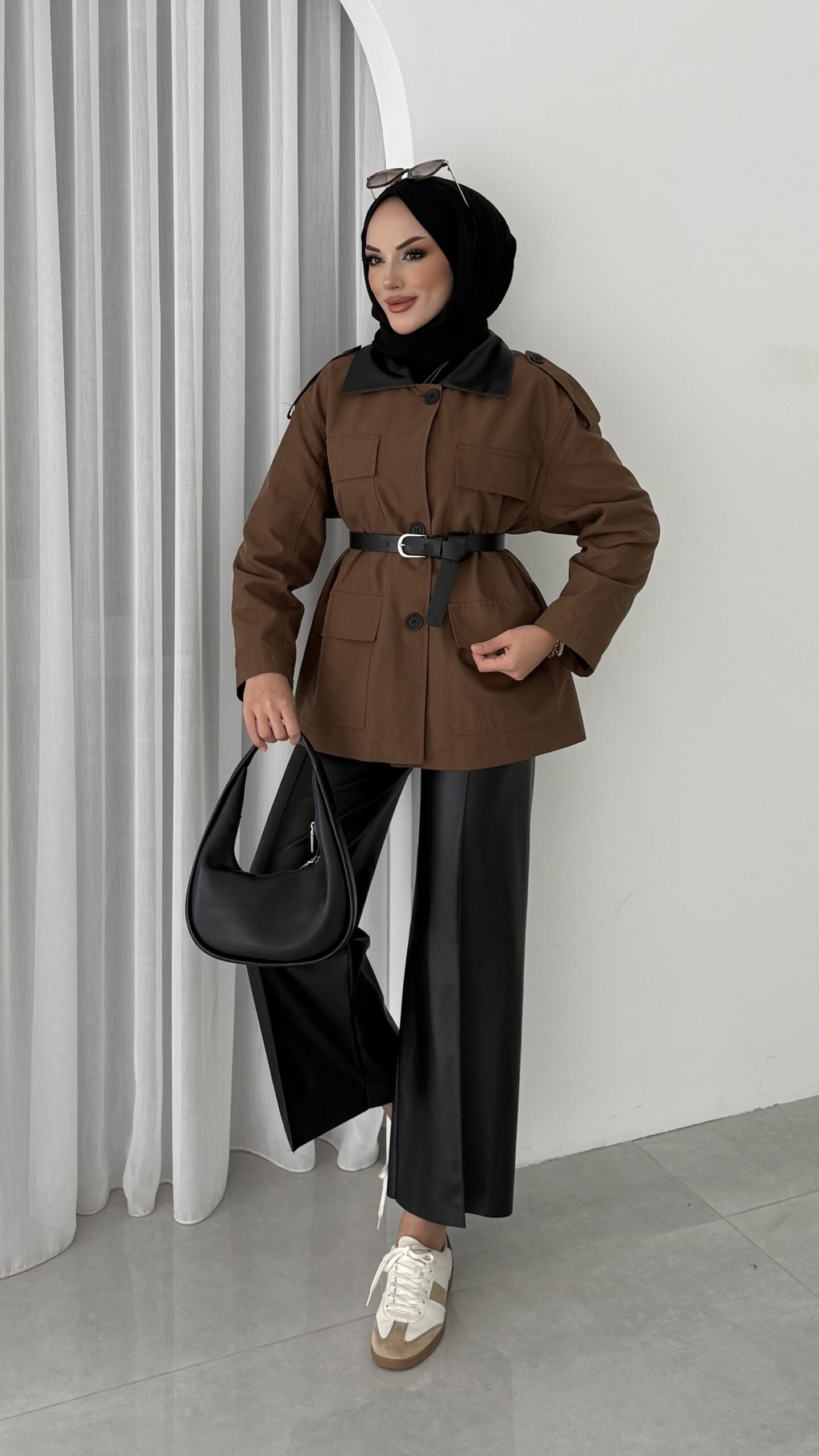 Deri Yakalı Muadil Kemerli Trenç – Kahverengi