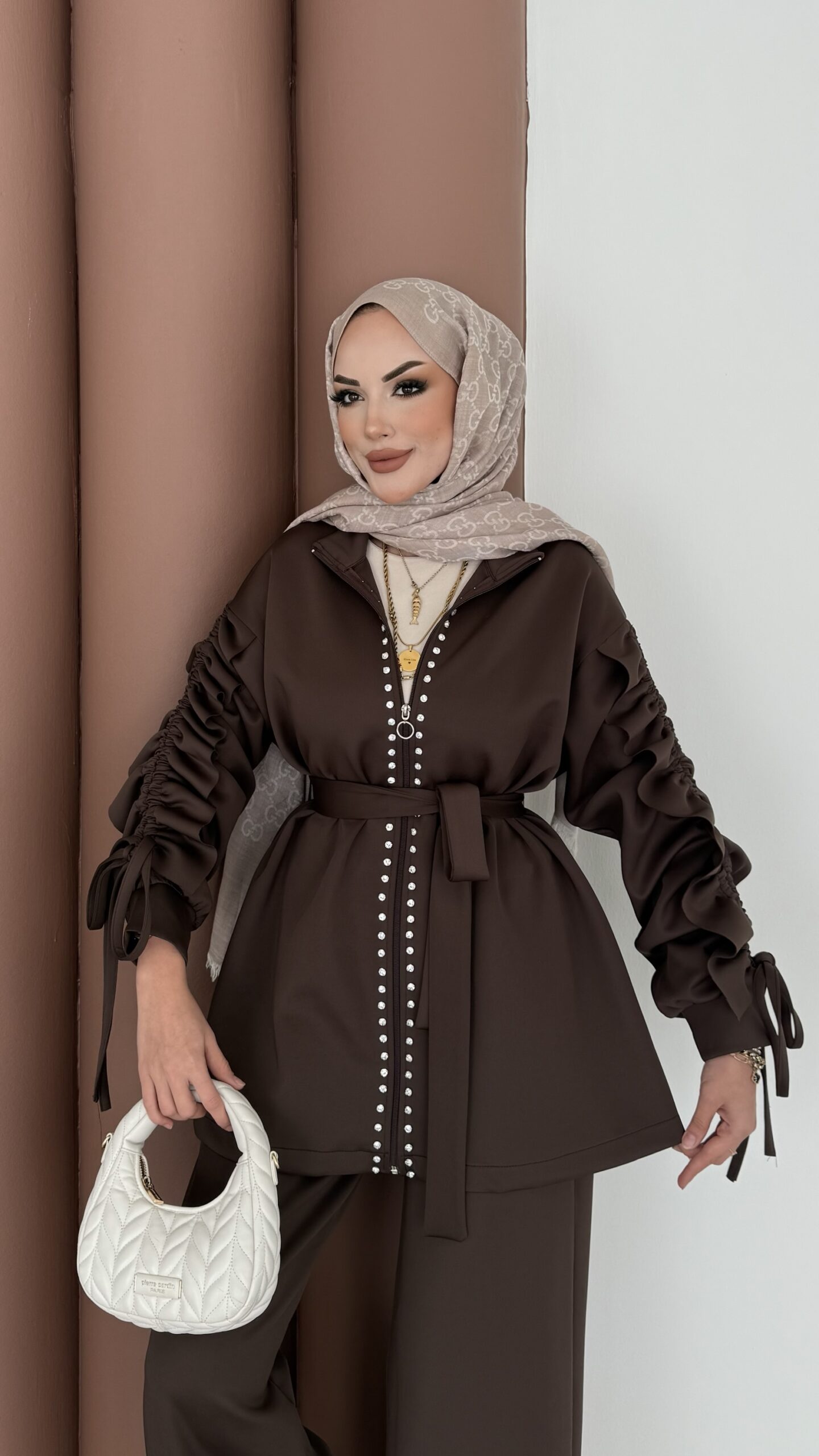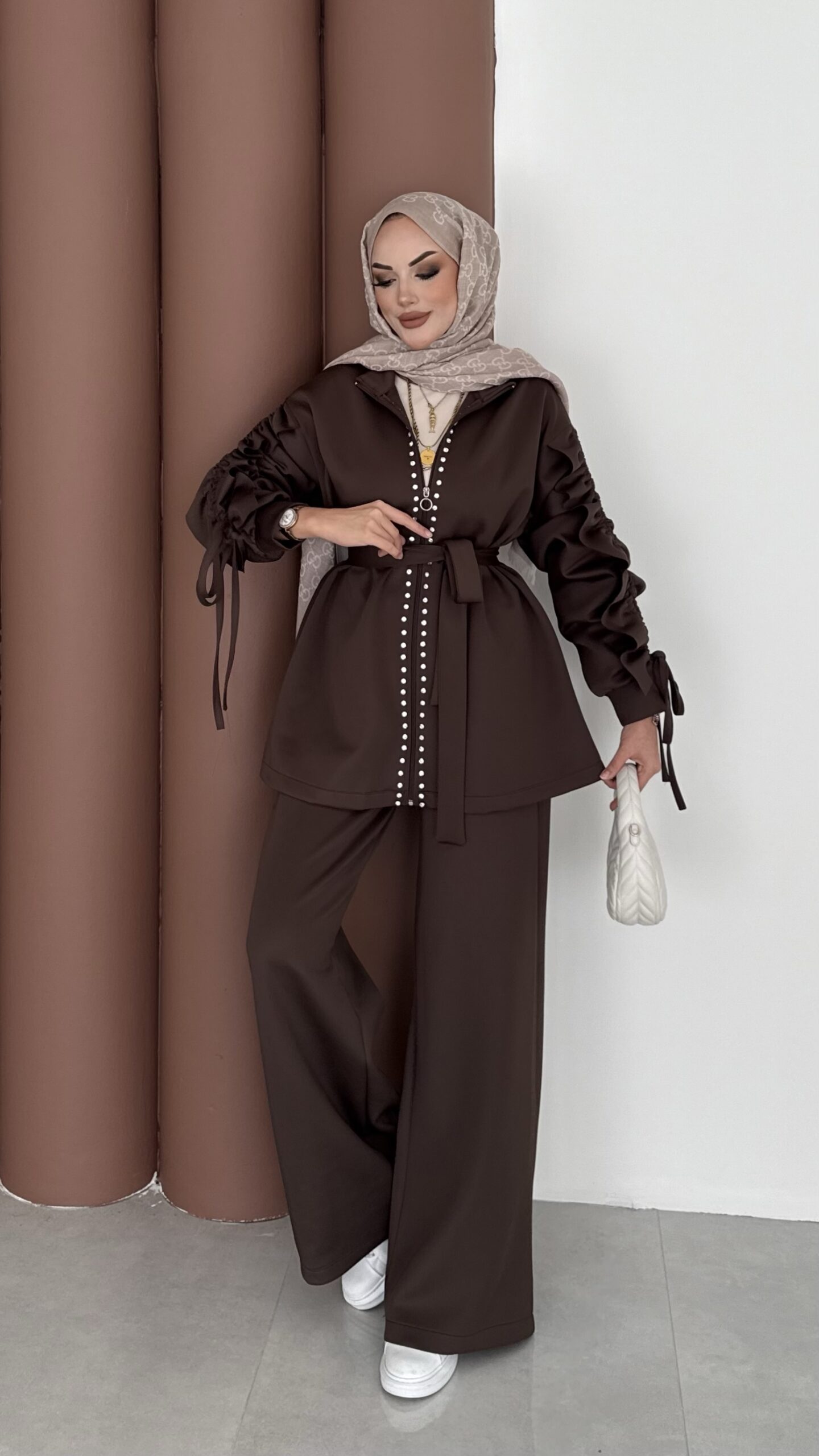Diamond Taşlı Büzgülü Scuba İkili Takım – Kahverengi