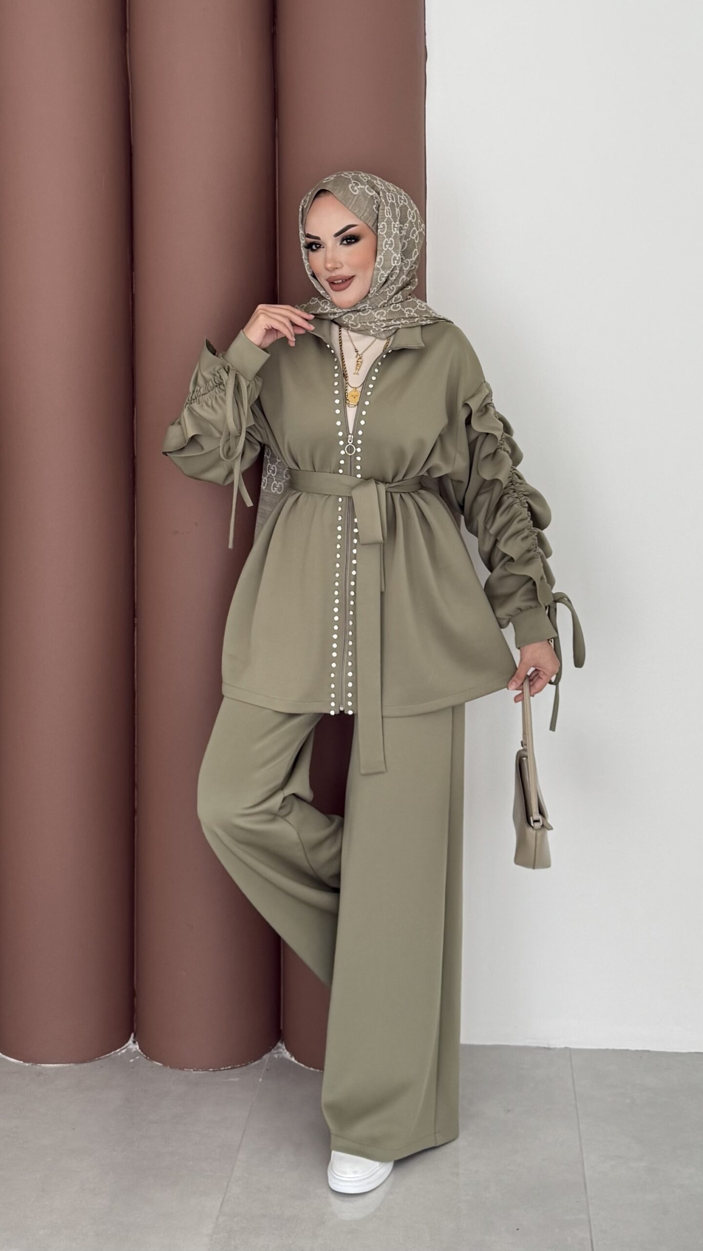 Diamond Taşlı Büzgülü Scuba İkili Takım – Yağ Yeşil