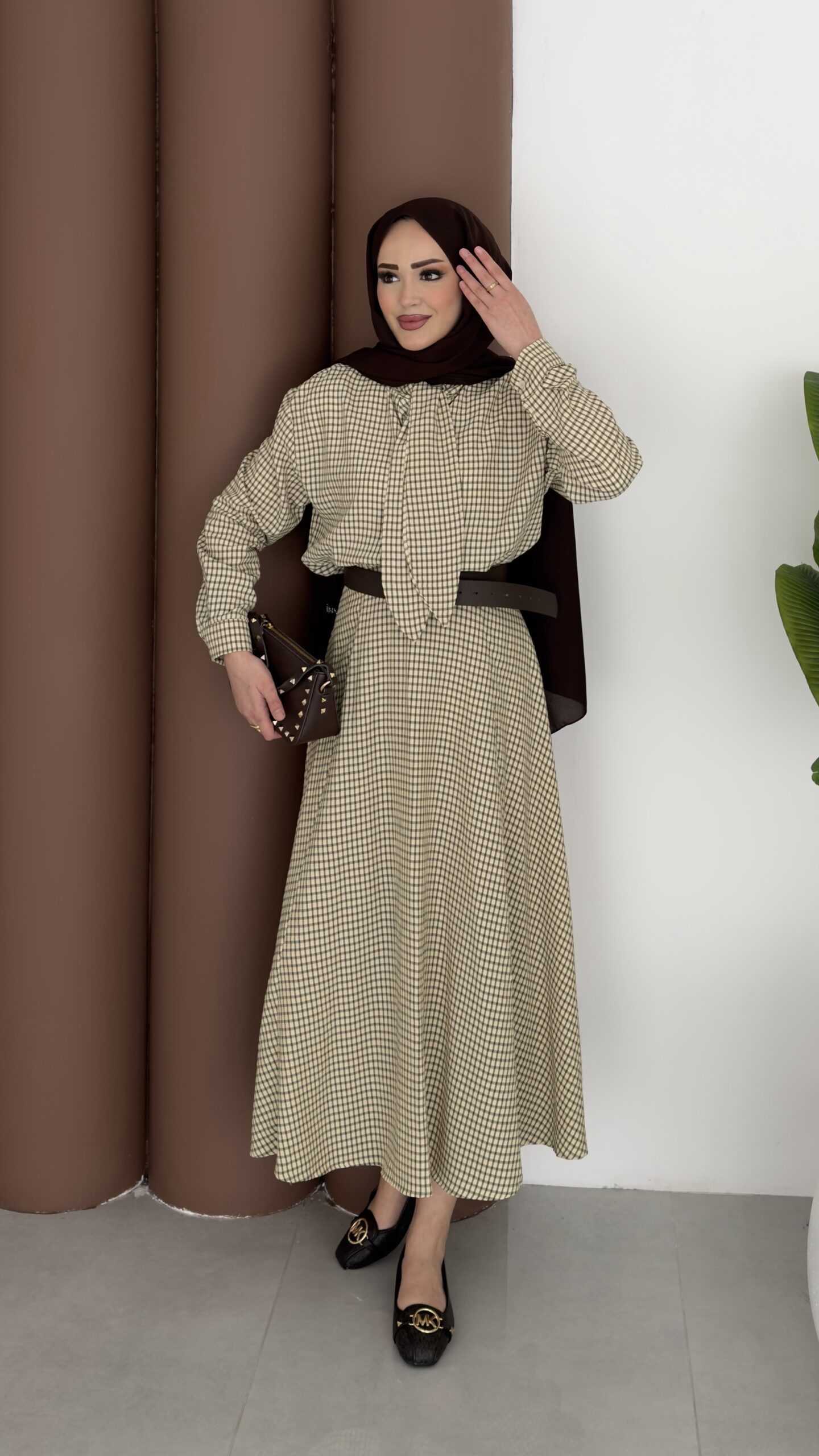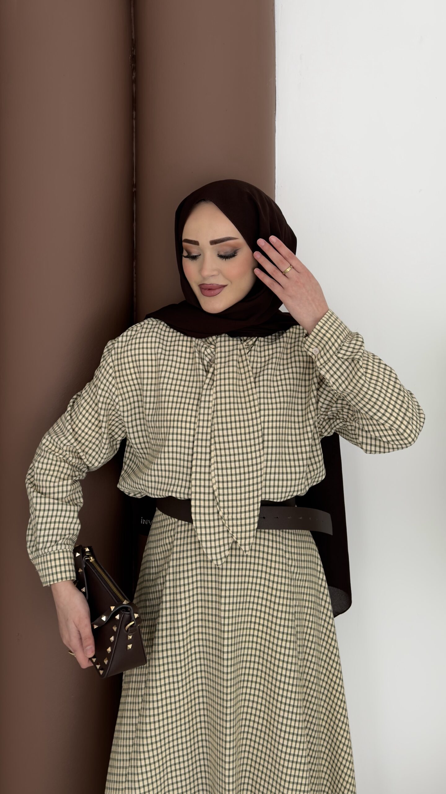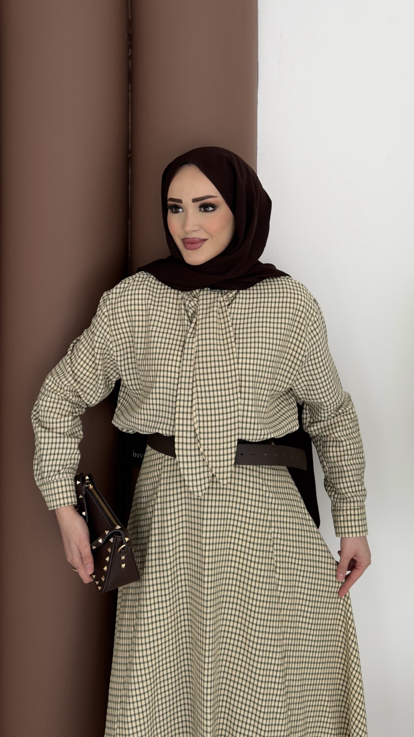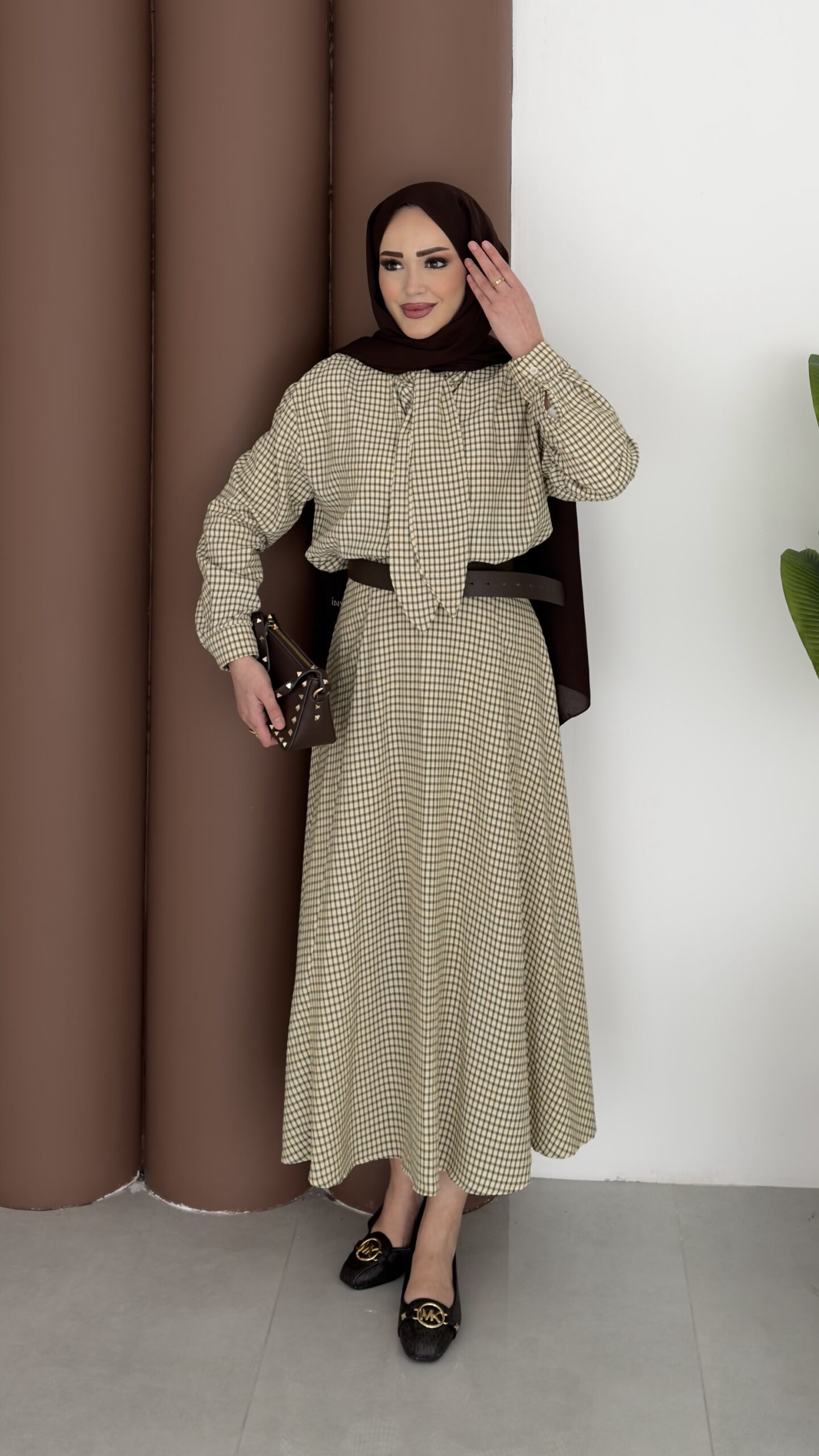 Ekose Çizgili Etek İkili Takım - Kahverengi