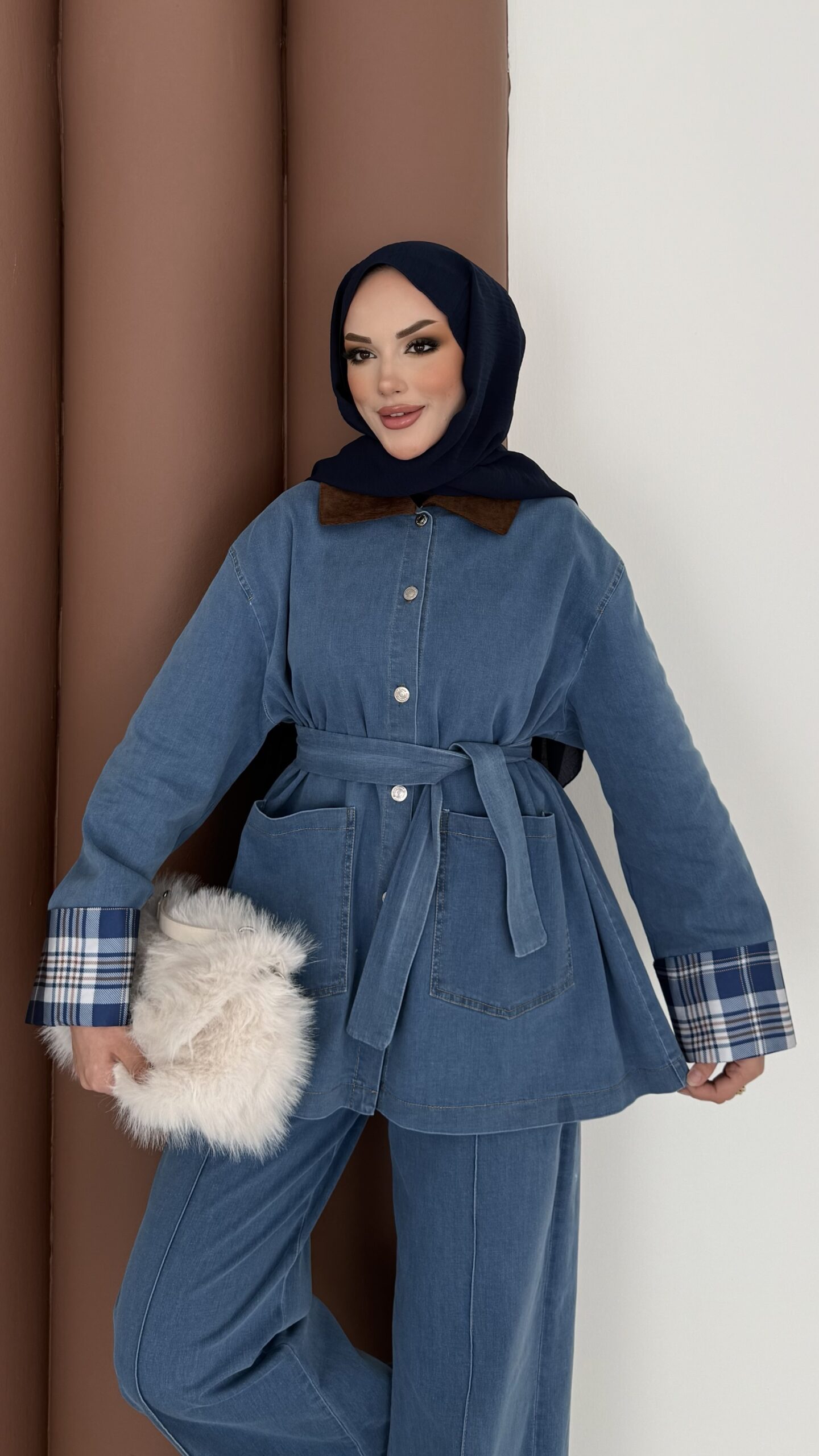 Ekose Desen Denim İkili Takım – Açık Mavi