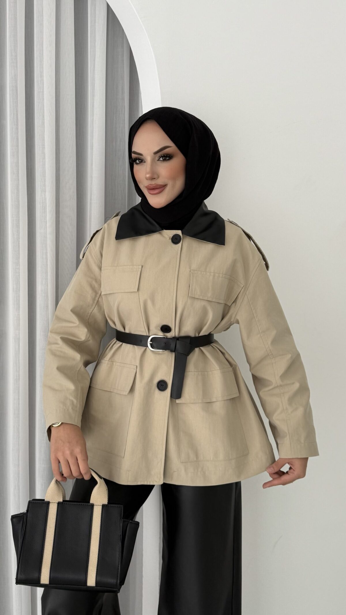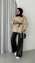 Deri Yakalı Muadil Kemerli Trenç – Bej