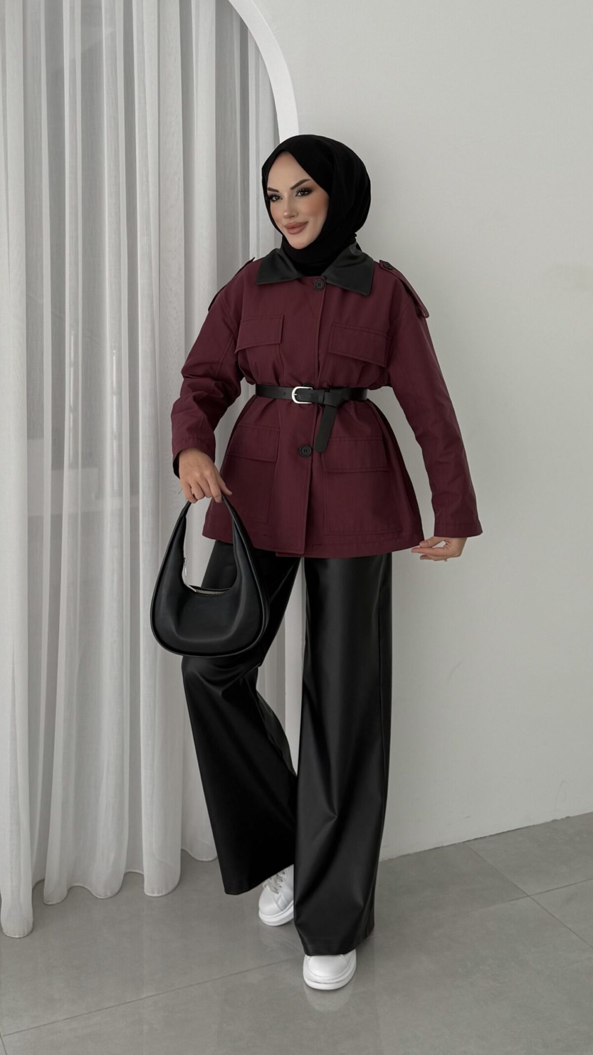 Deri Yakalı Muadil Kemerli Trenç – Bordo