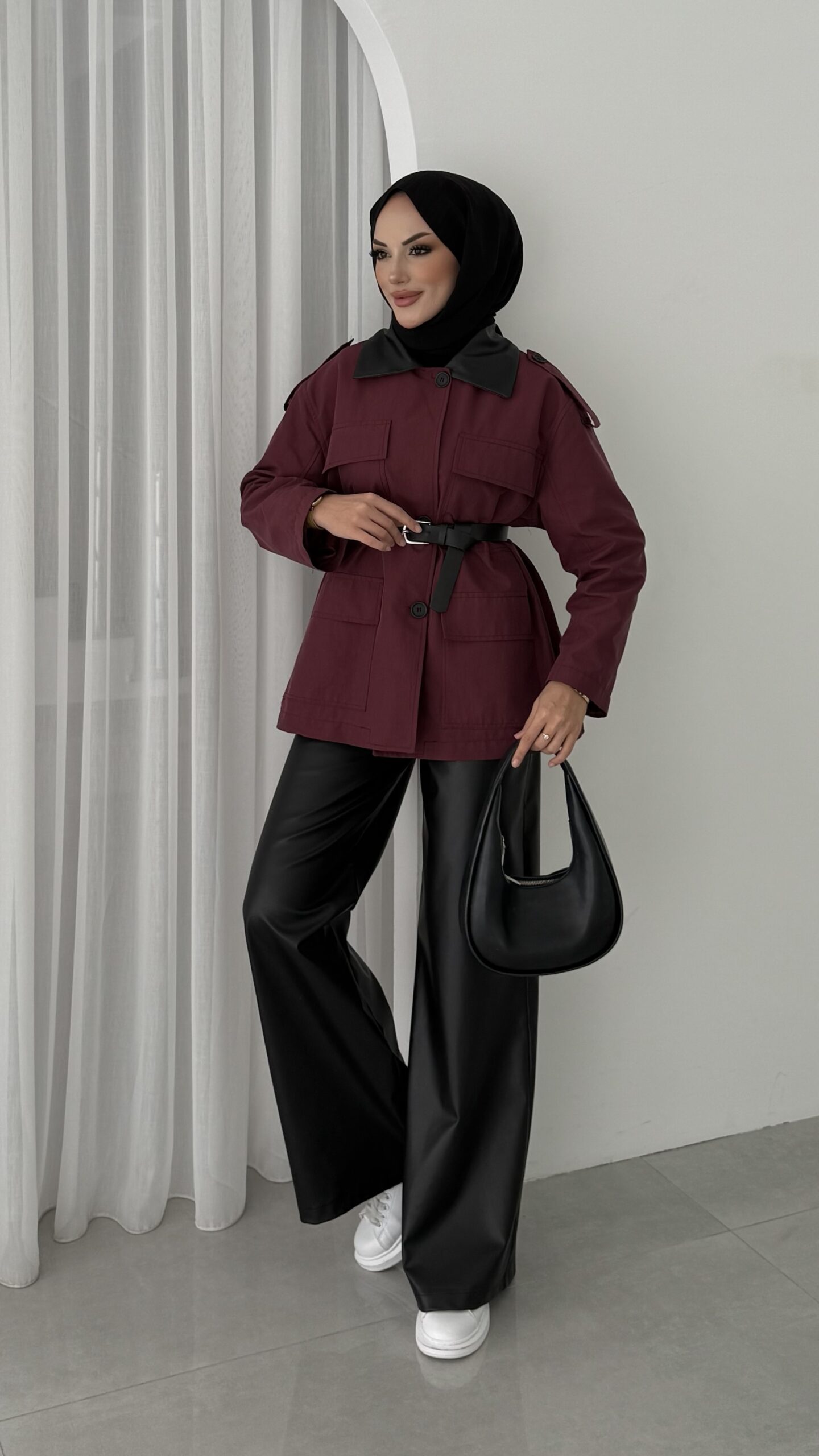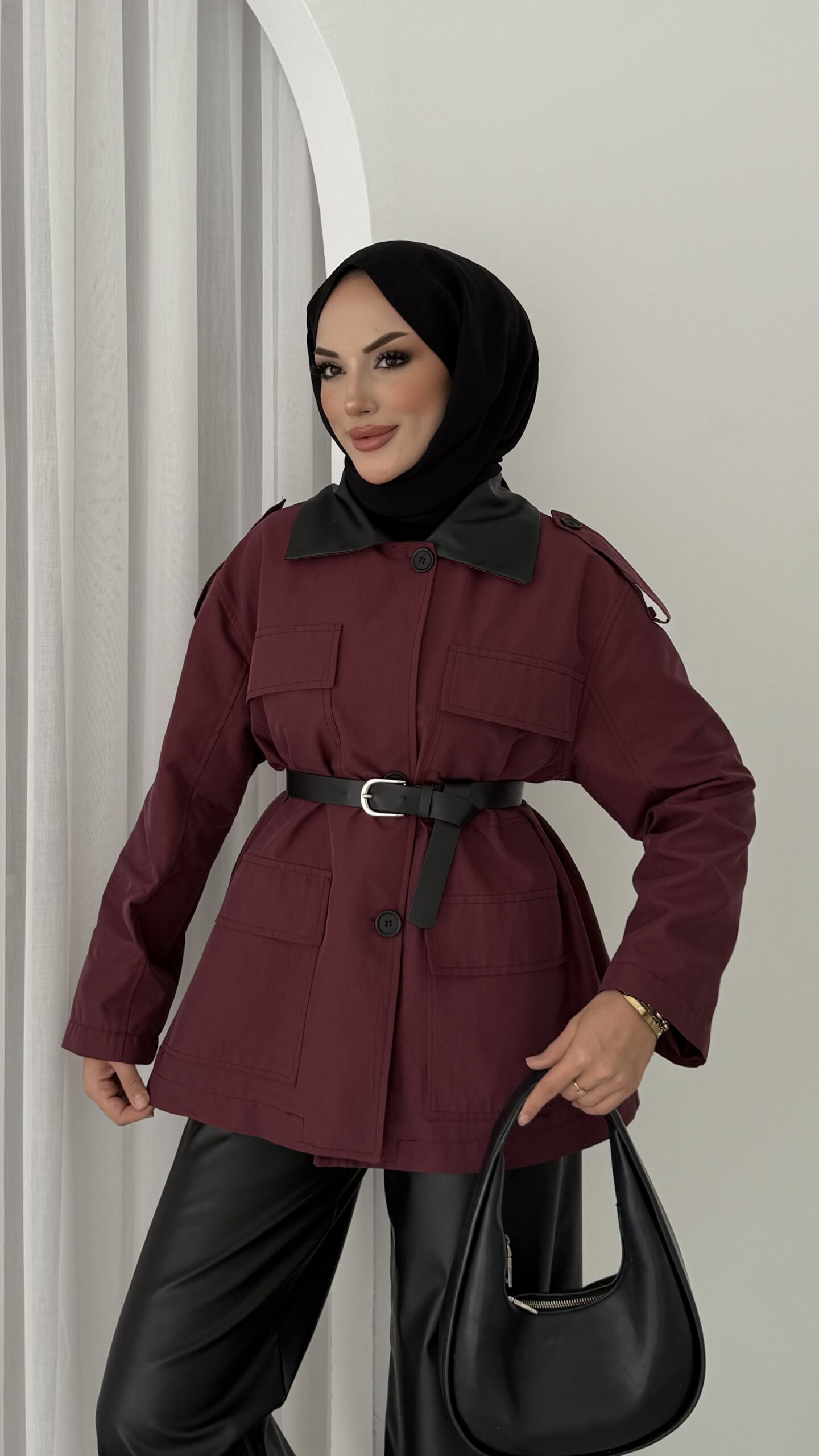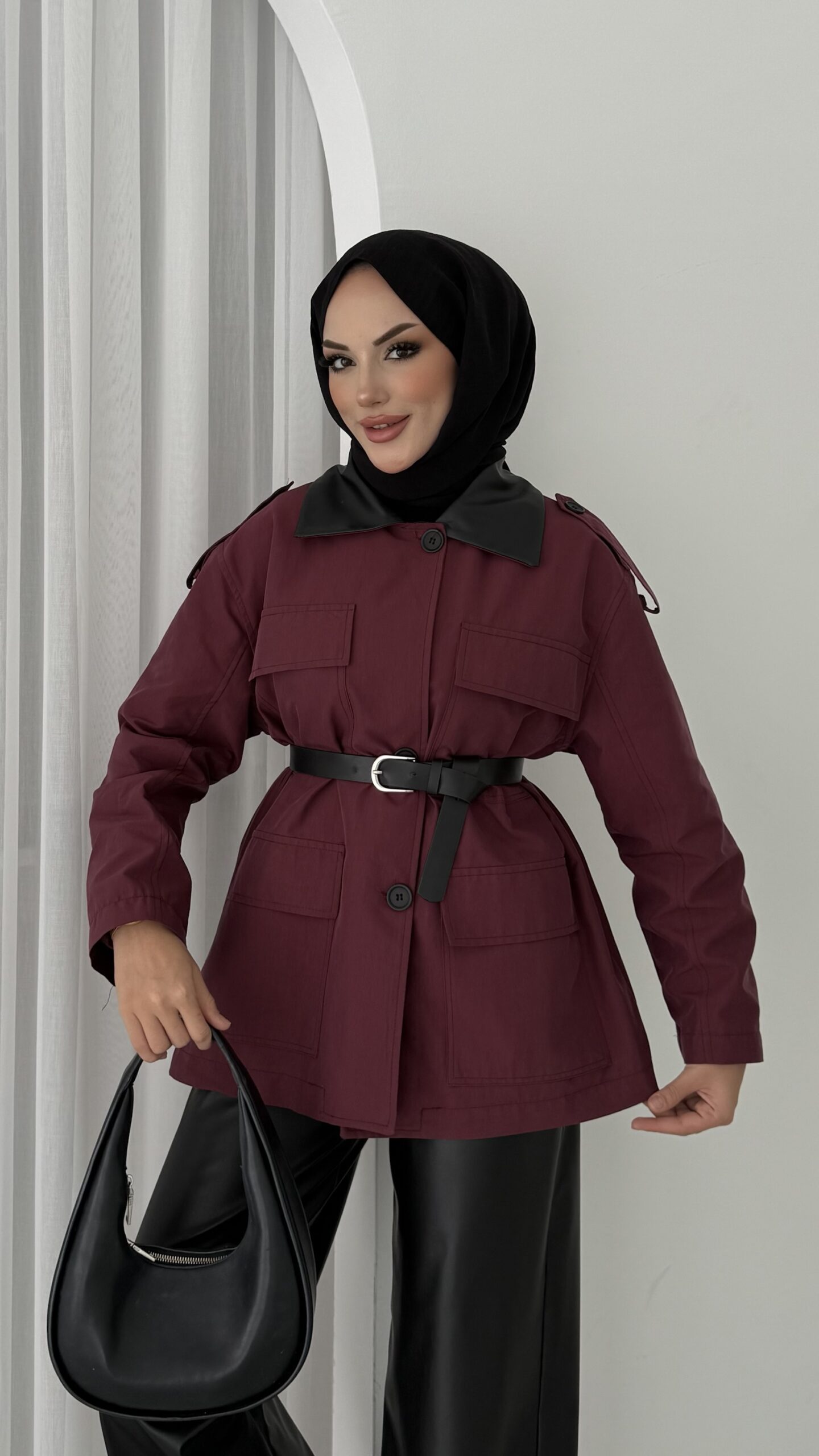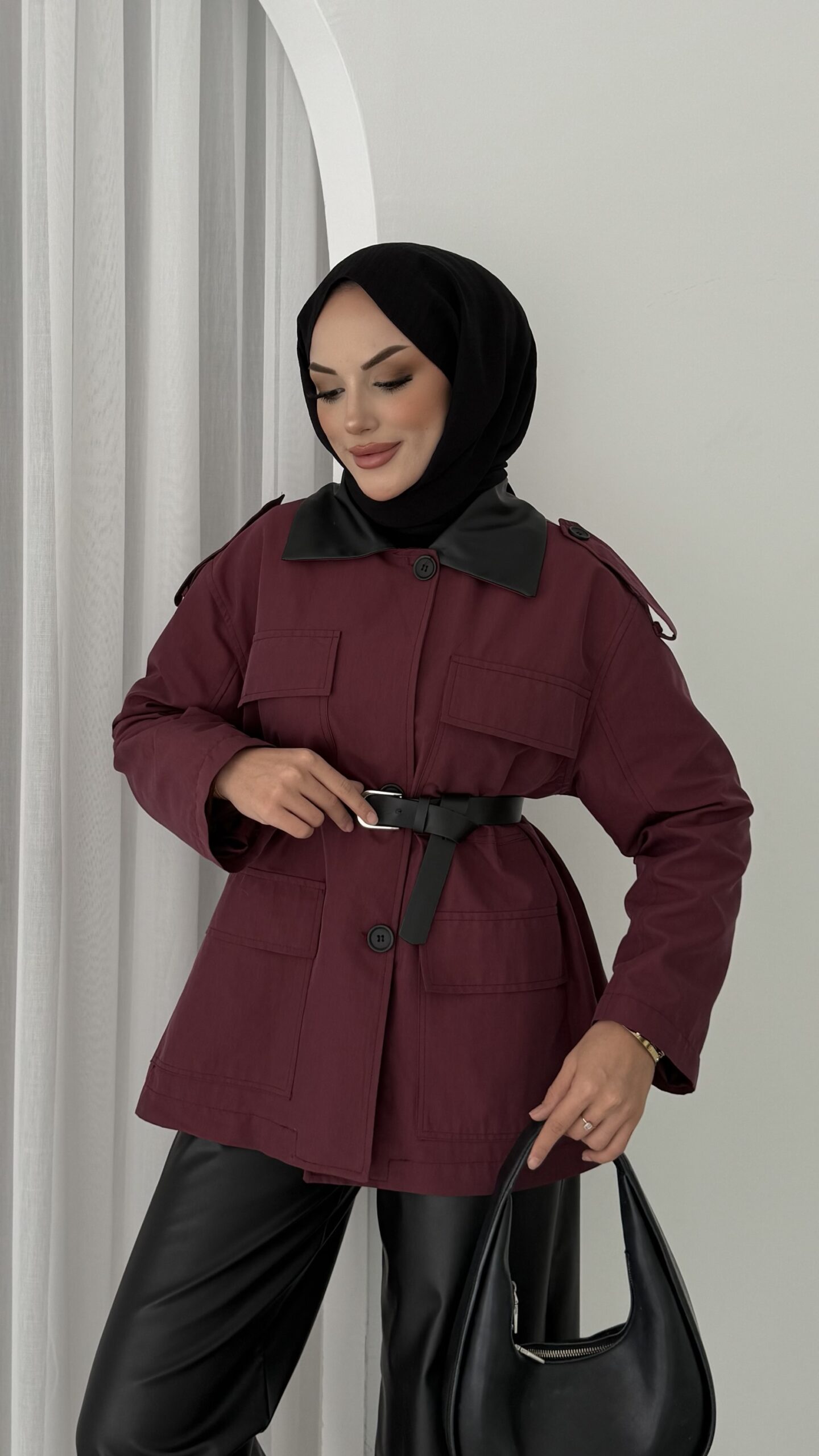 Deri Yakalı Muadil Kemerli Trenç – Bordo