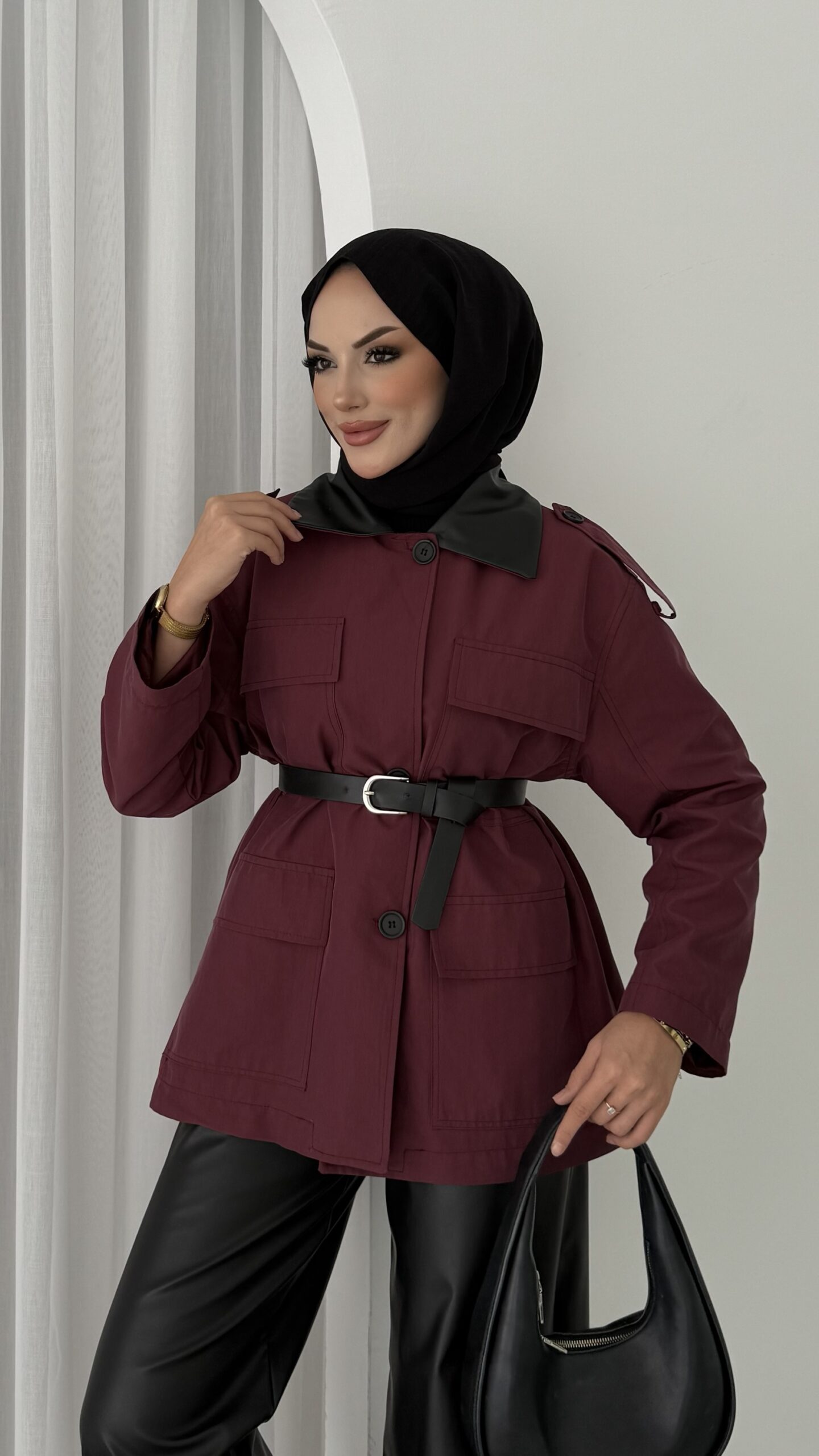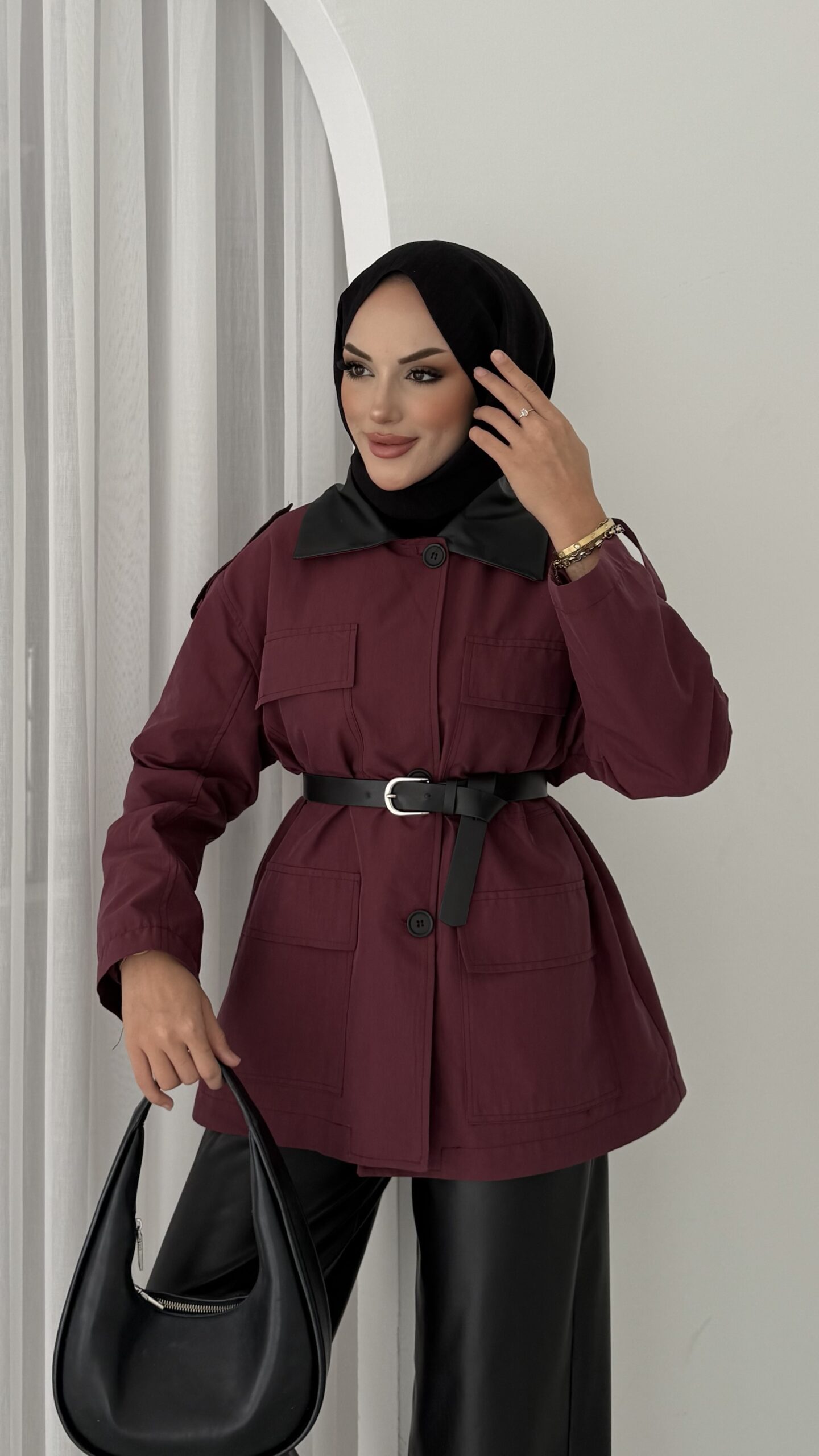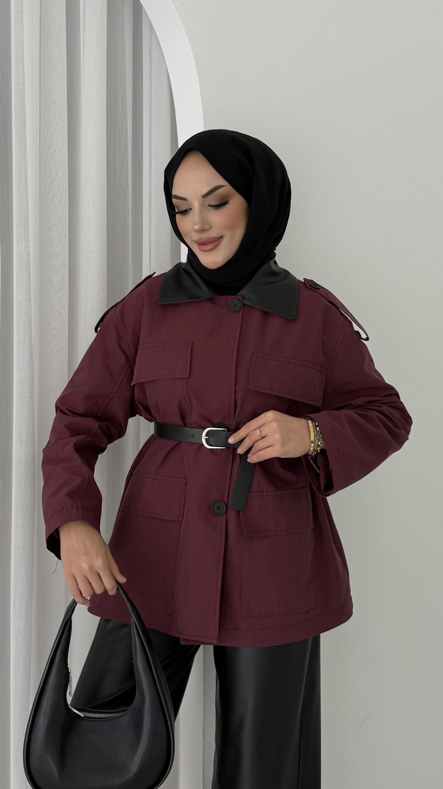 Deri Yakalı Muadil Kemerli Trenç – Bordo