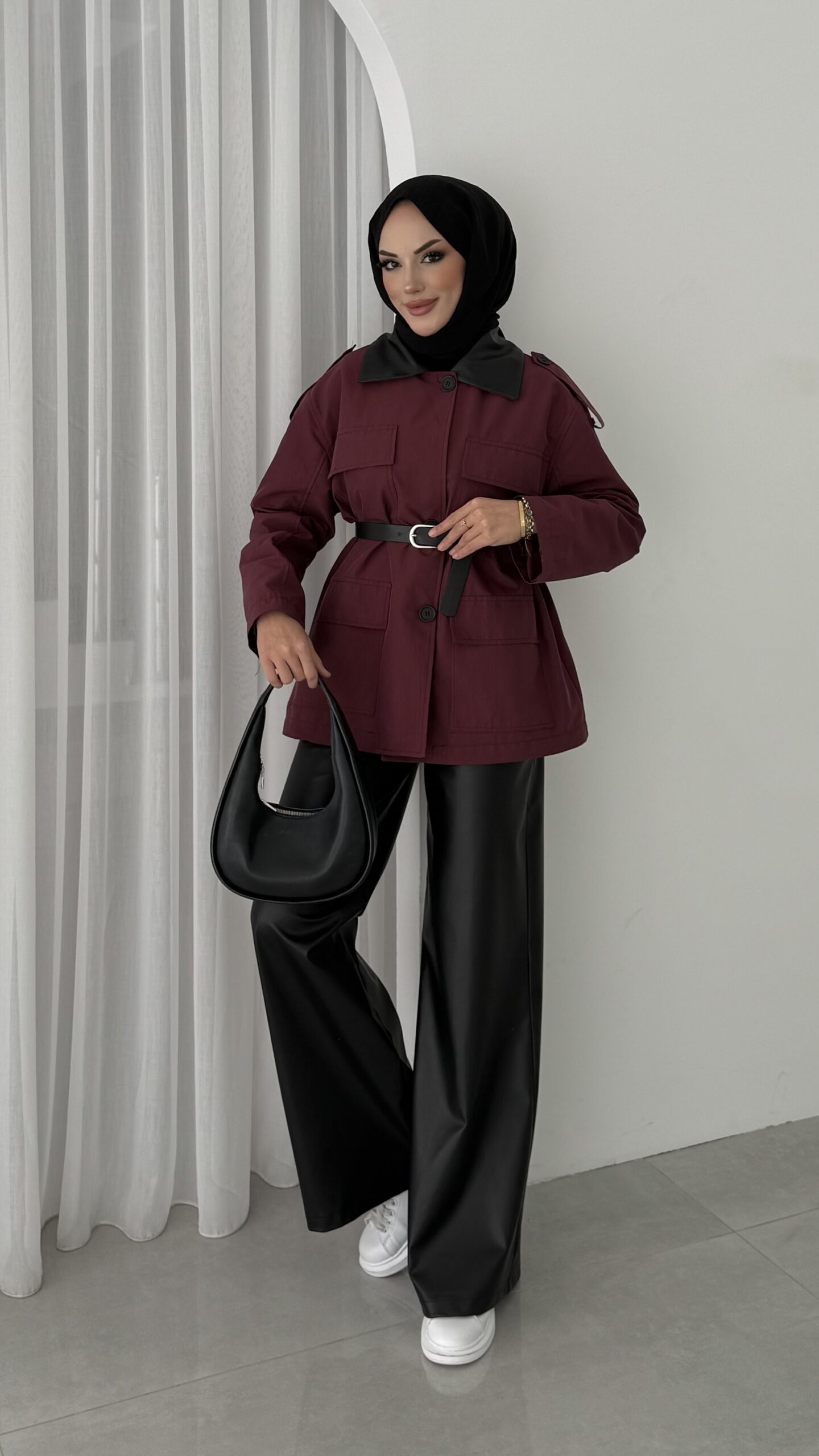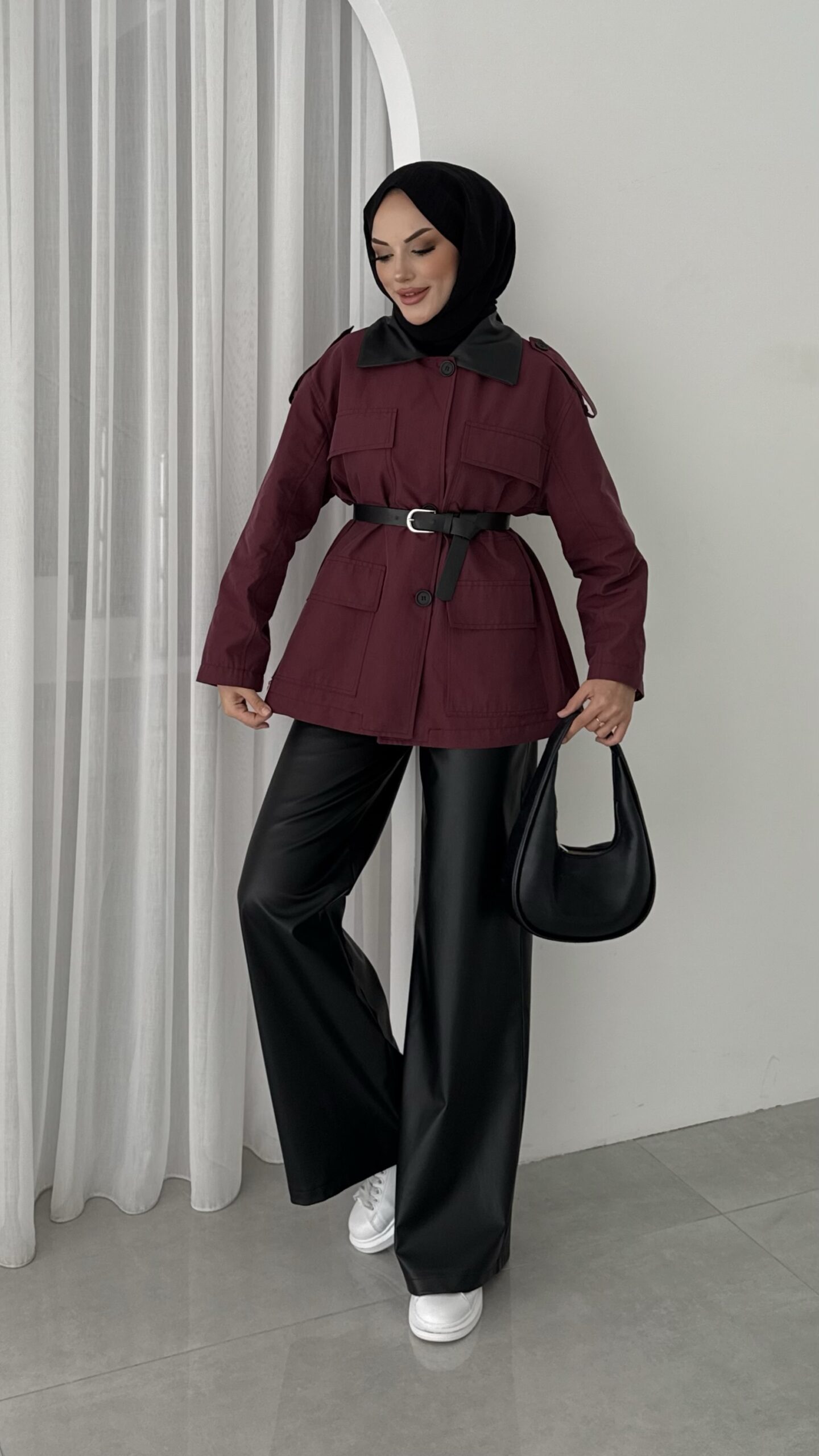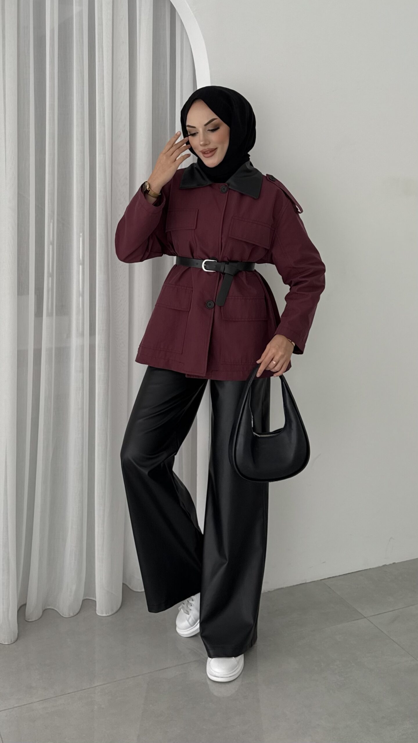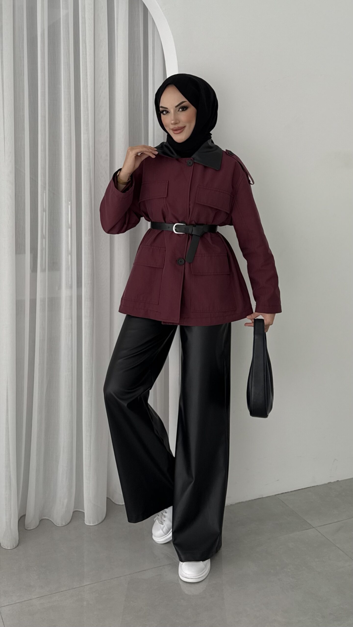 Deri Yakalı Muadil Kemerli Trenç – Bordo