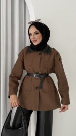 Deri Yakalı Muadil Kemerli Trenç – Kahverengi