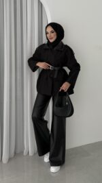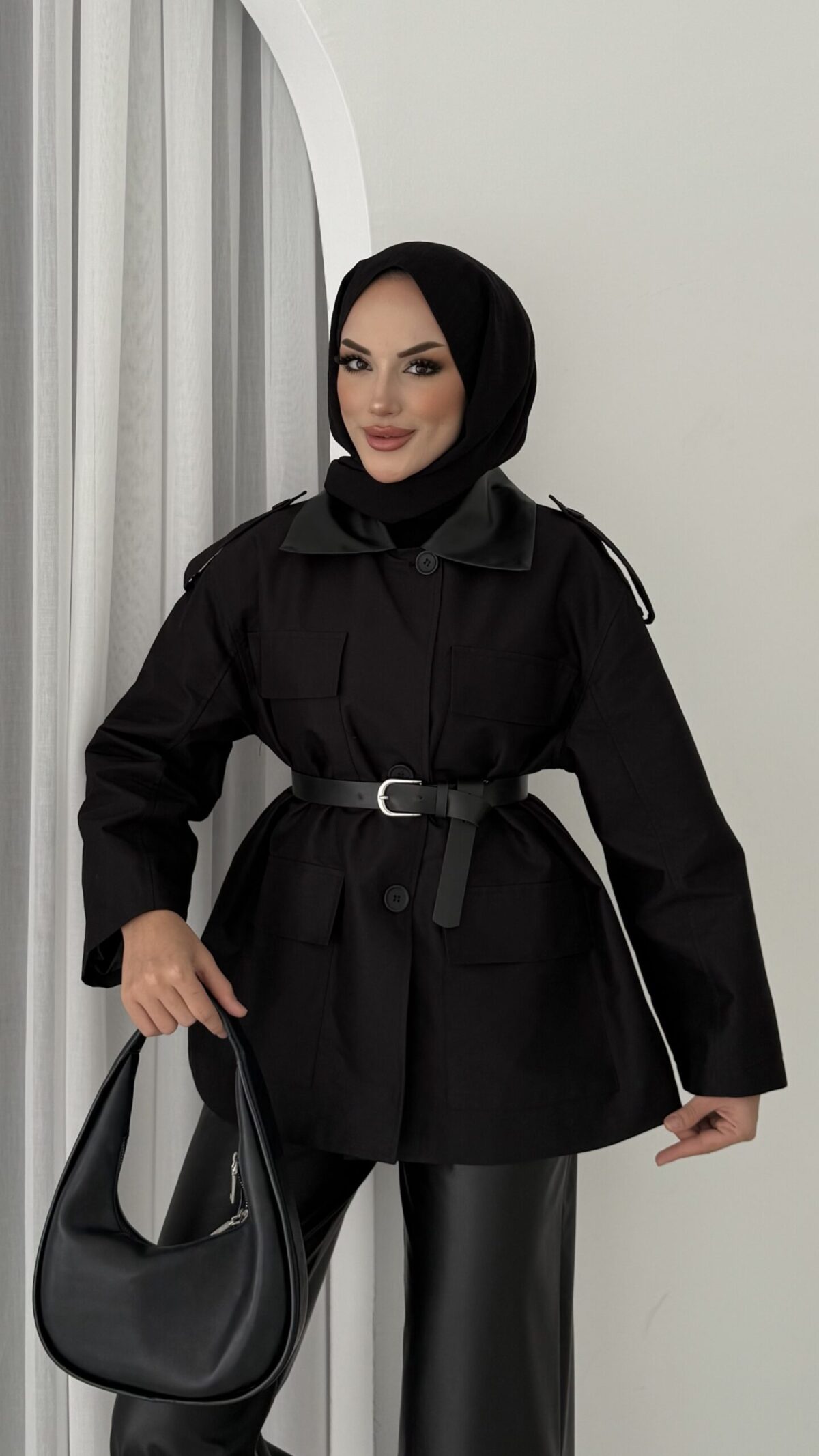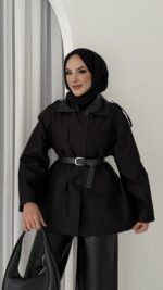 Deri Yakalı Muadil Kemerli Trenç – Siyah