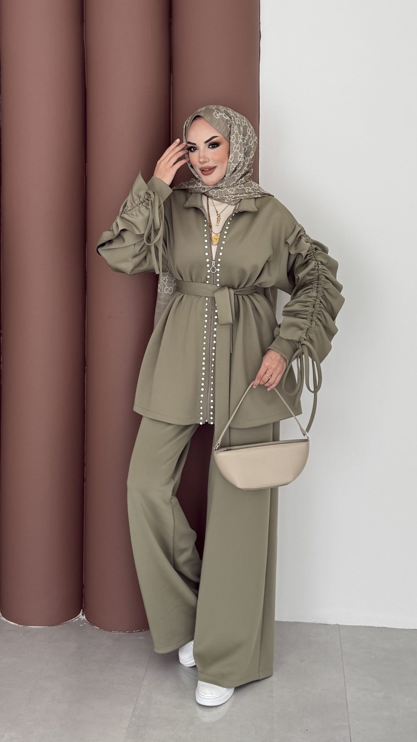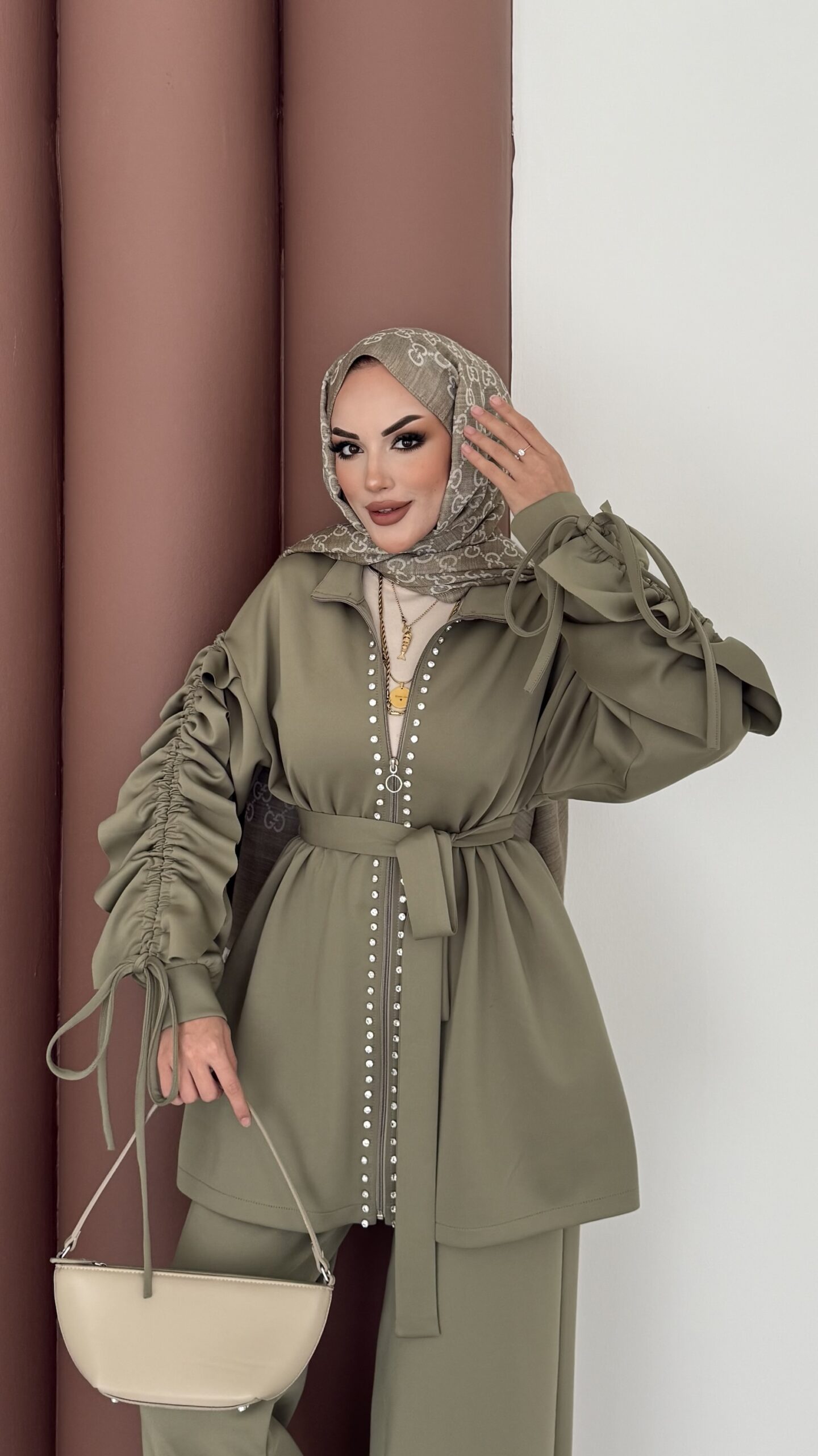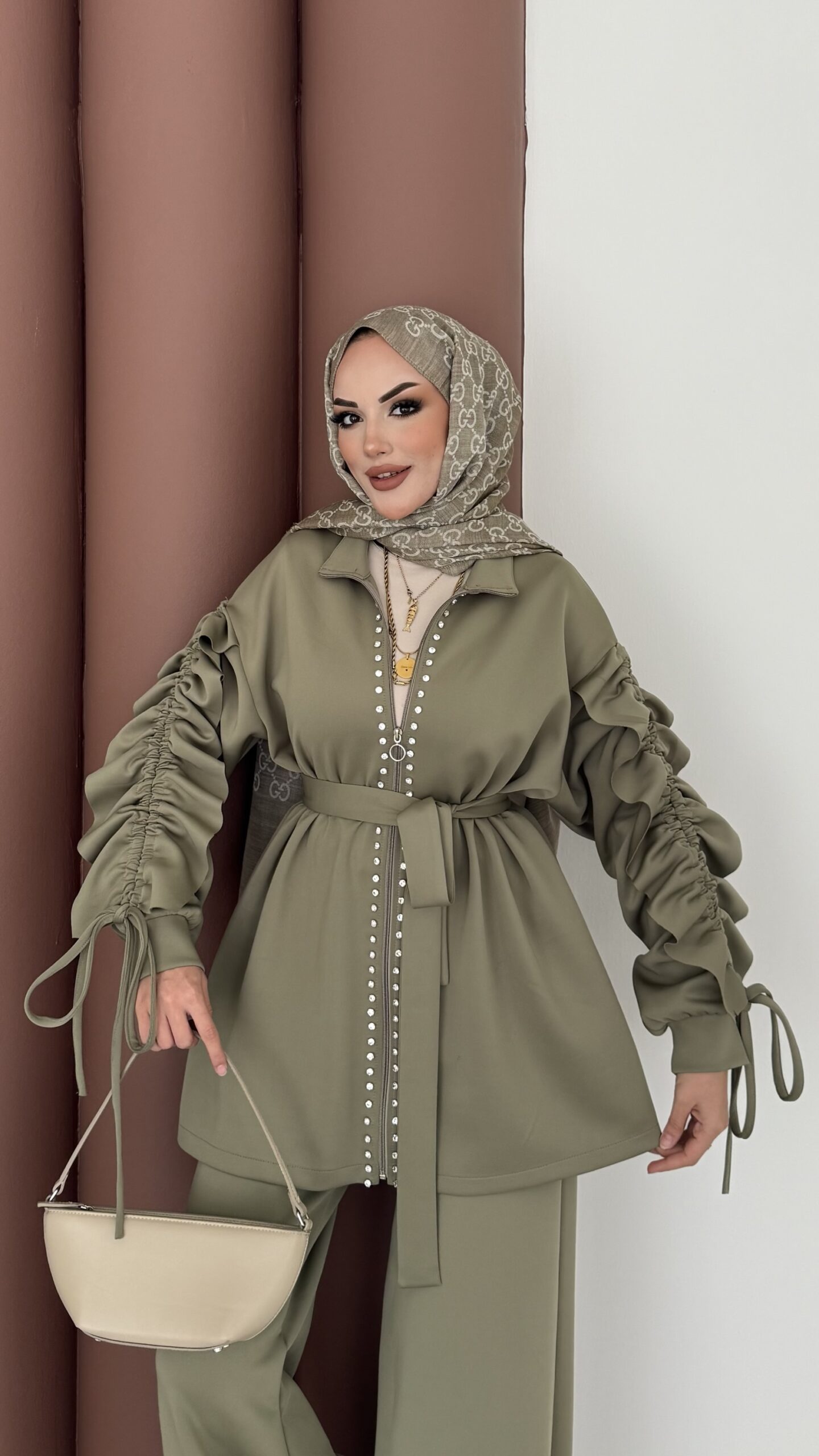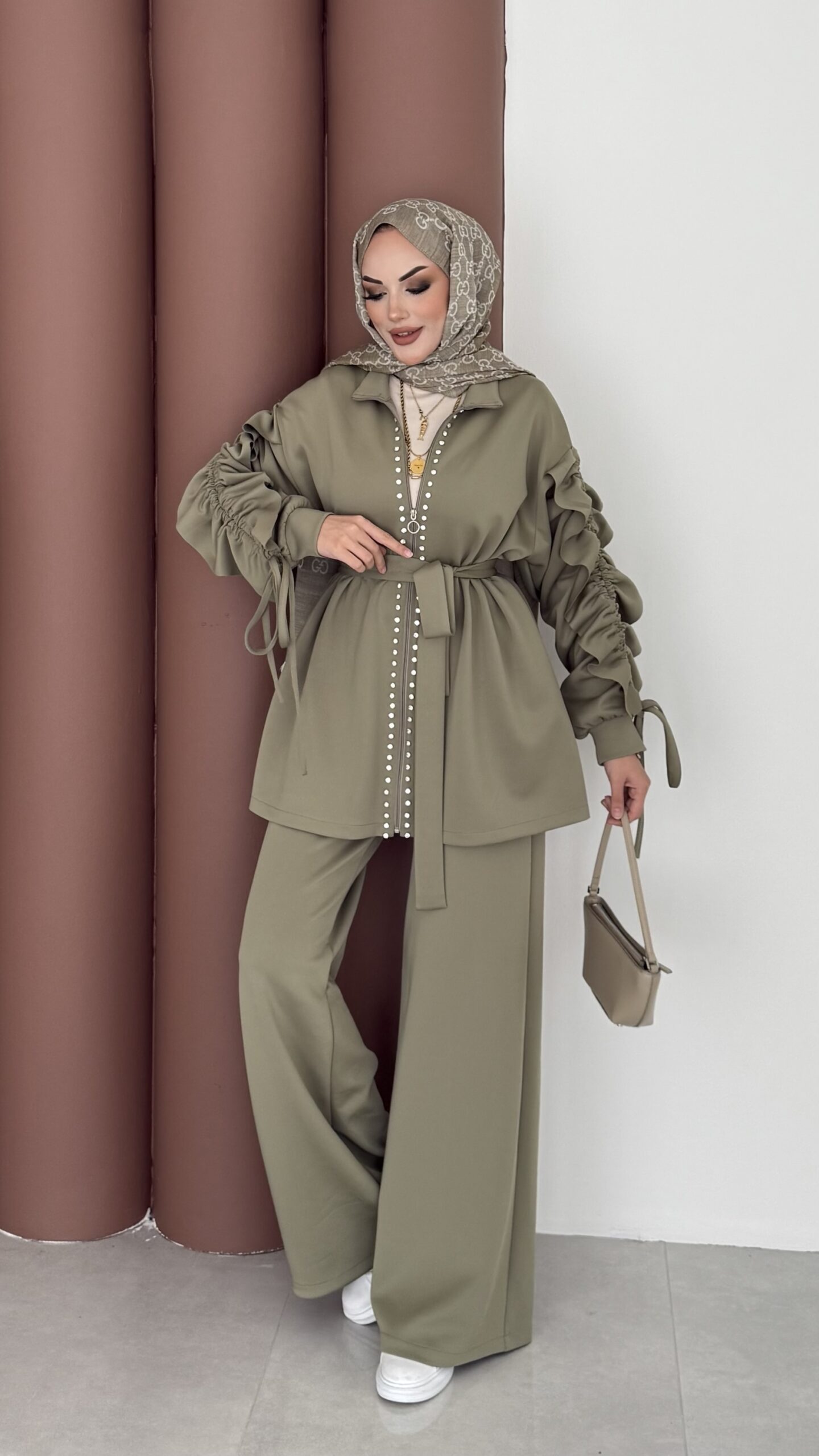 Diamond Taşlı Büzgülü Scuba İkili Takım – Yağ Yeşil