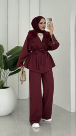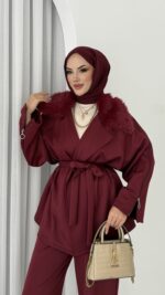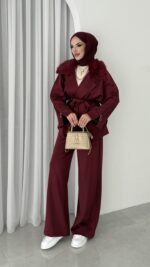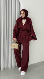 Elegant Kürklü Puf Scuba İkili Takım – Bordo