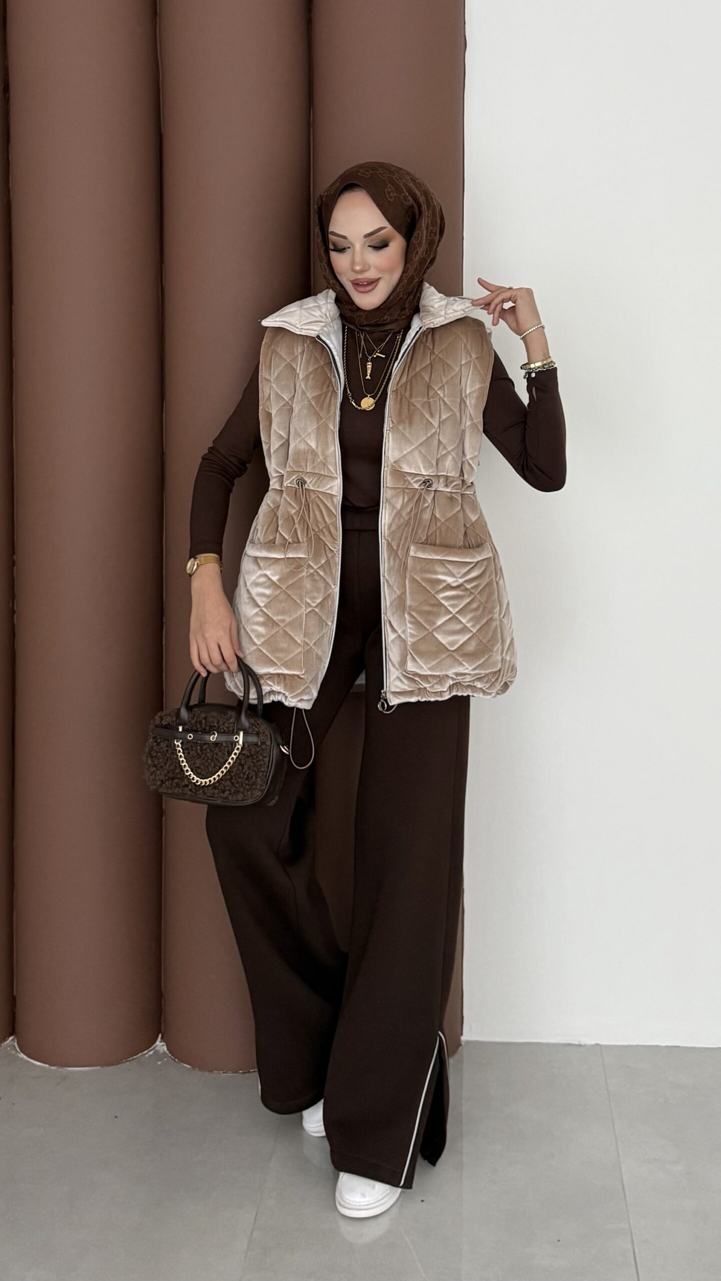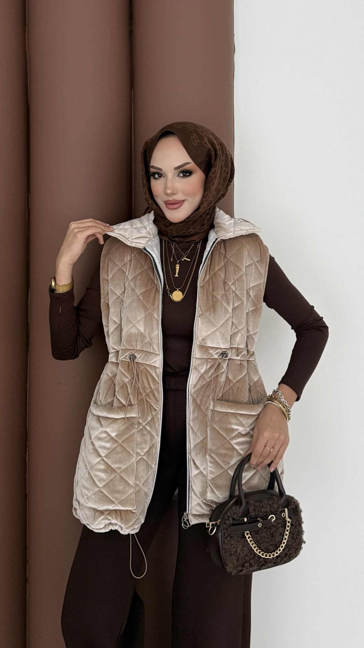 Kapitoneli Kadife Şişme Yelek – Bej