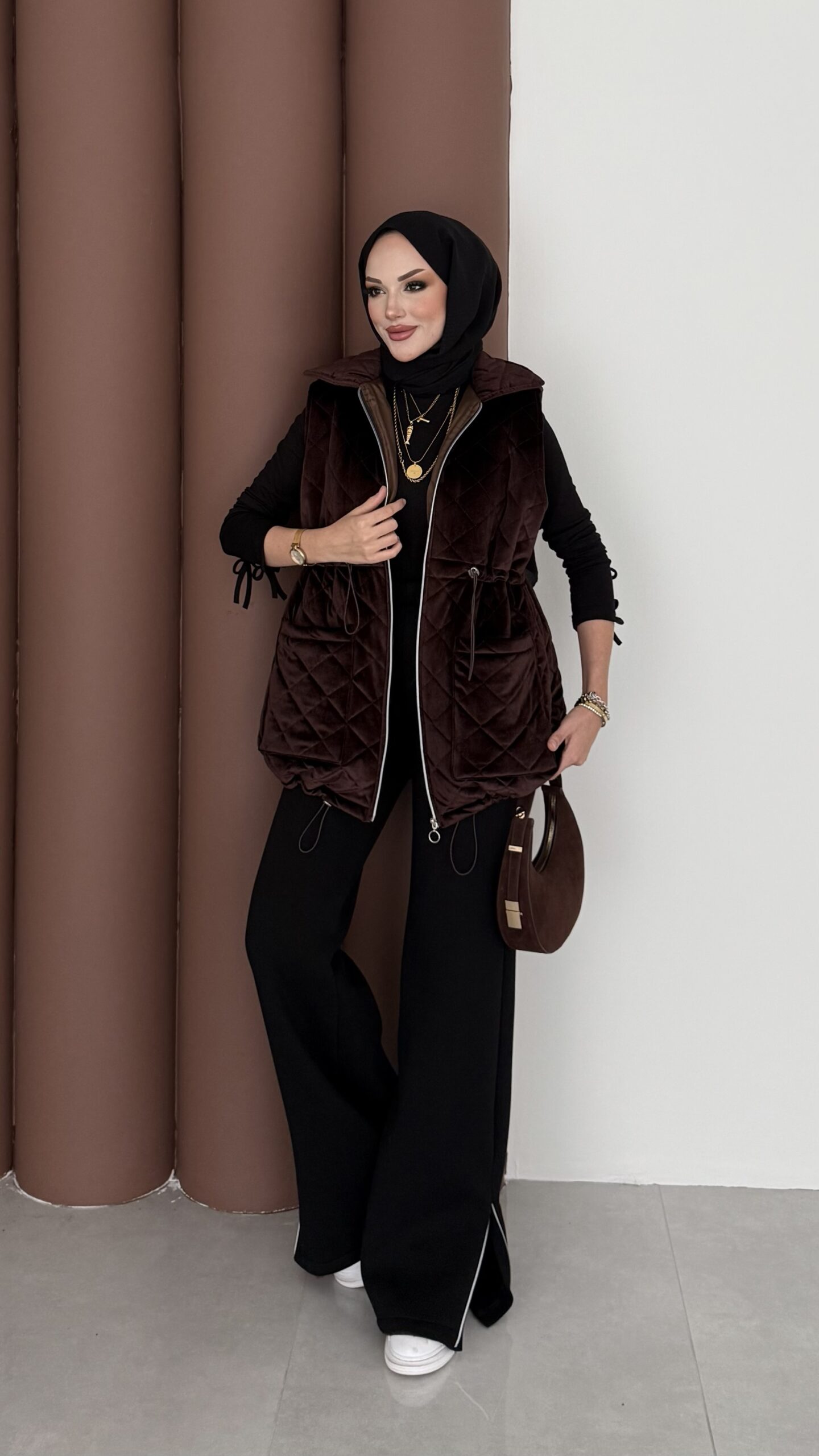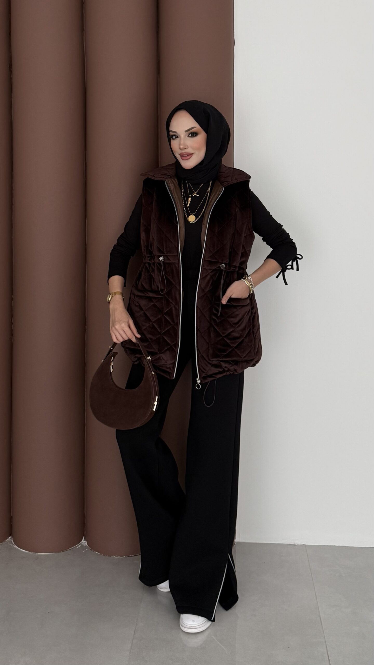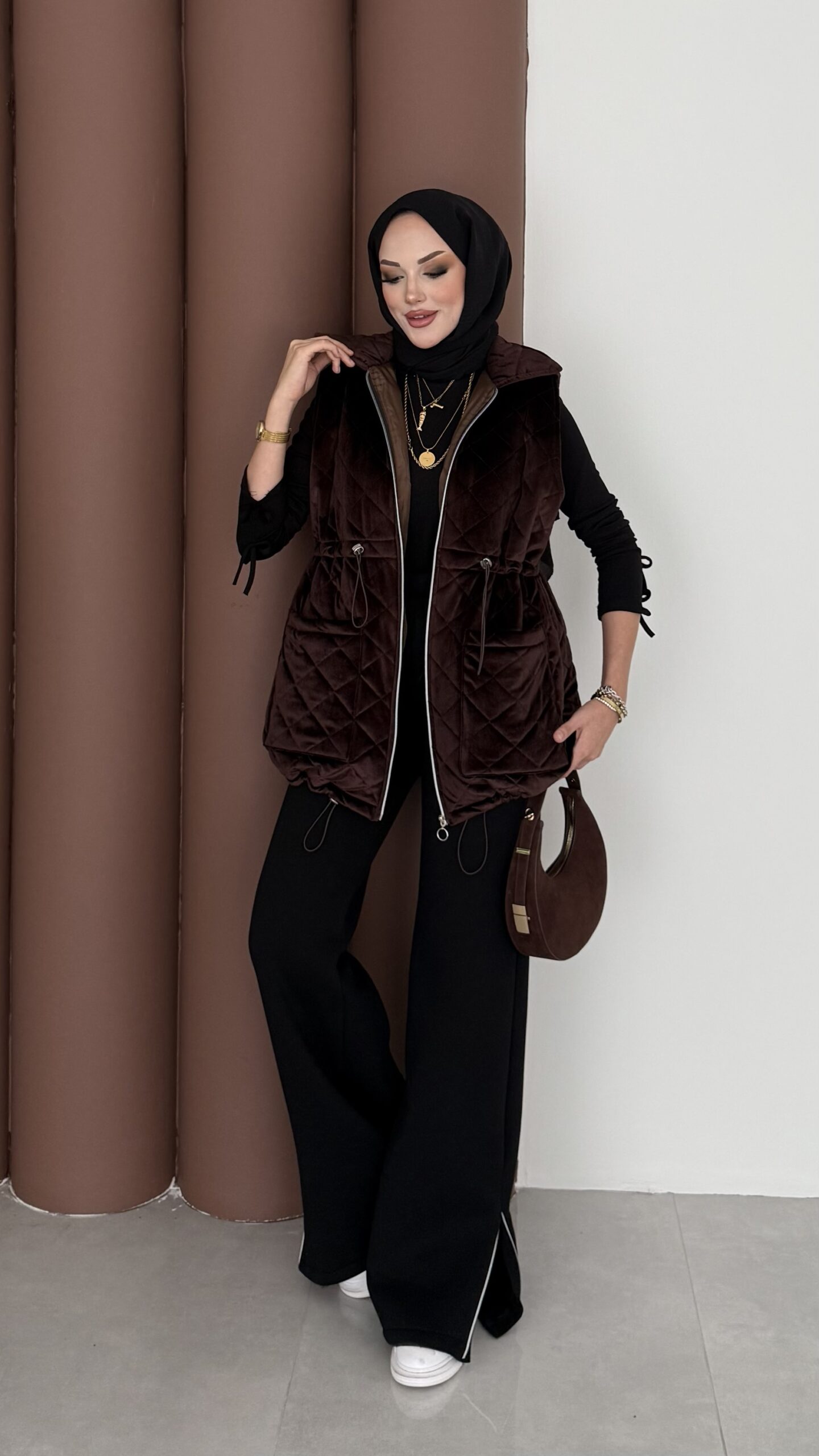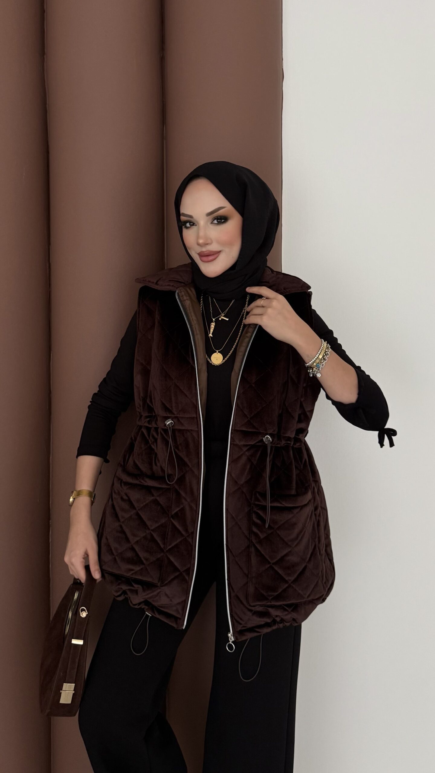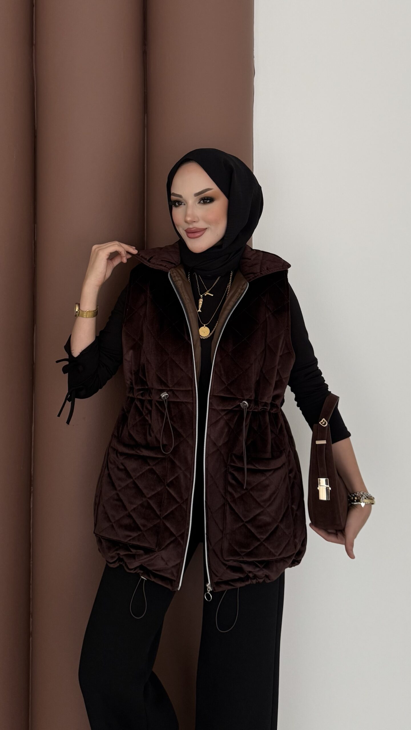 Kapitoneli Kadife Şişme Yelek – Kahverengi