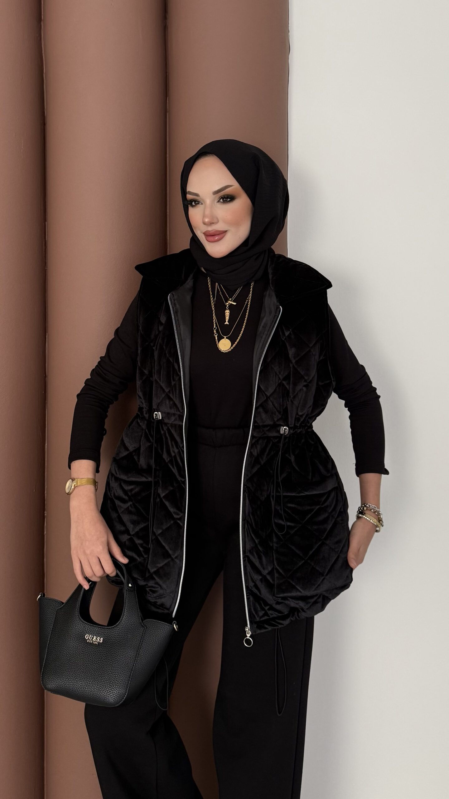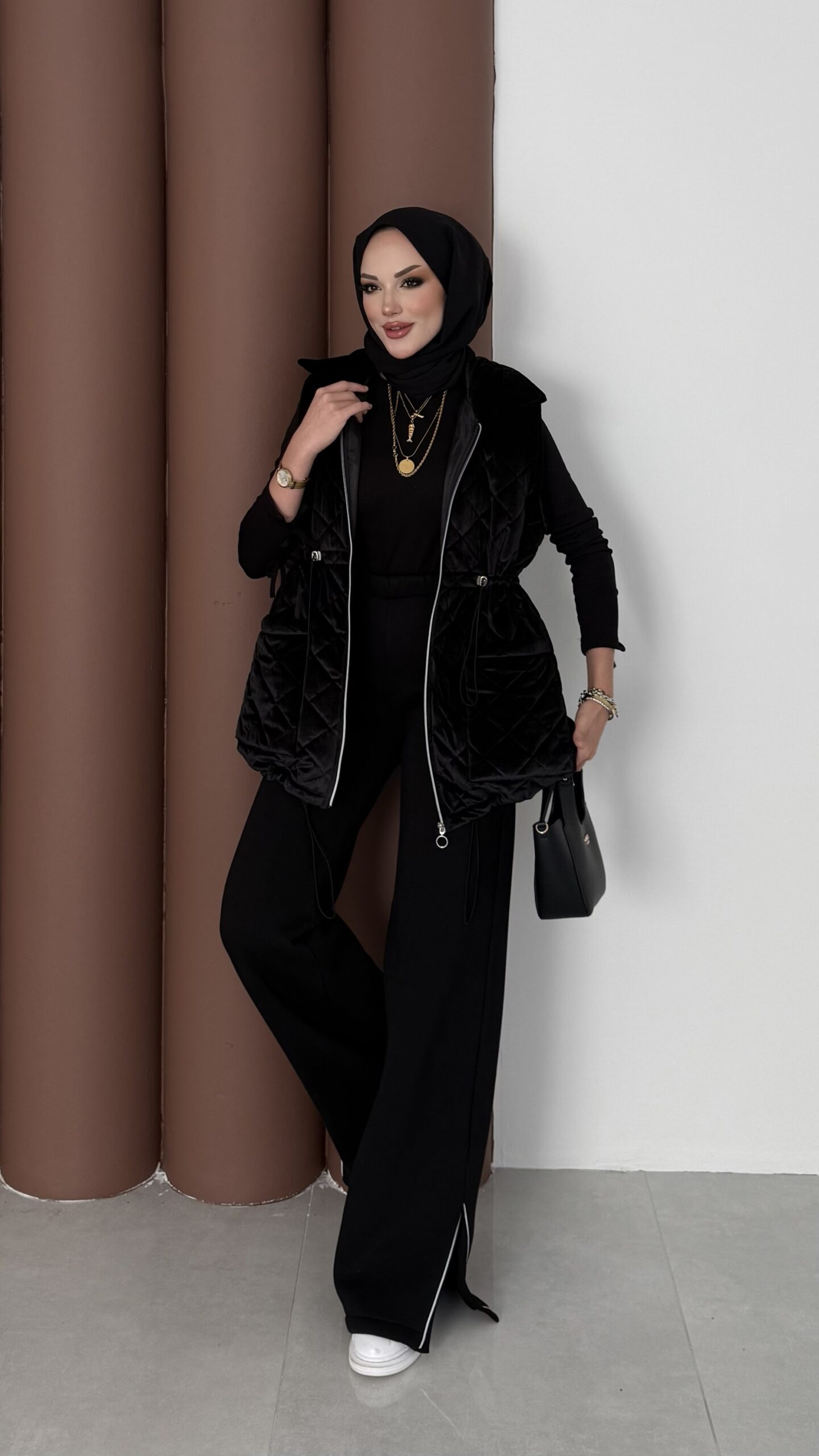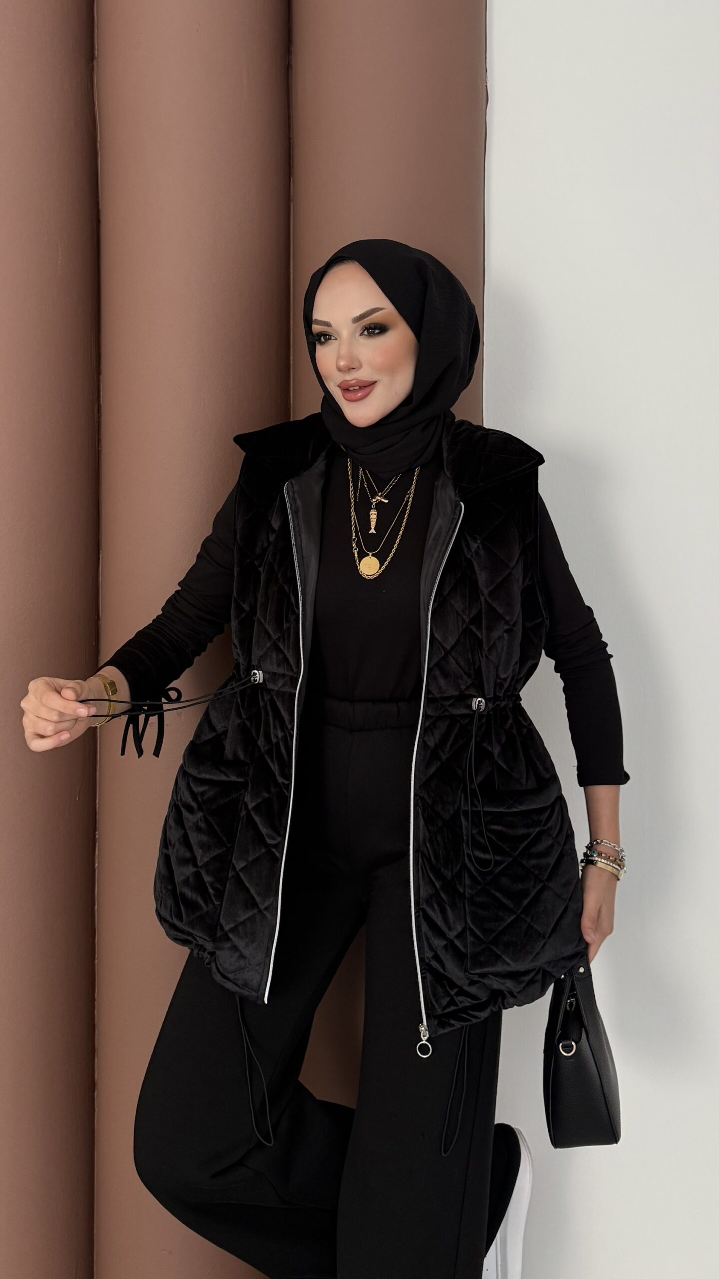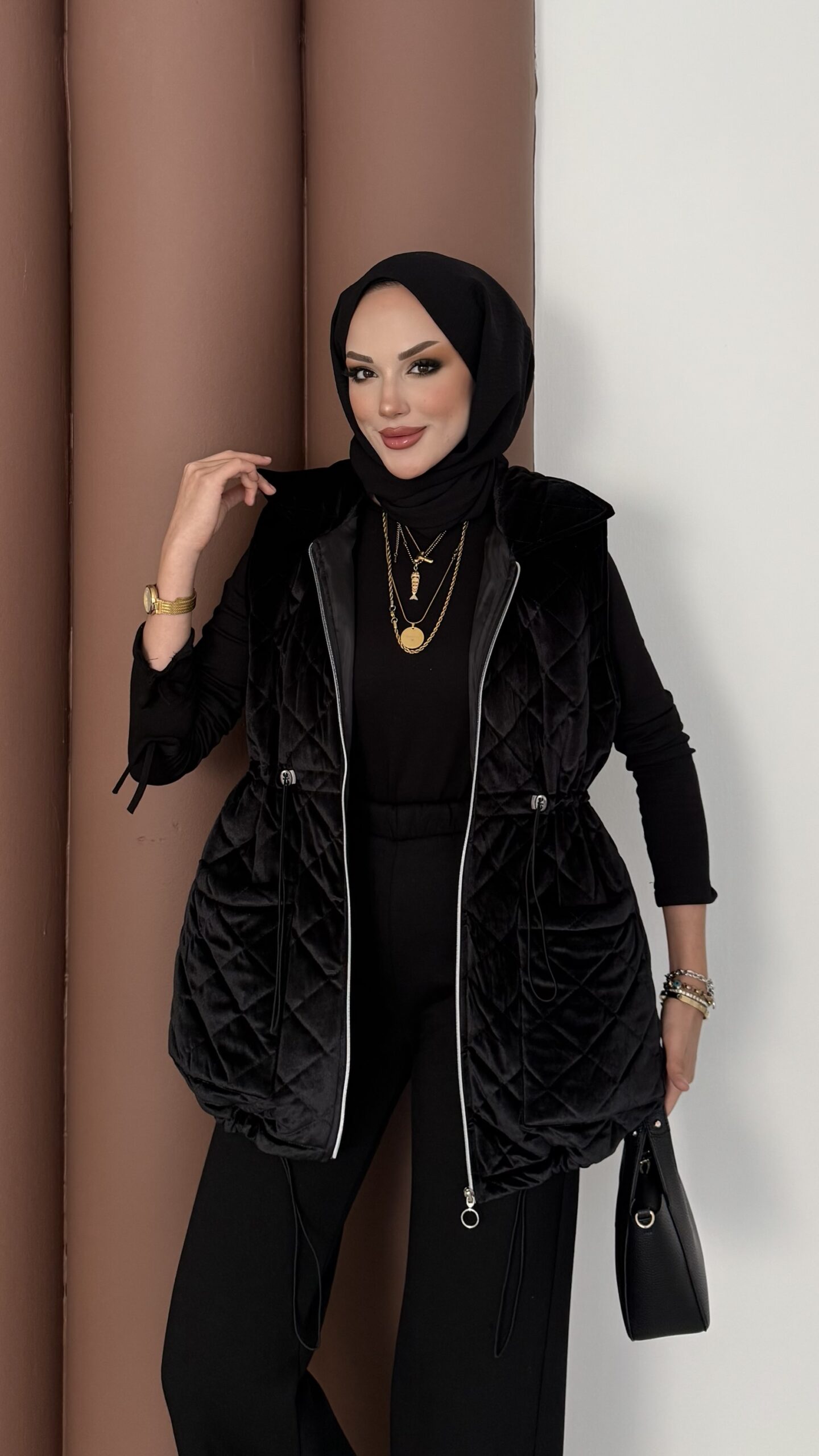Kapitoneli Kadife Şişme Yelek – Siyah
