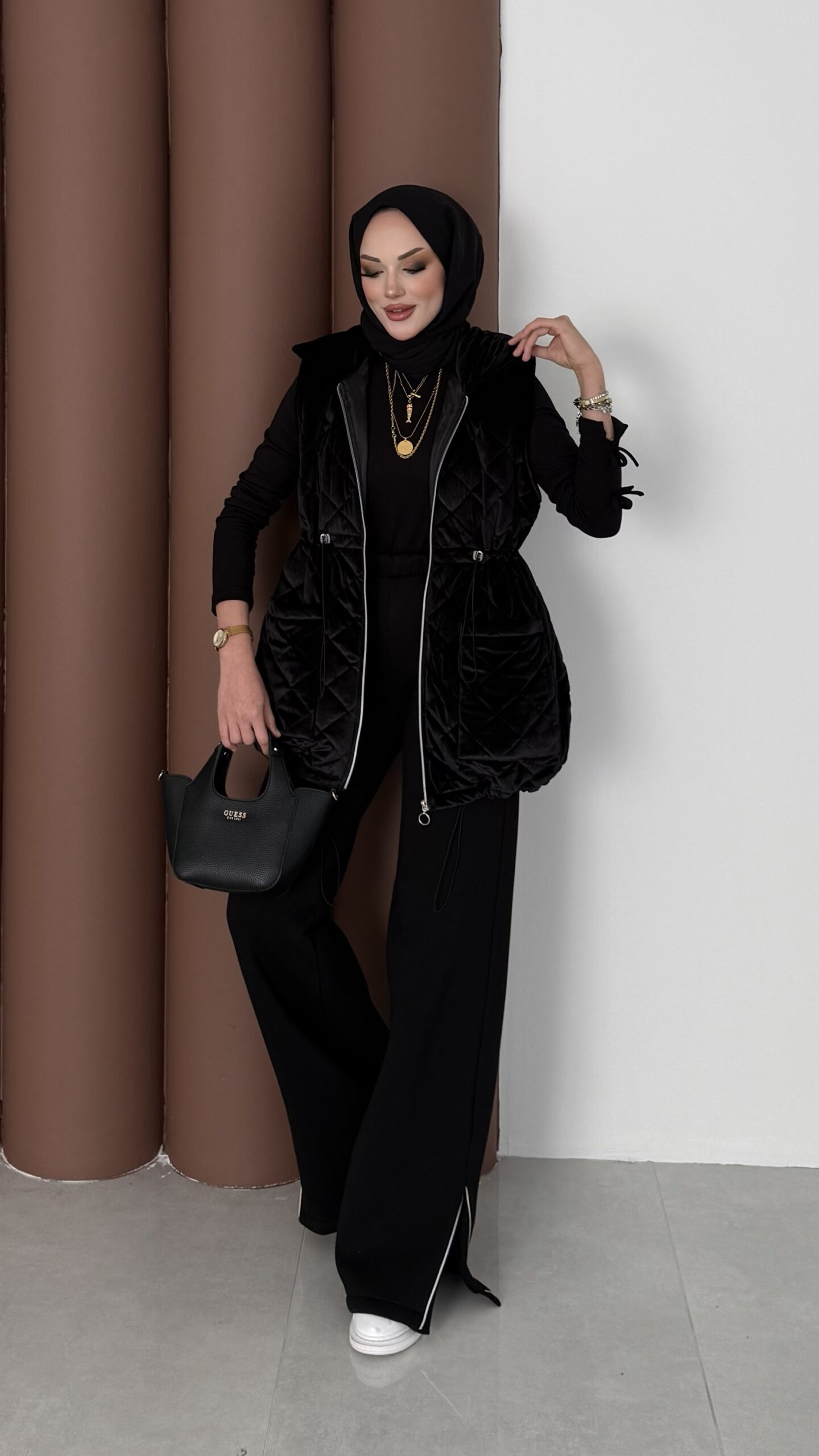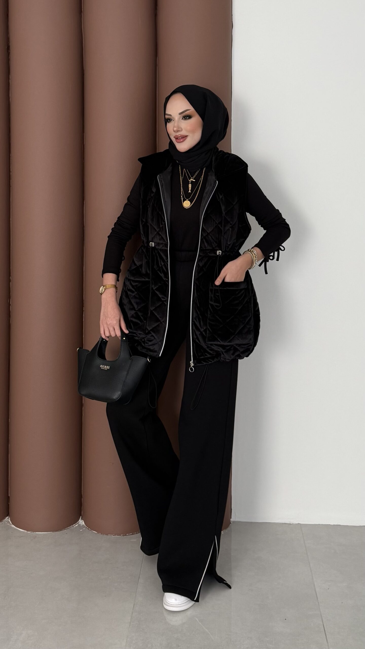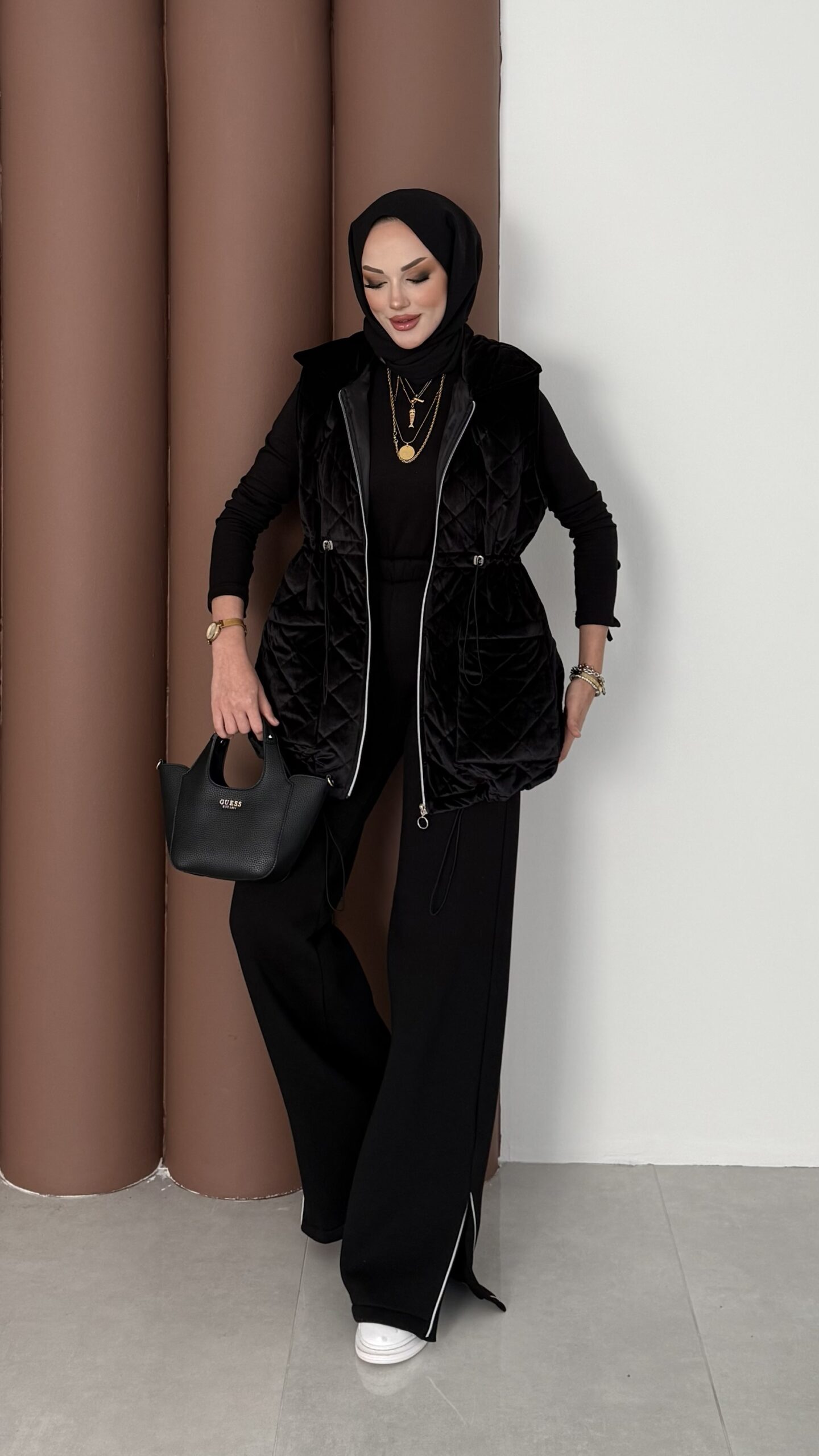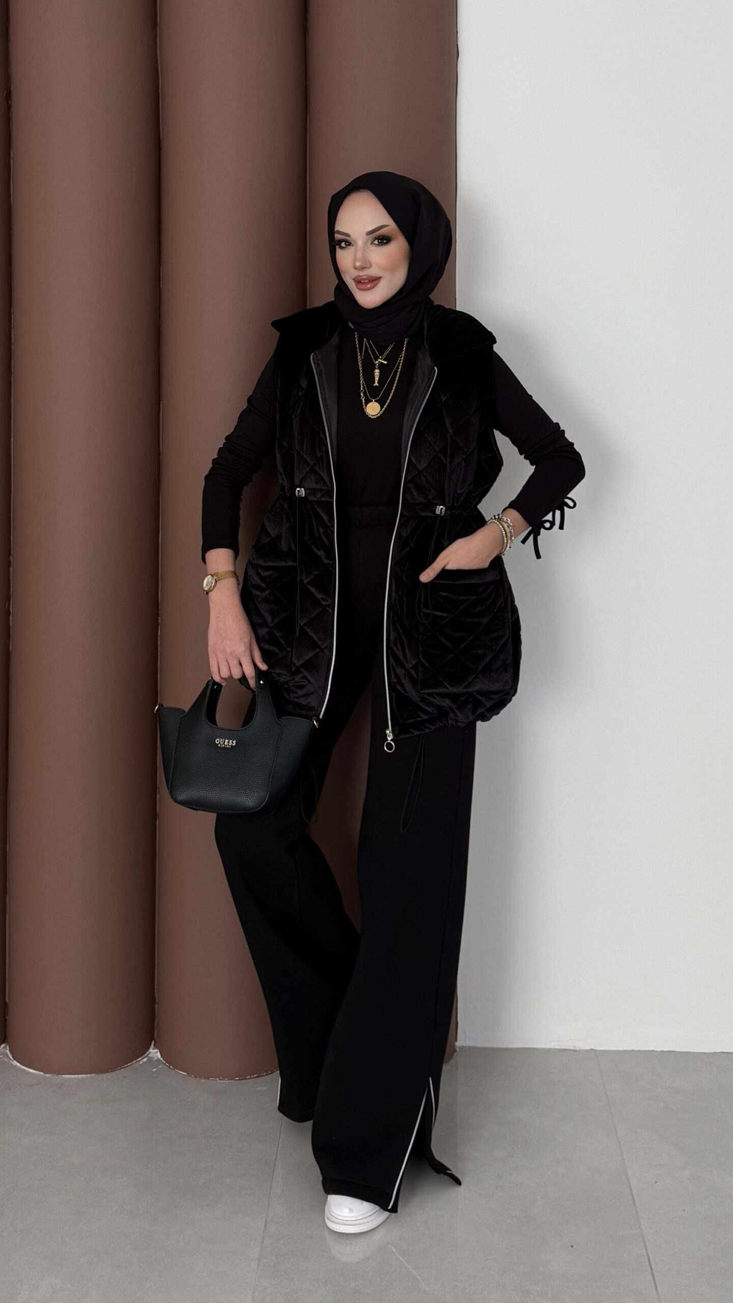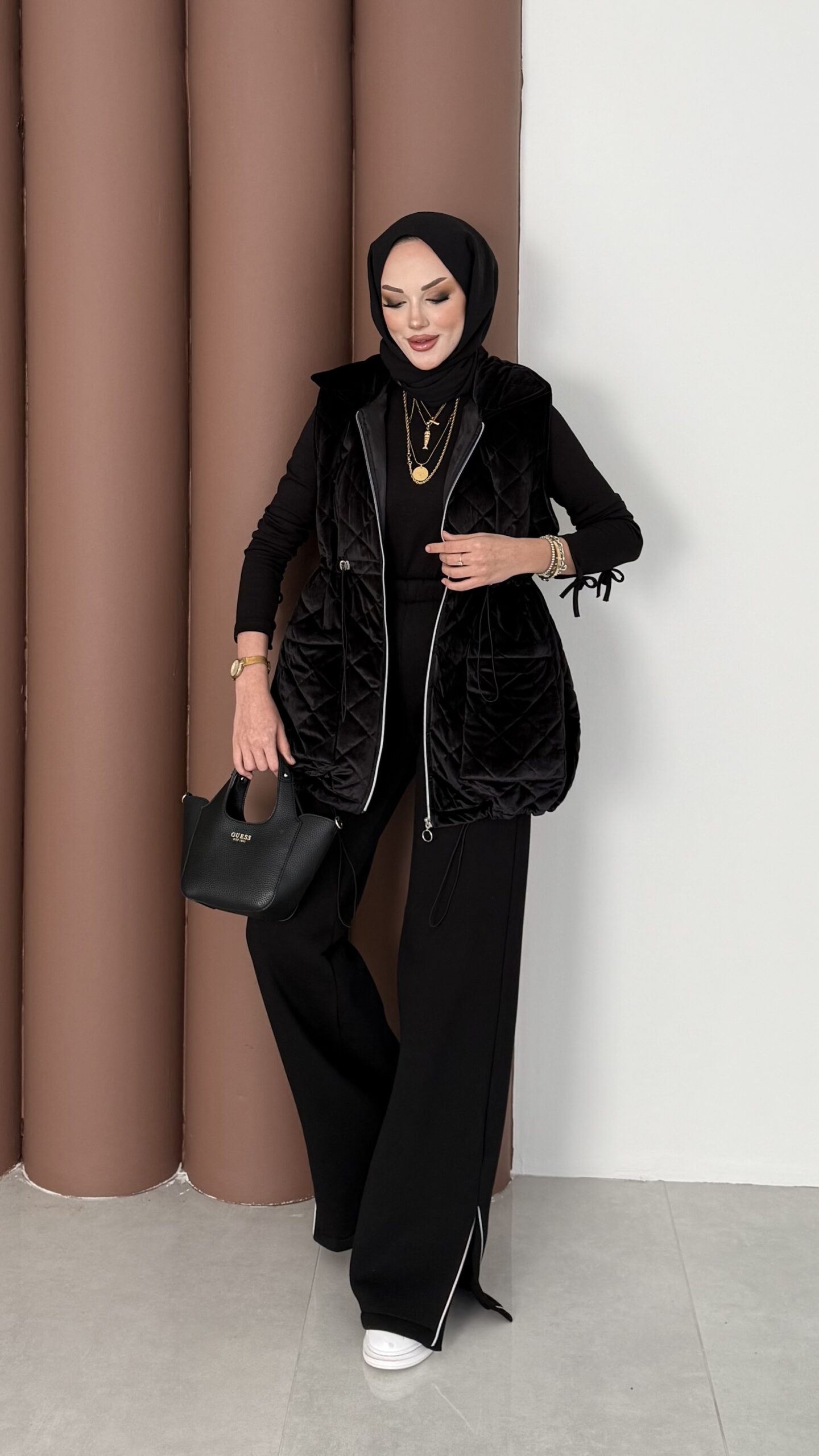 Kapitoneli Kadife Şişme Yelek – Siyah
