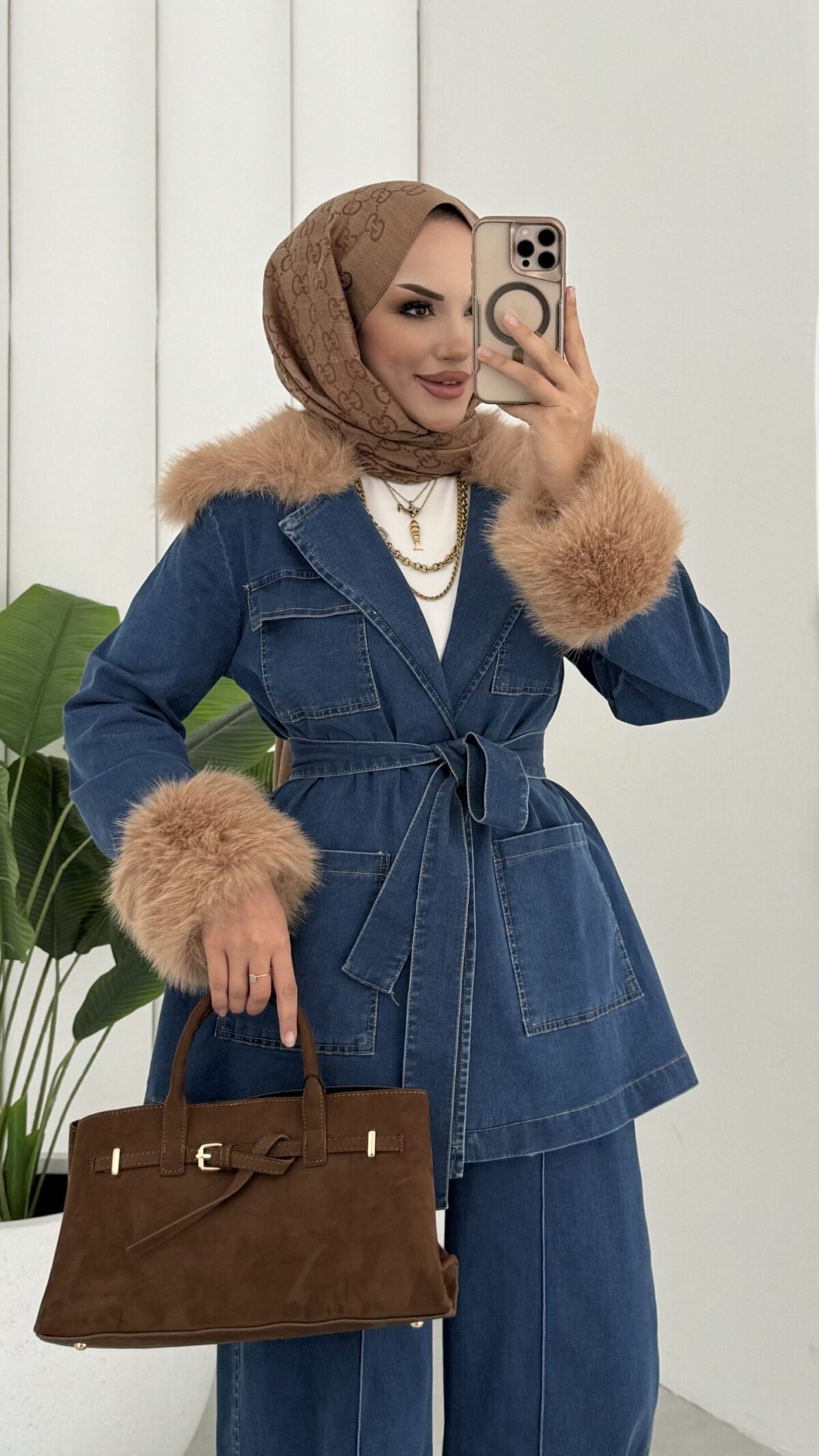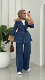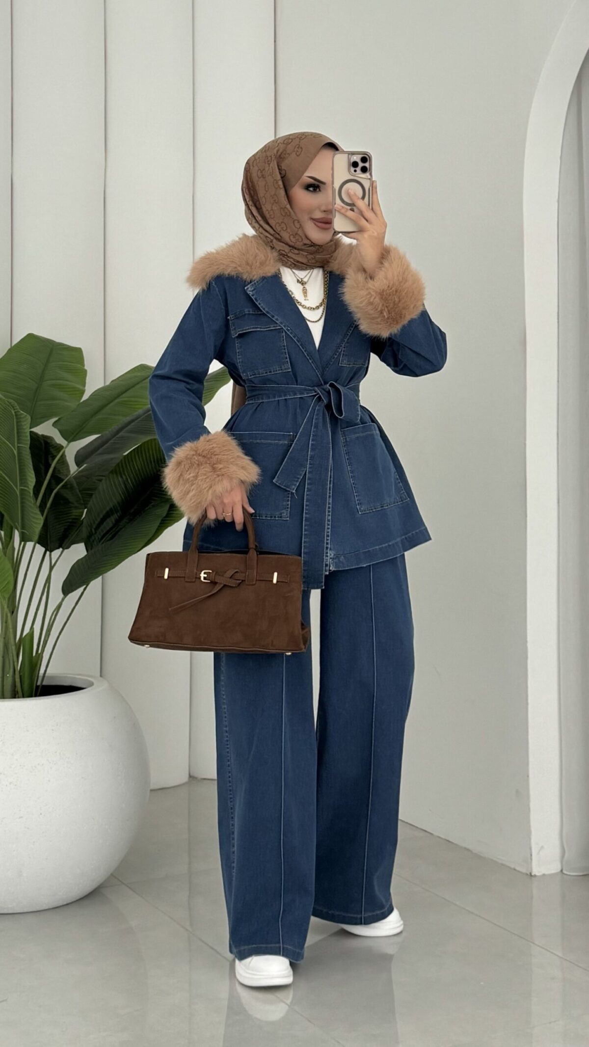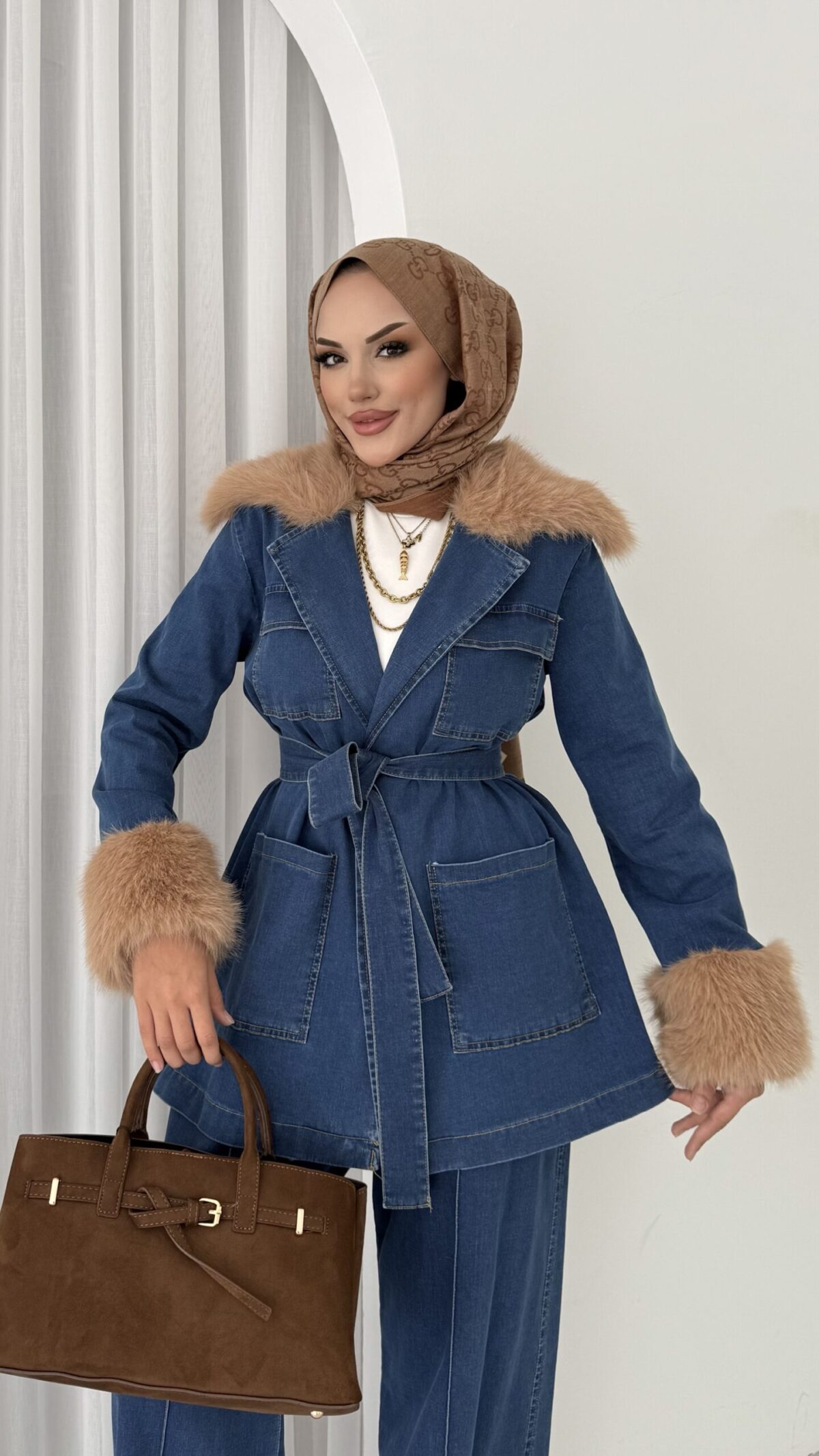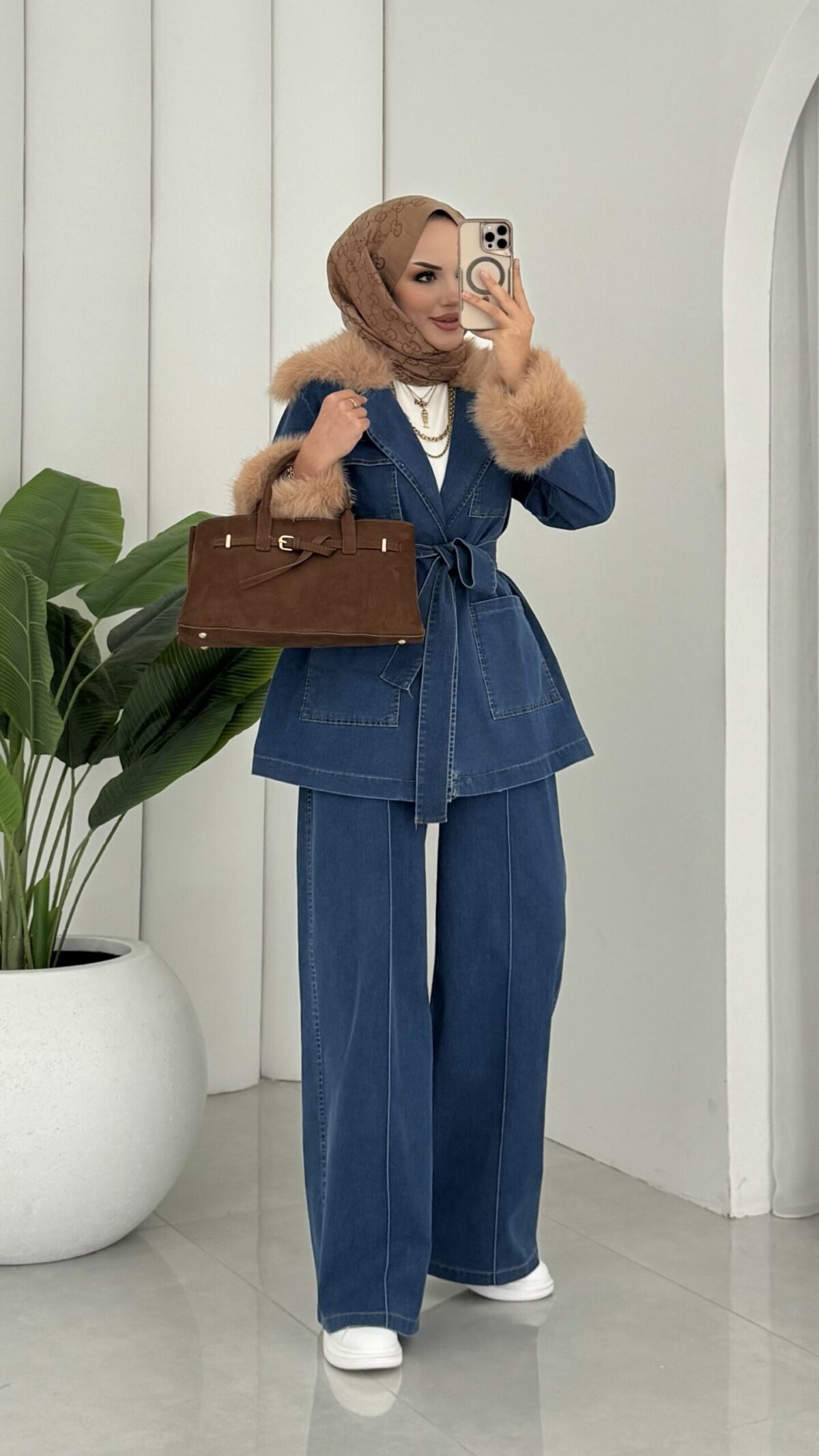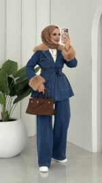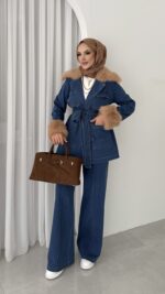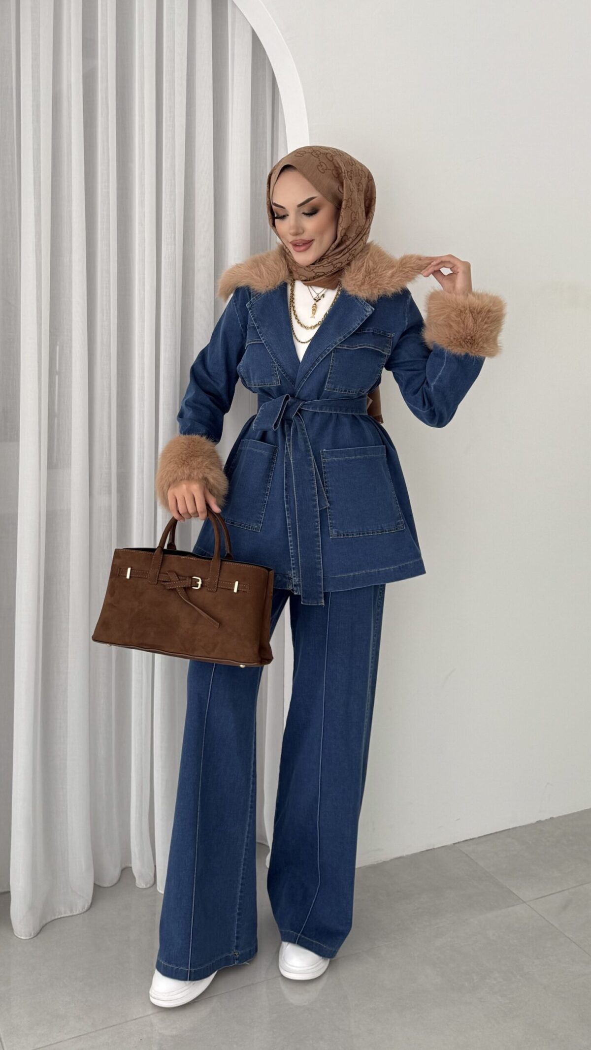 Luxury Kürklü Denim İkili Takım - Koyu Mavi