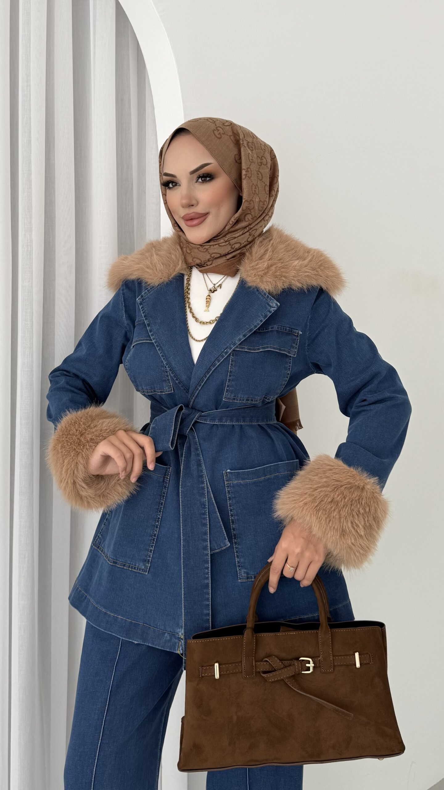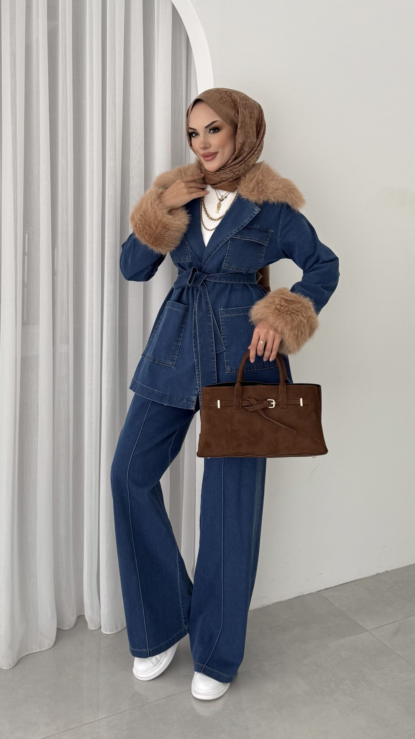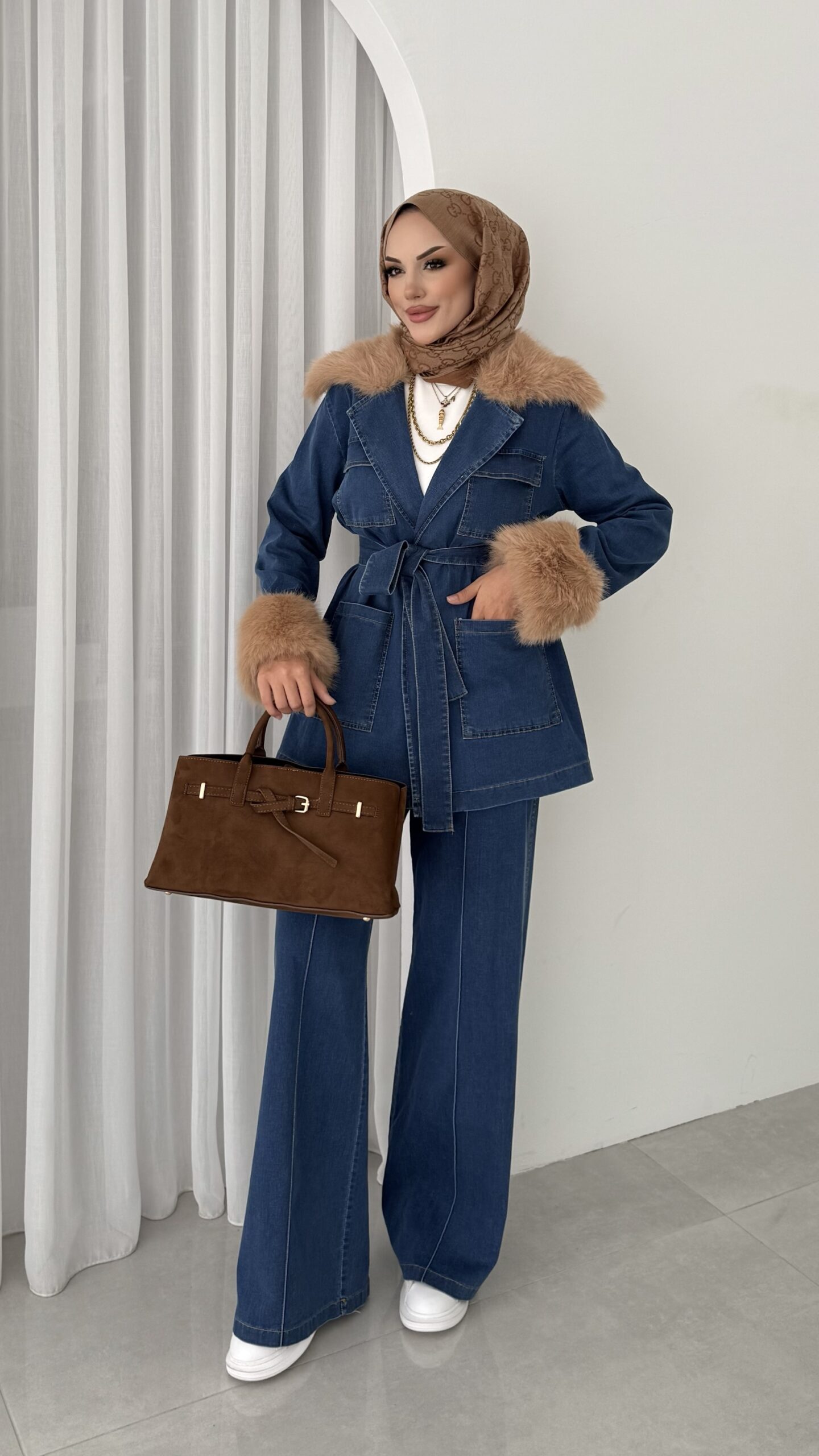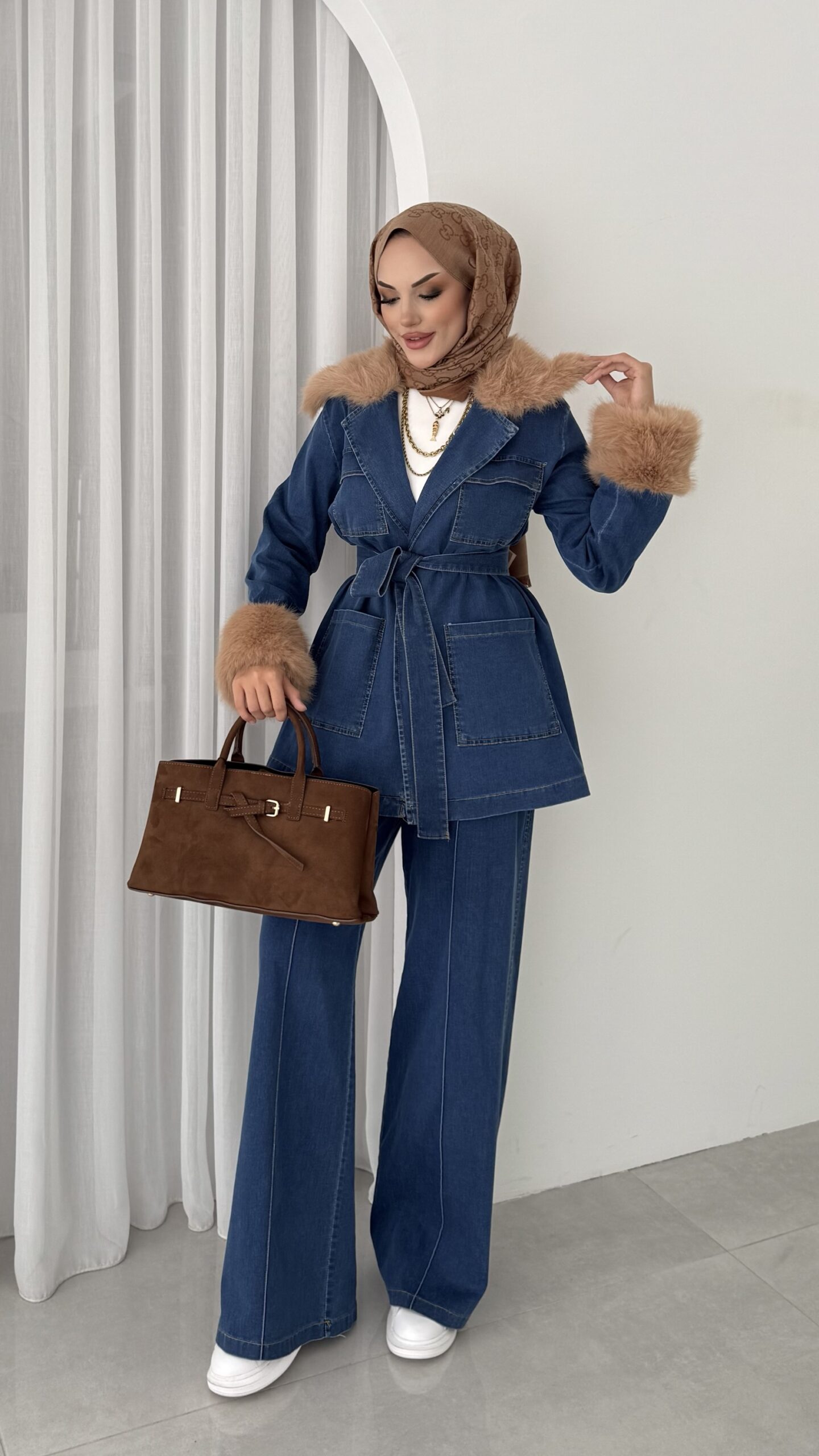 Luxury Kürklü Denim İkili Takım – Açık Mavi