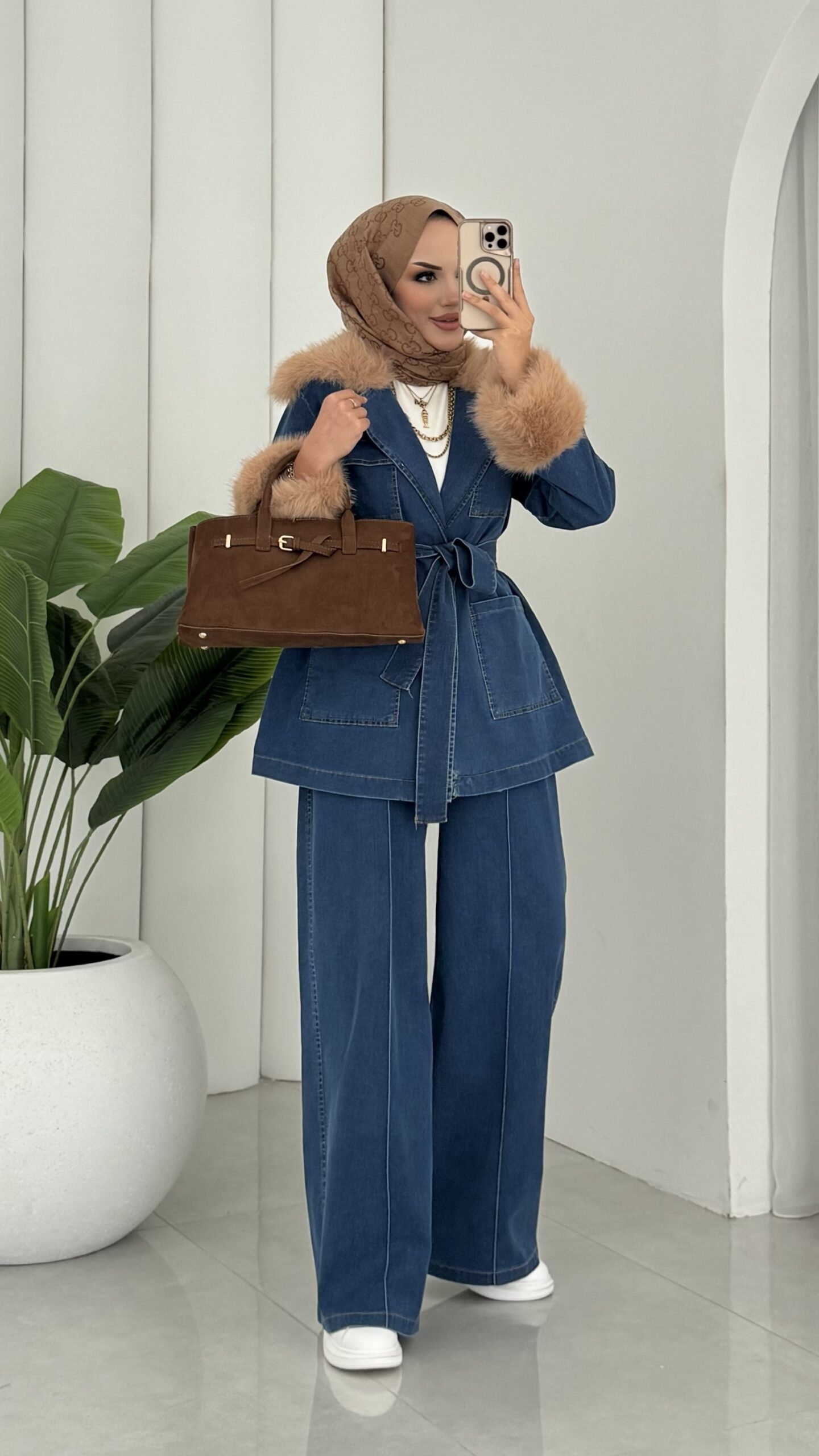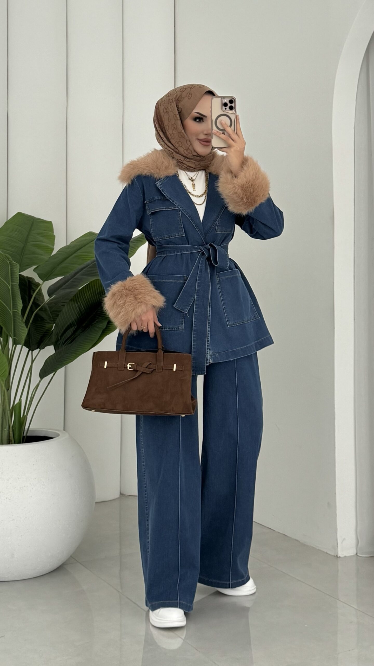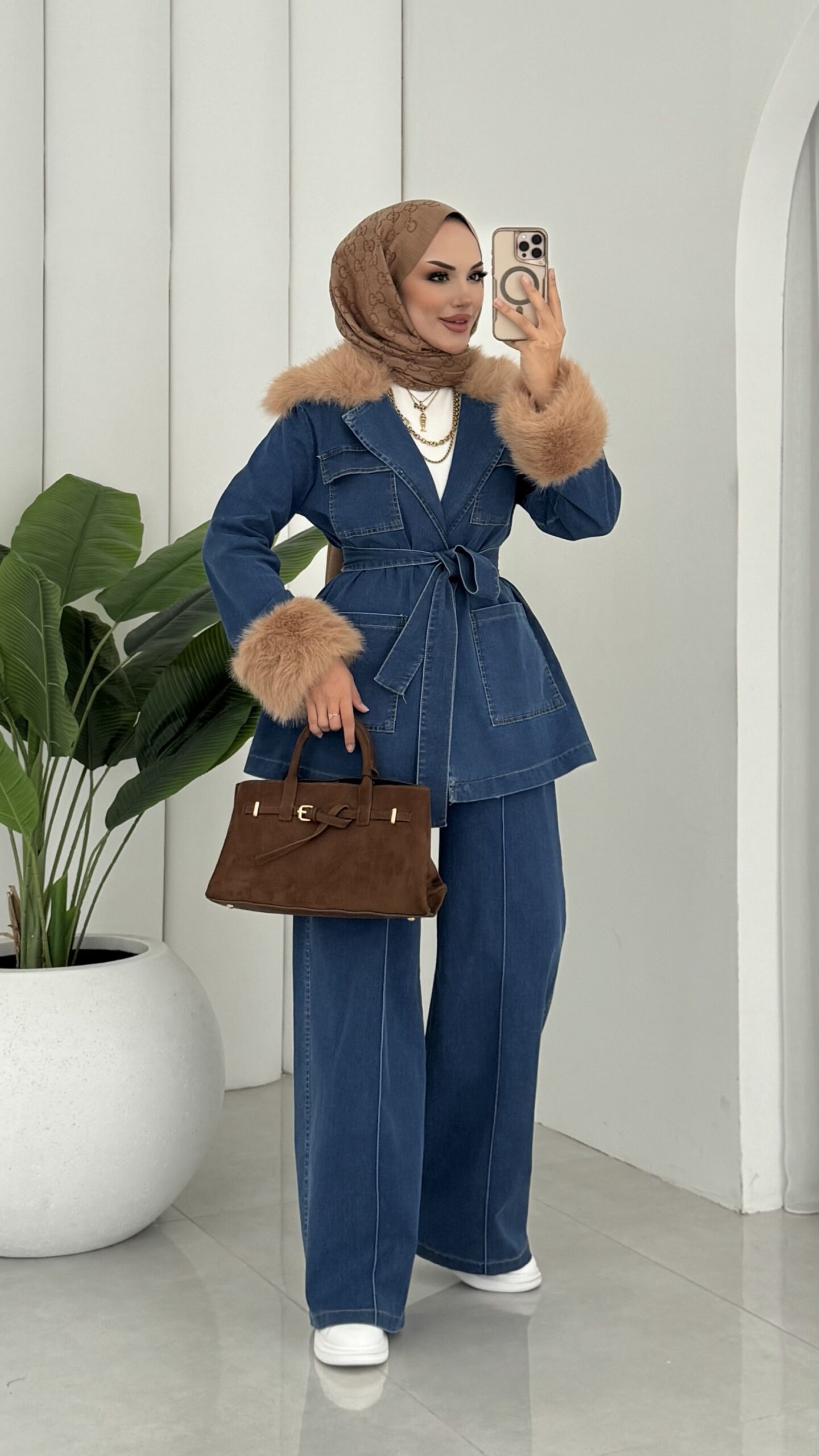 Luxury Kürklü Denim İkili Takım – Açık Mavi