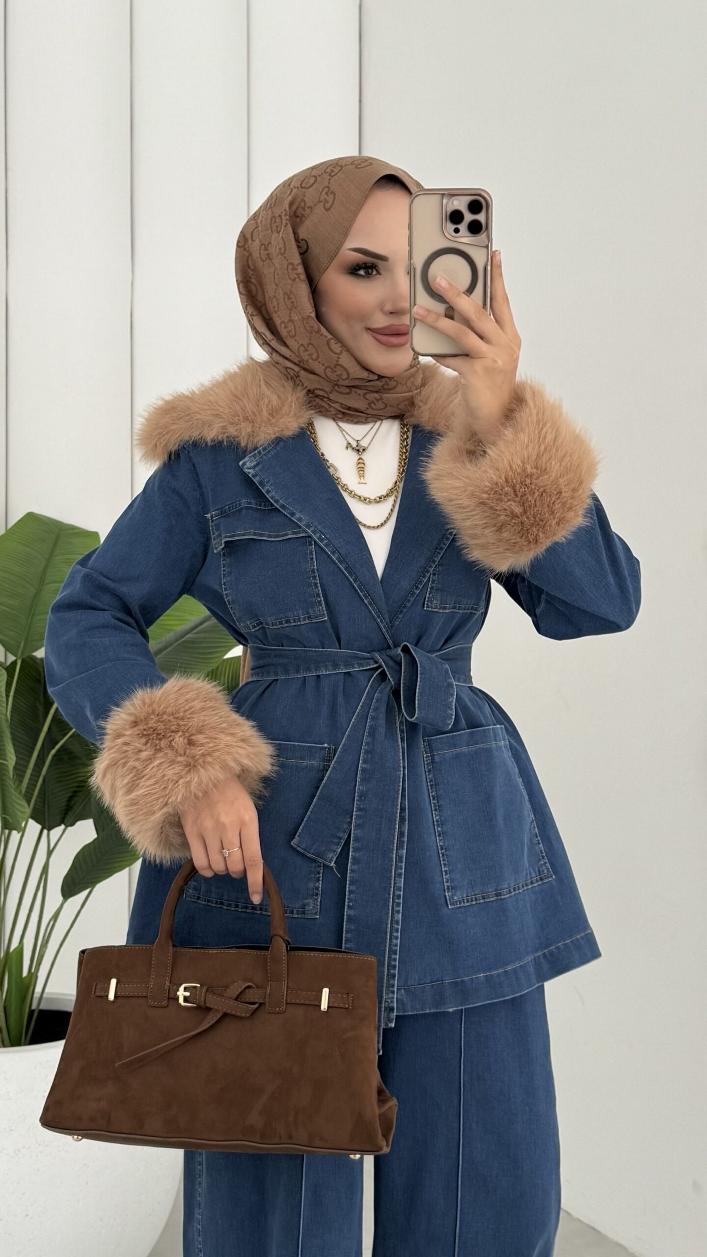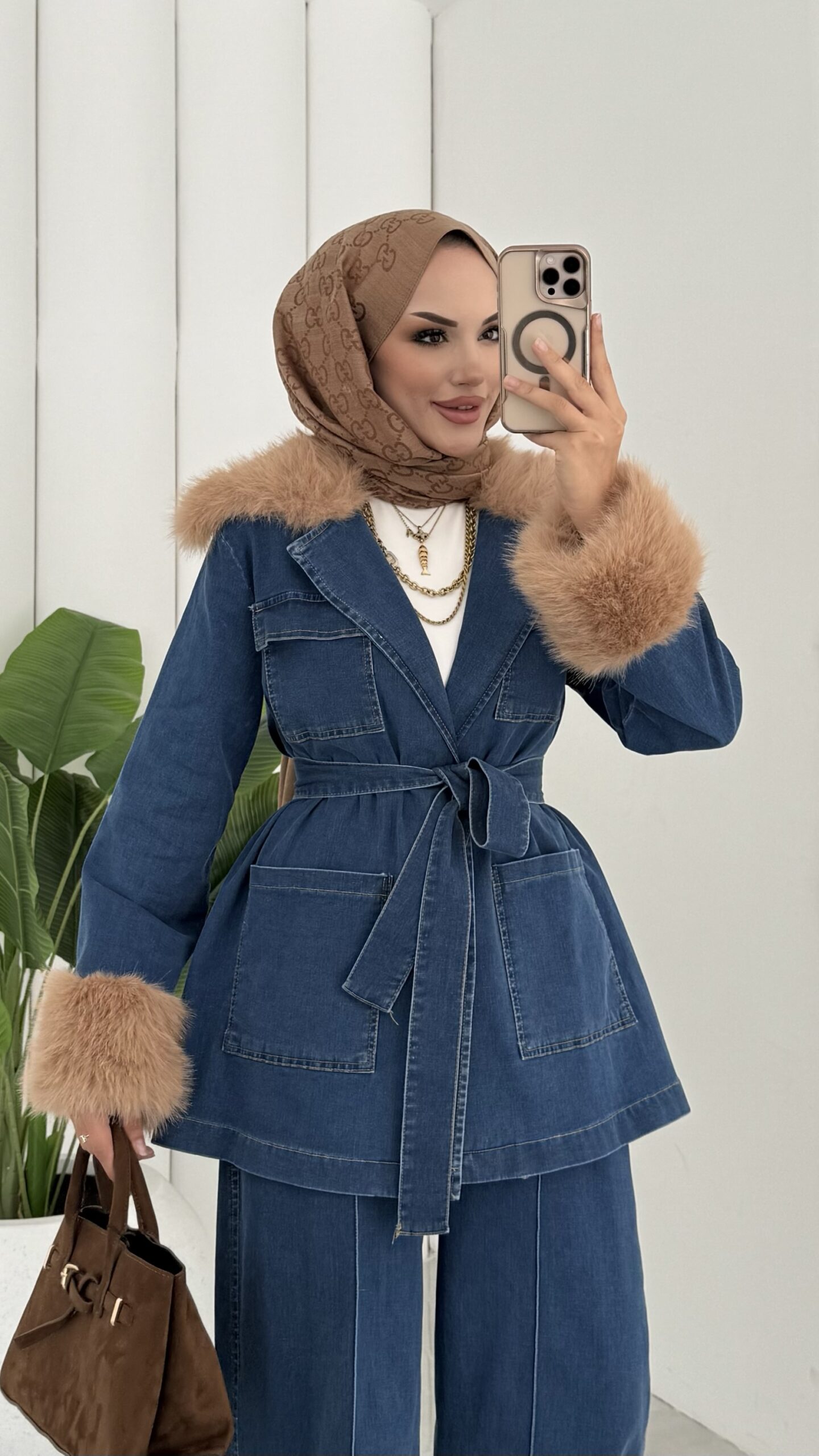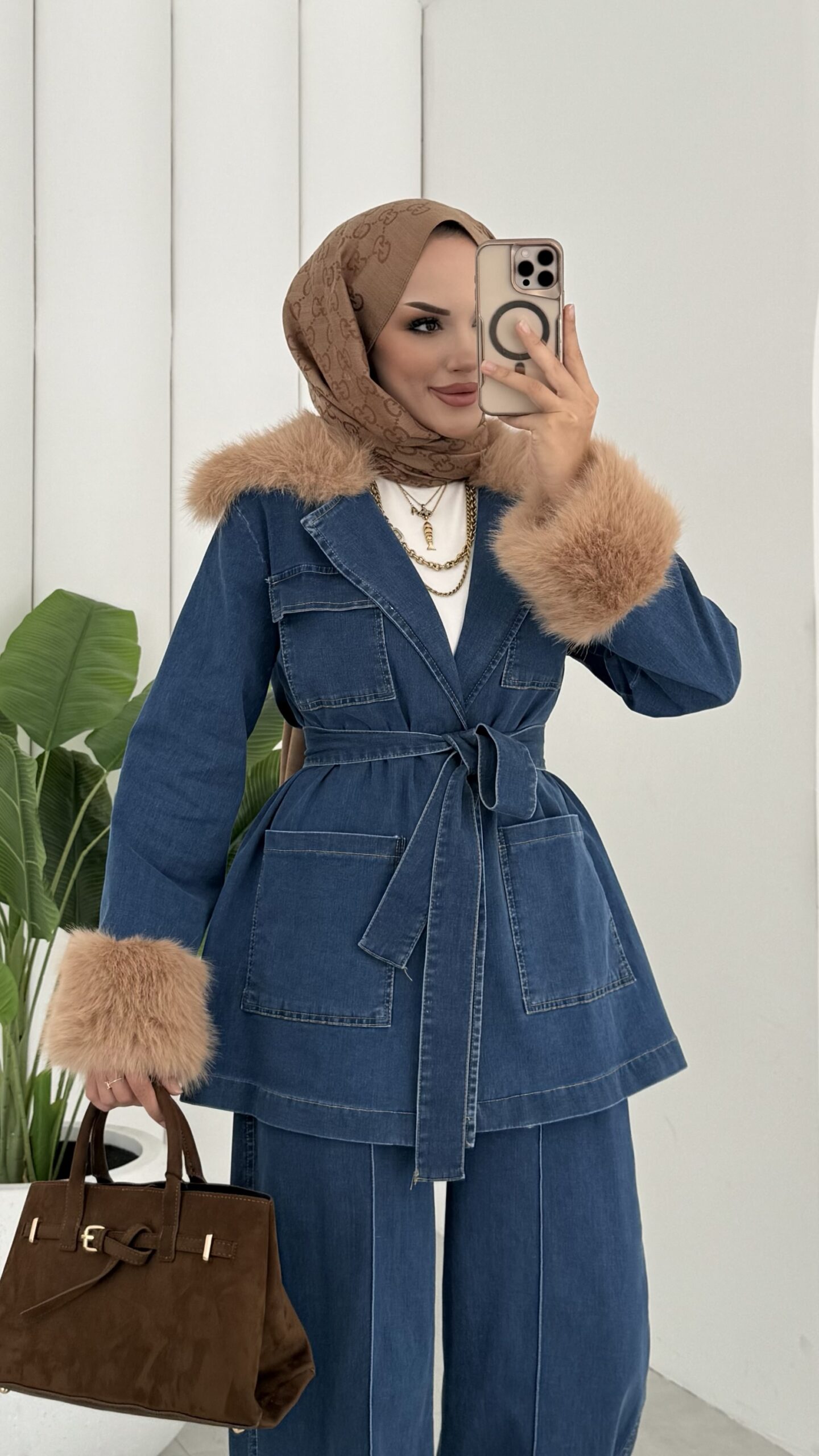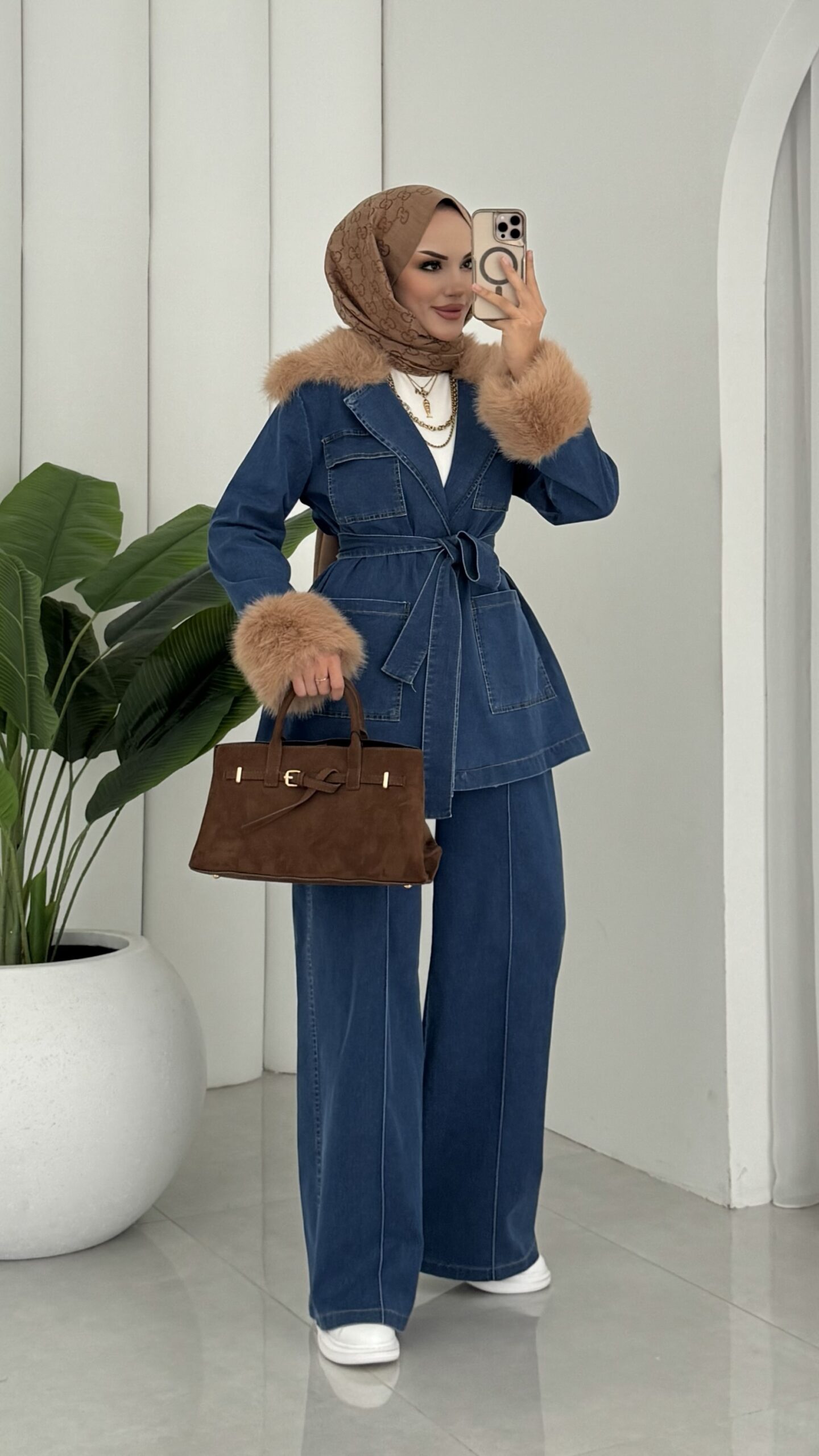Luxury Kürklü Denim İkili Takım – Açık Mavi