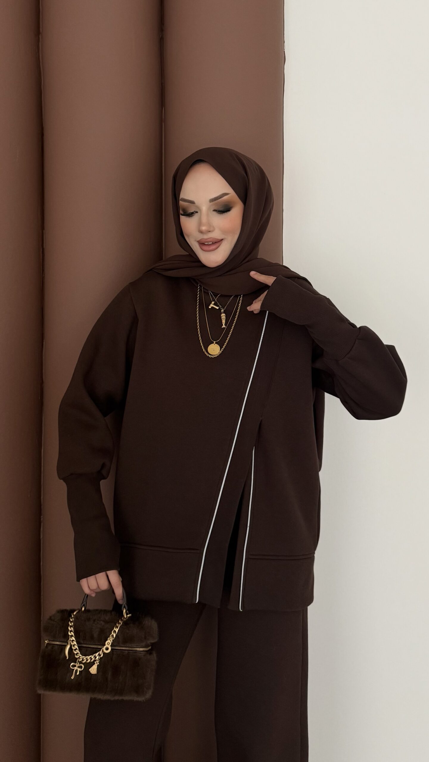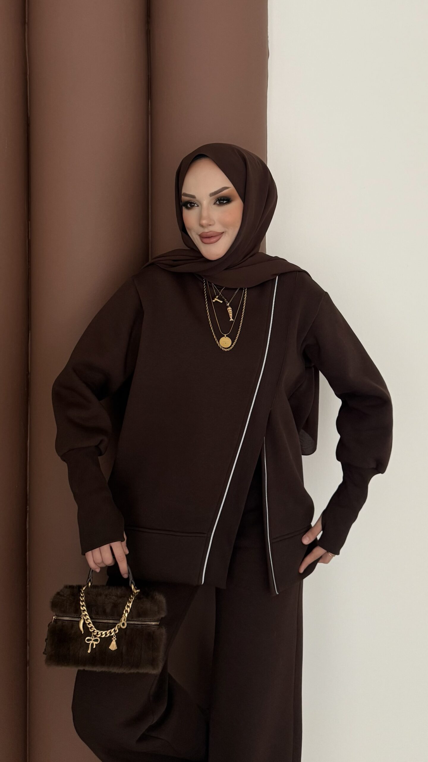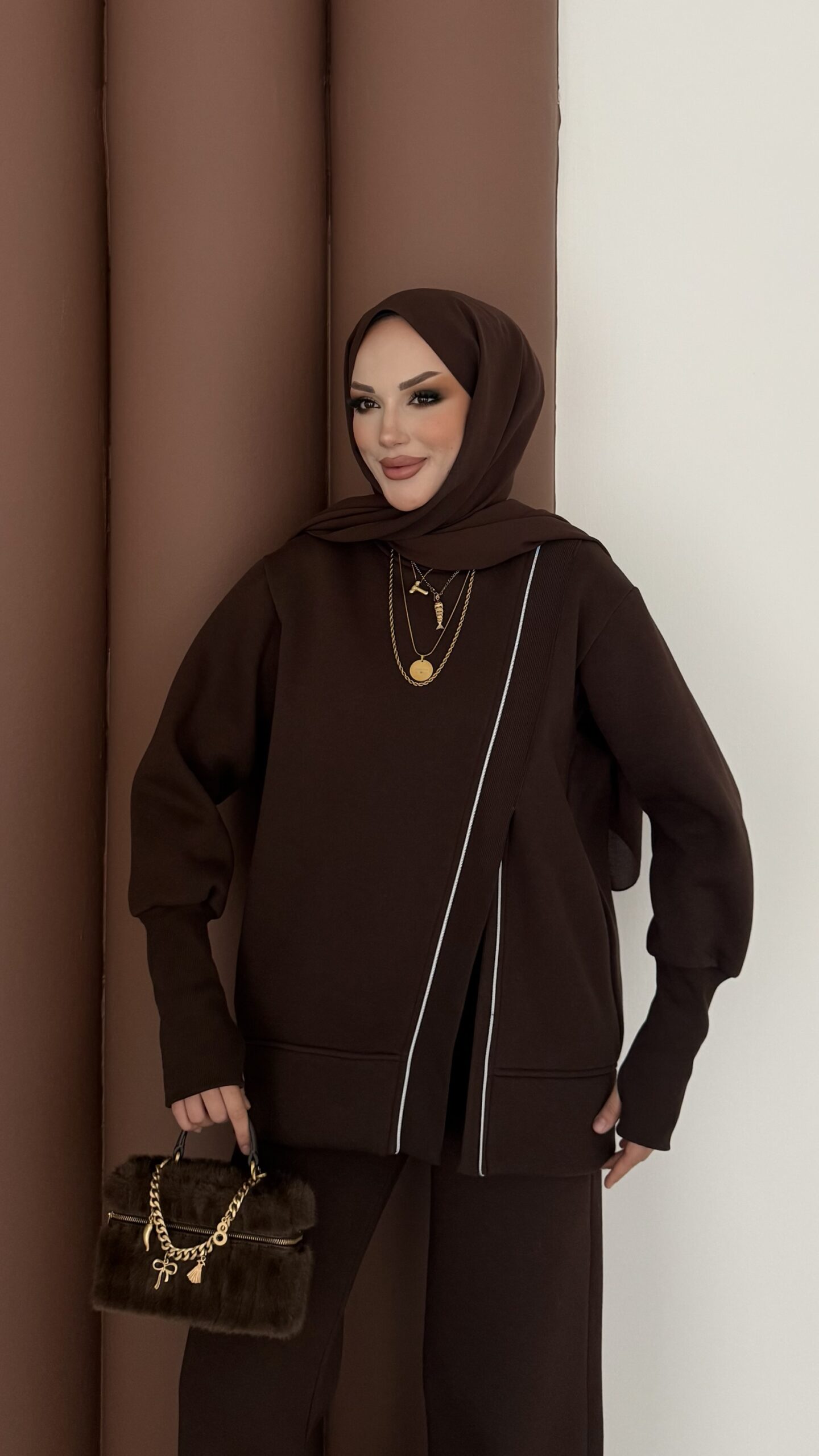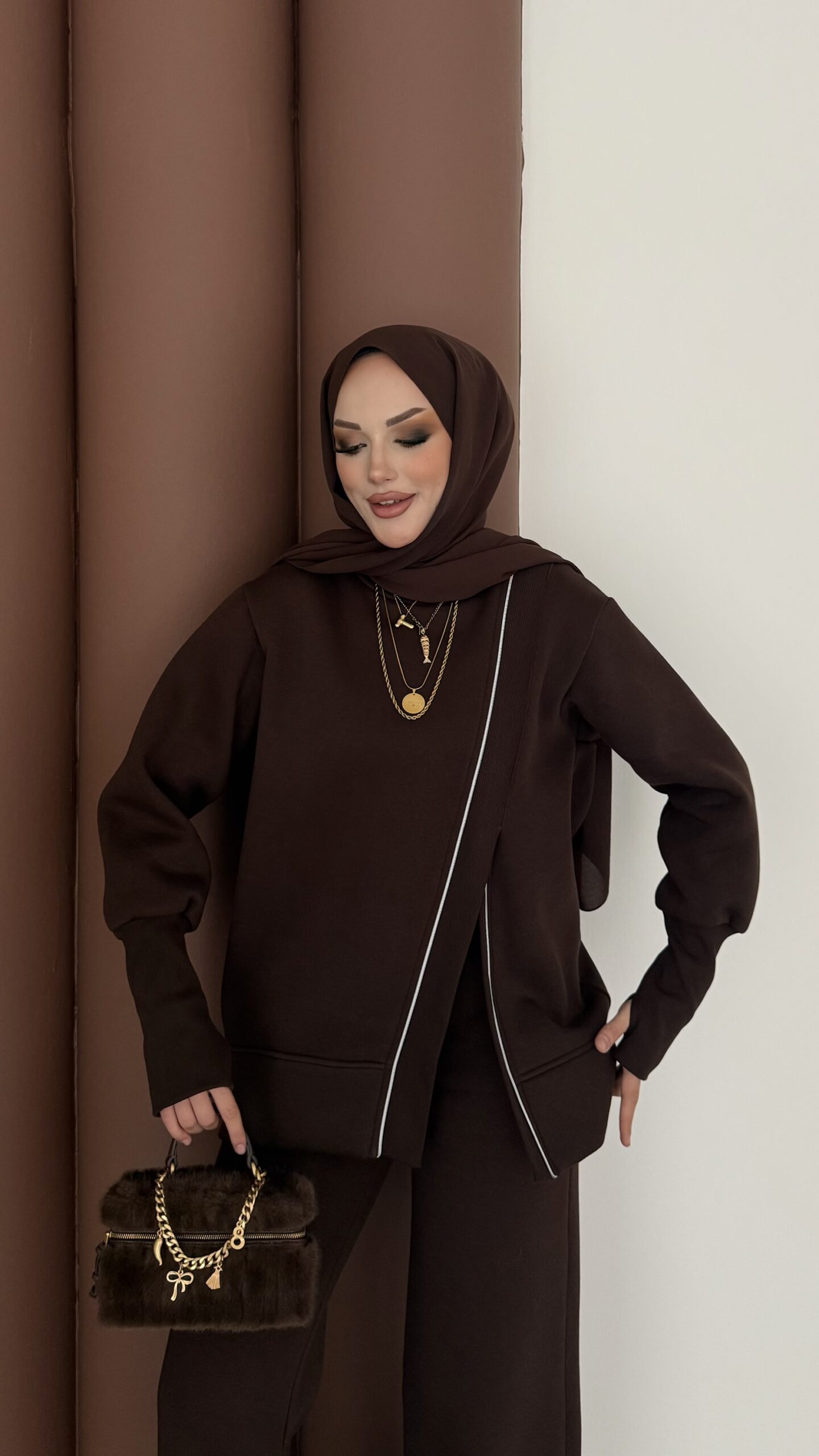 Muadil Asimetrik Fermuarlı İkili Takım – Kahverengi