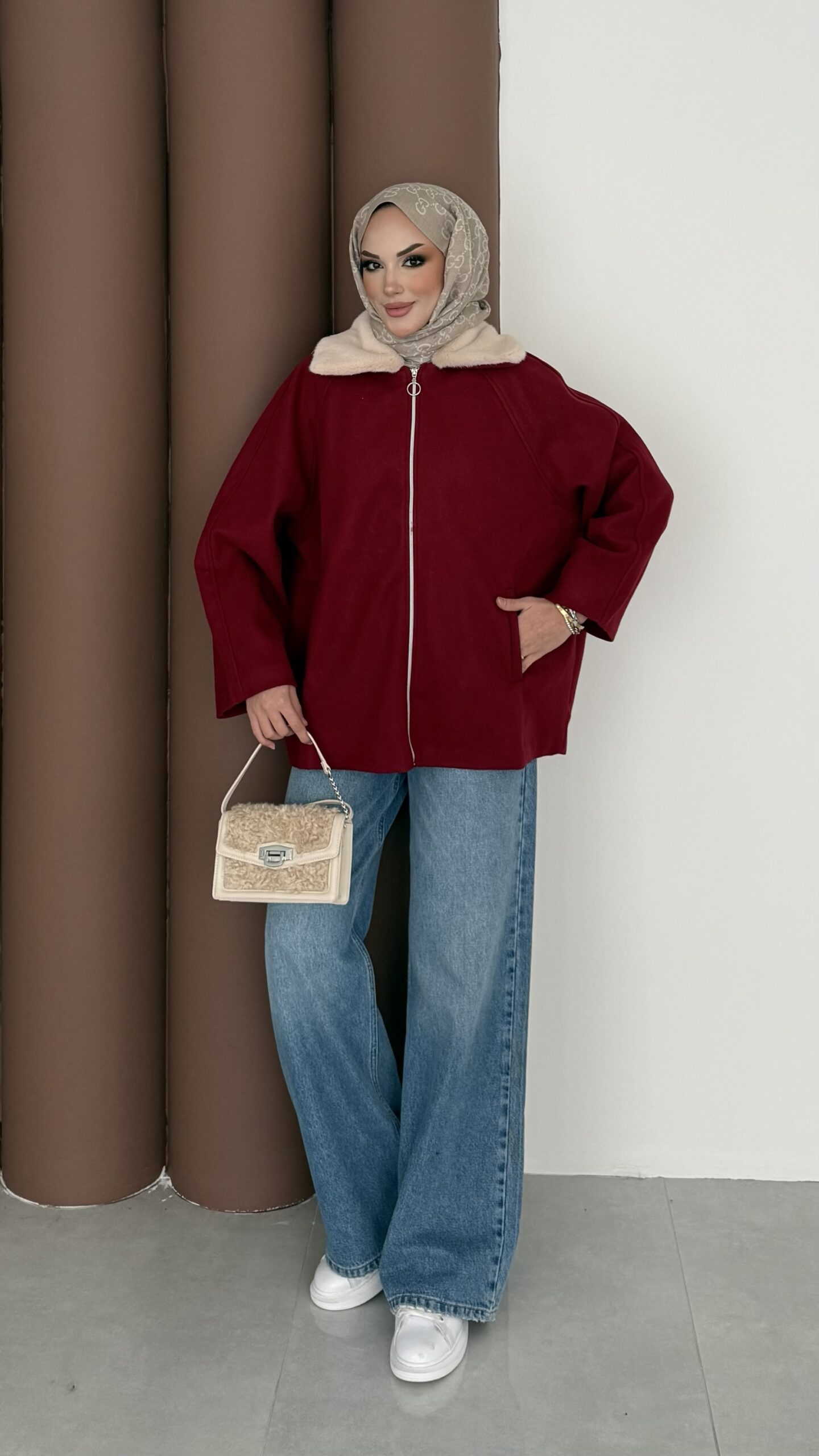 Muadil Kürk Yaka Kaşe Ceket – Bordo