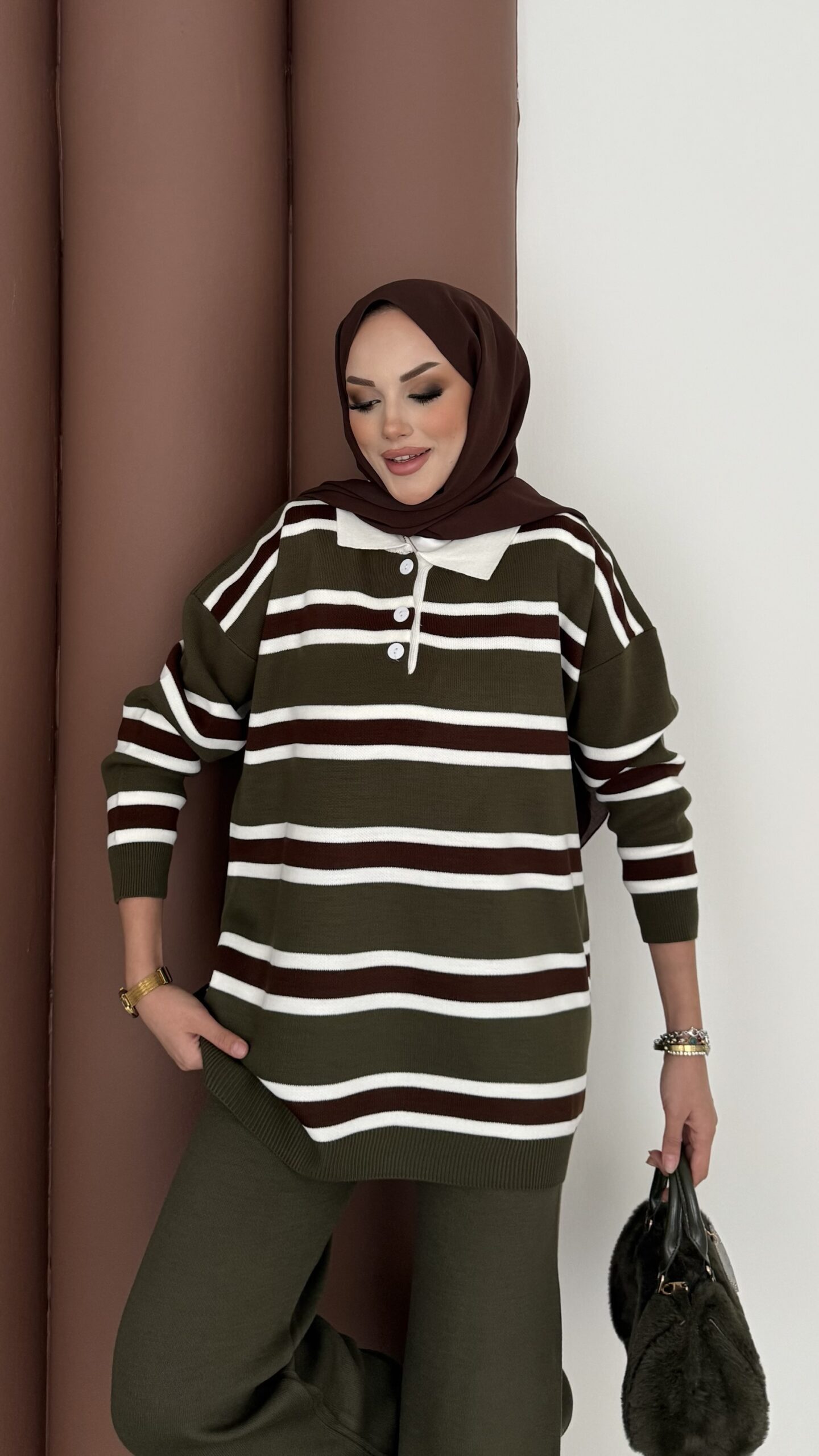 Pinterest Polo Yaka Çizgili Triko Takım – Haki