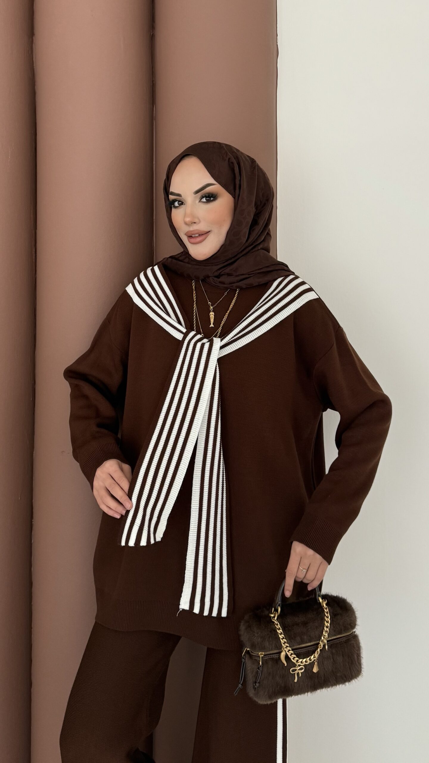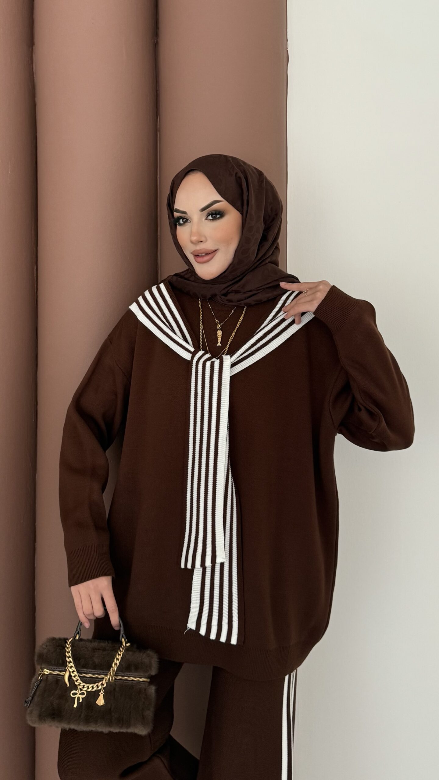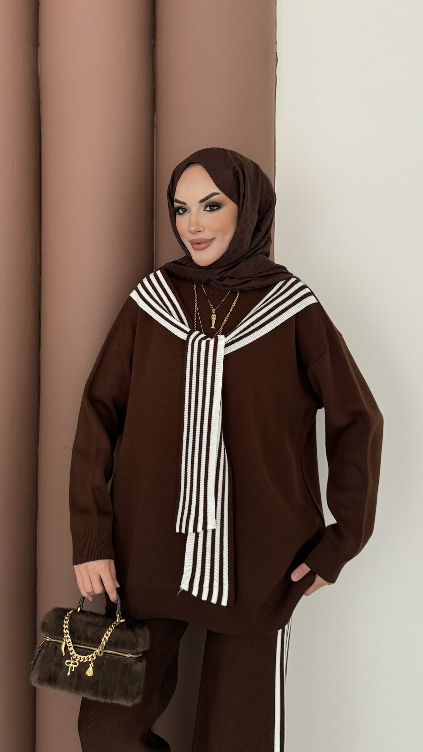 Kuğu Omuzu Püskül İpli İkili Takım – Kahverengi