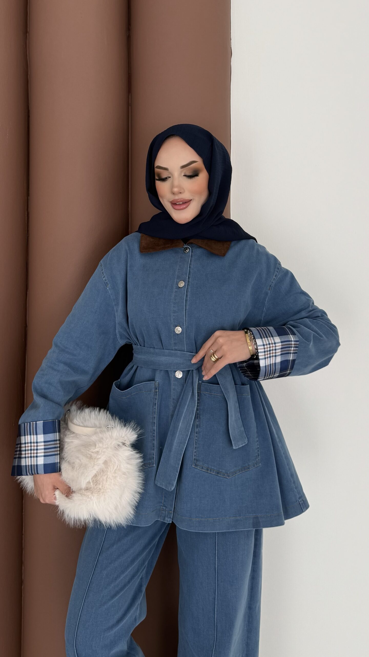 Ekose Desen Denim İkili Takım – Açık Mavi
