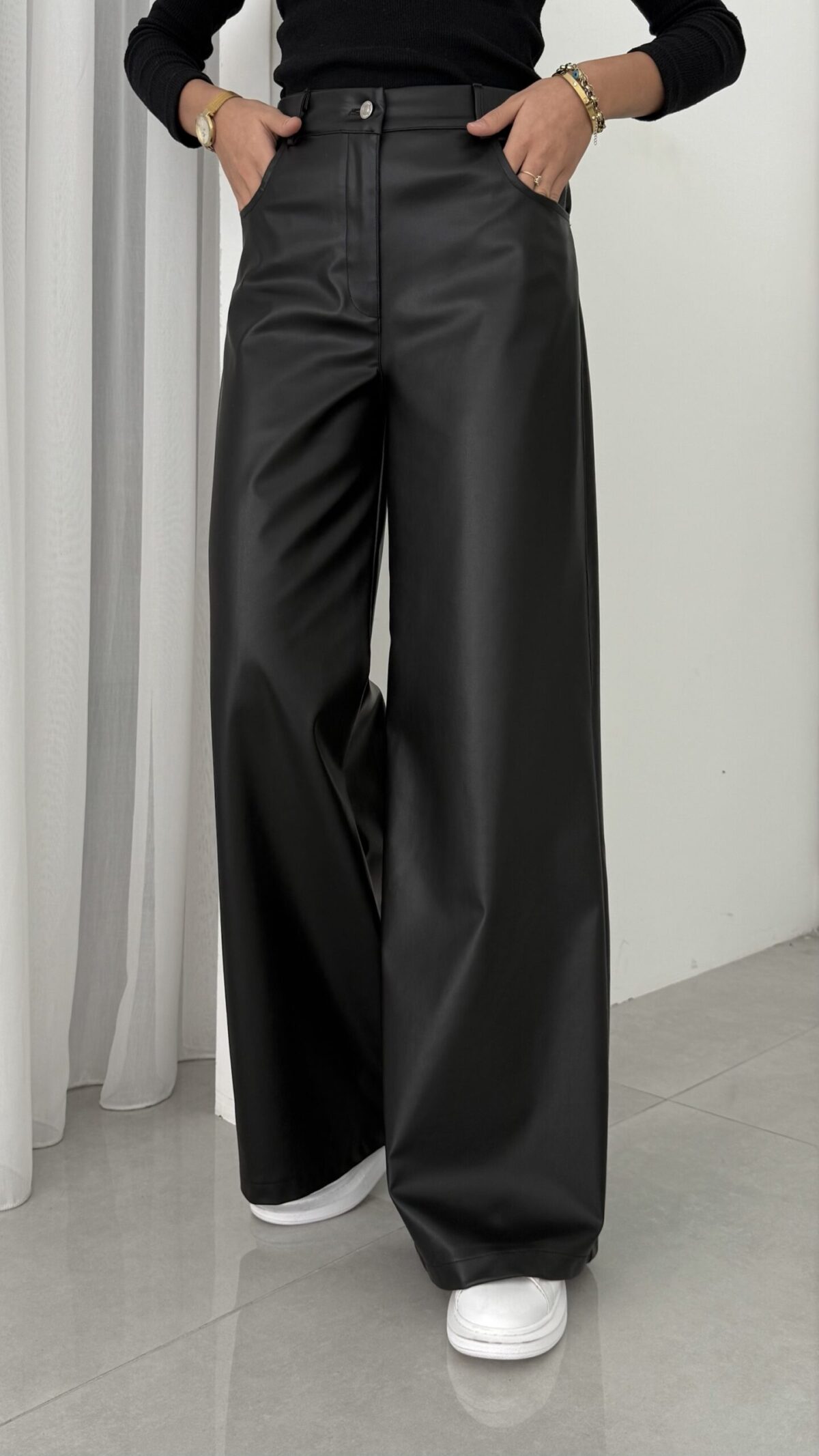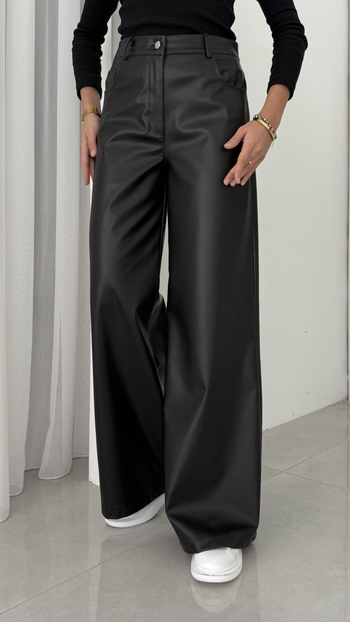 Zra Muadil Yüksek Bel Palazzo Deri Pantolon – Siyah