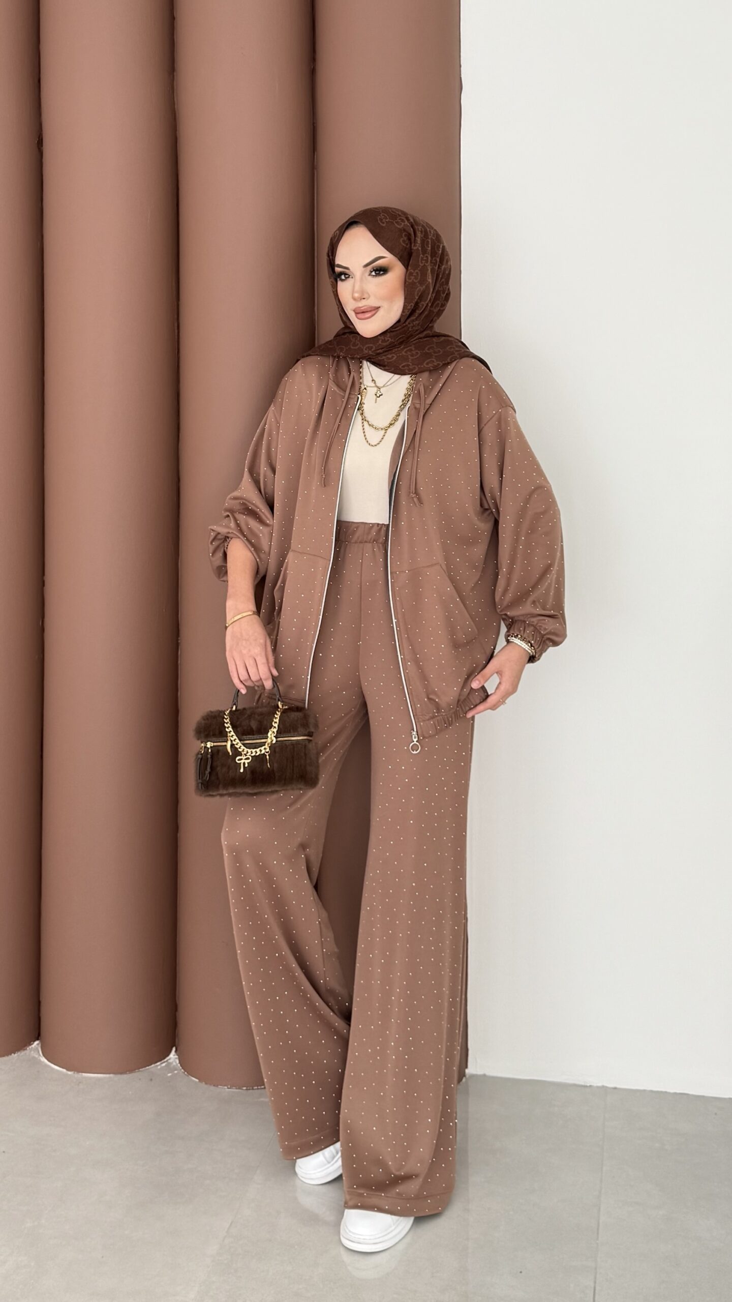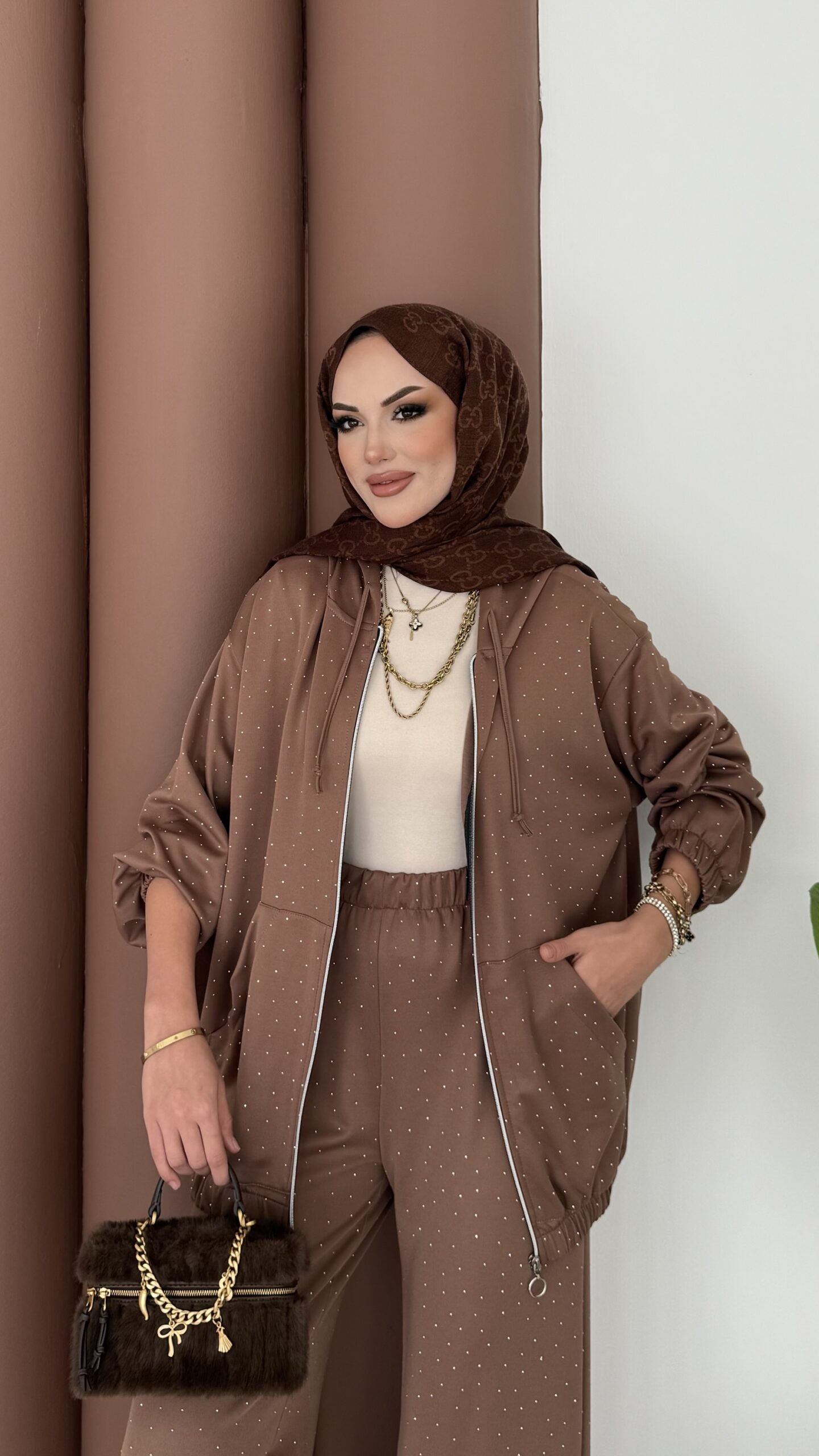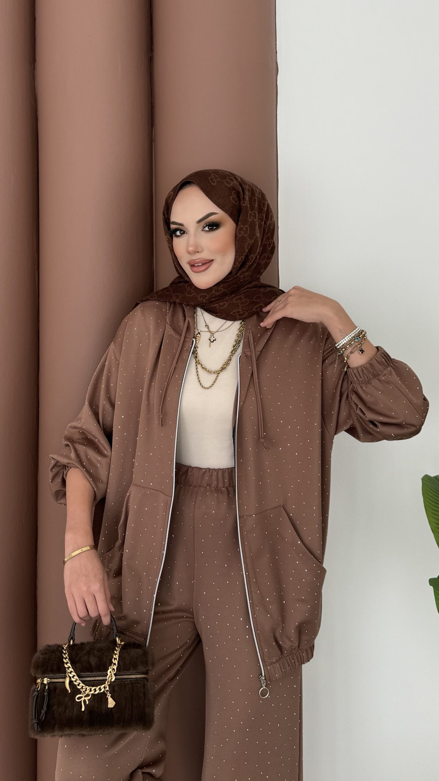 Fashion Taşlı Bomber İkili Takım – Kahverengi
