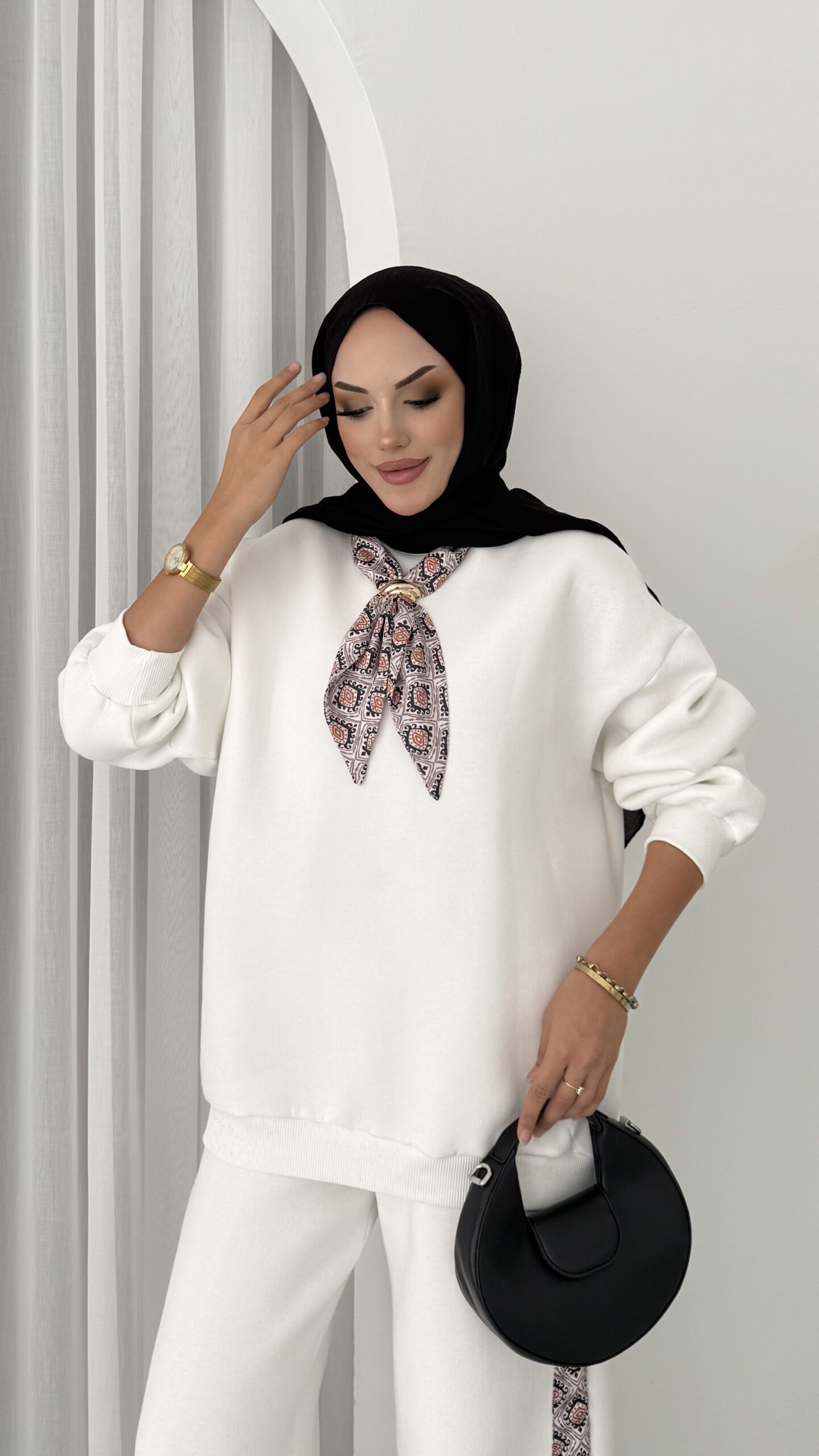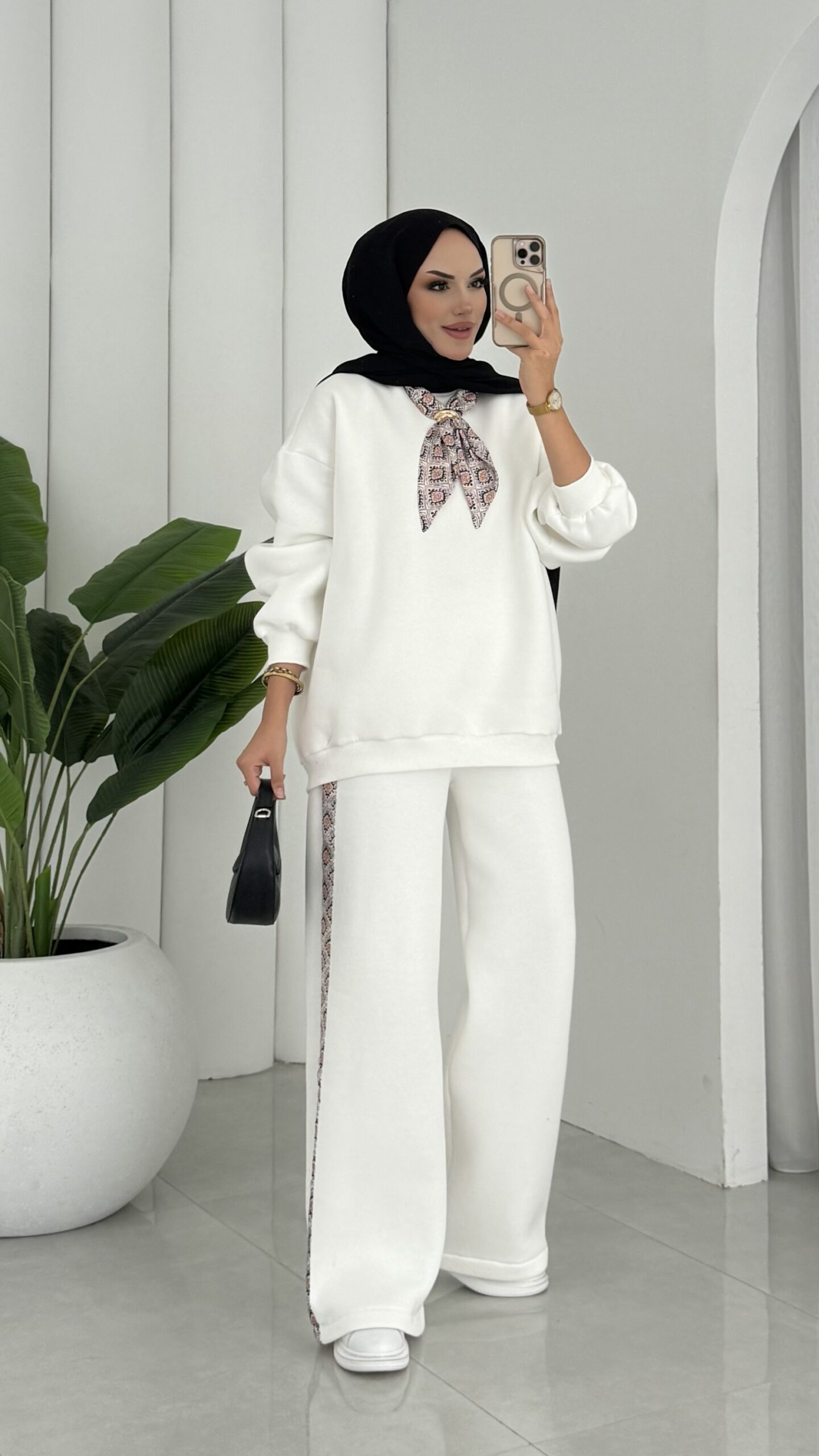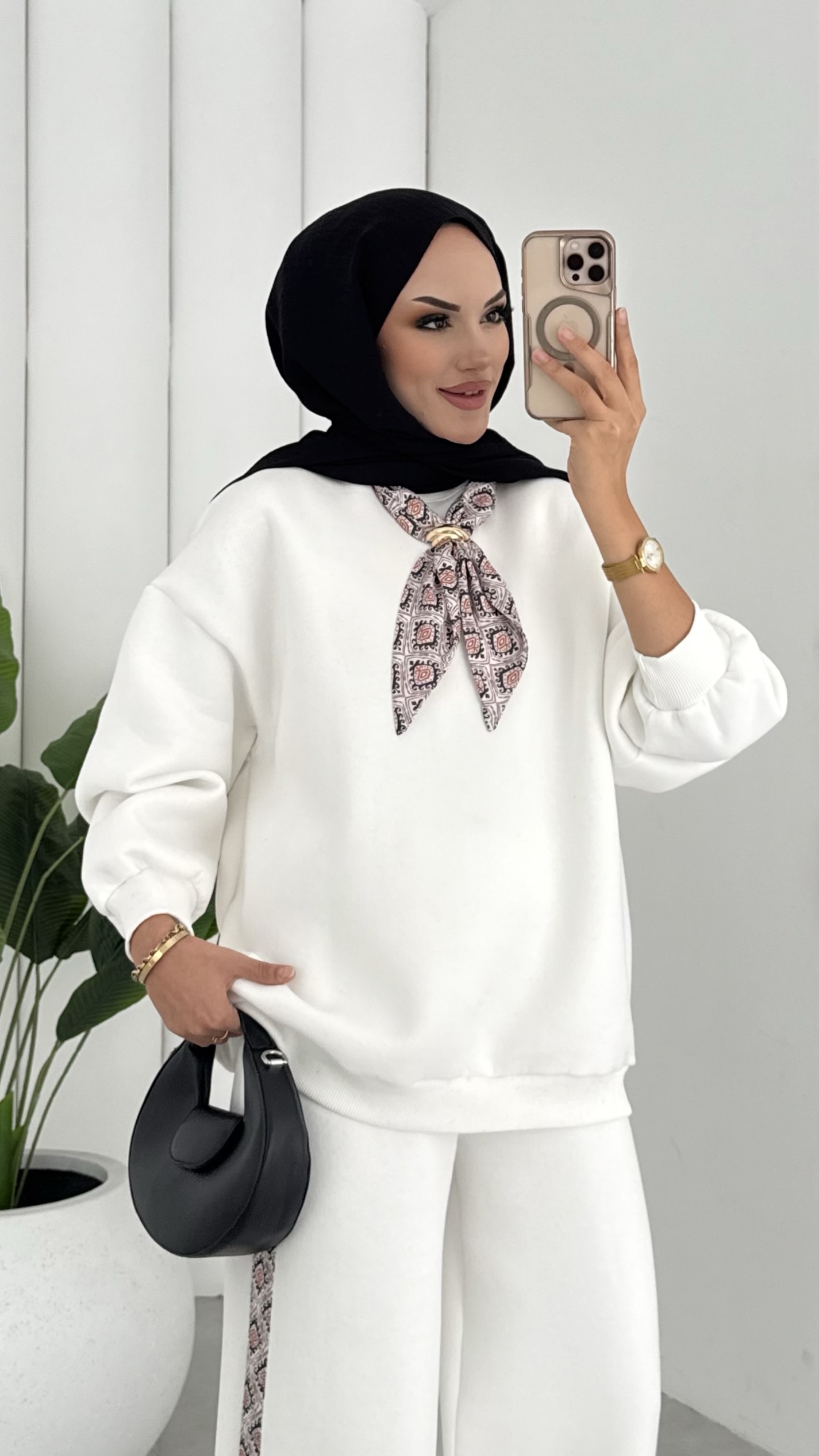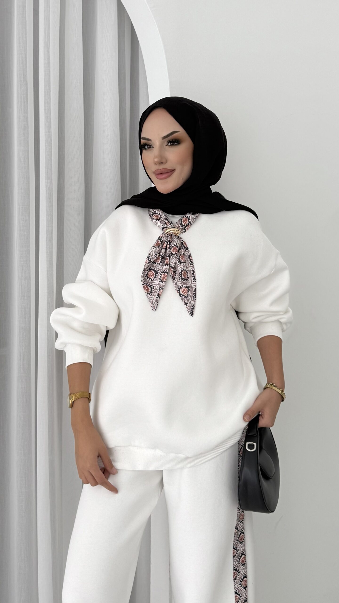 Fular Detaylı Şardonlu Sweat İkili Takım – Beyaz