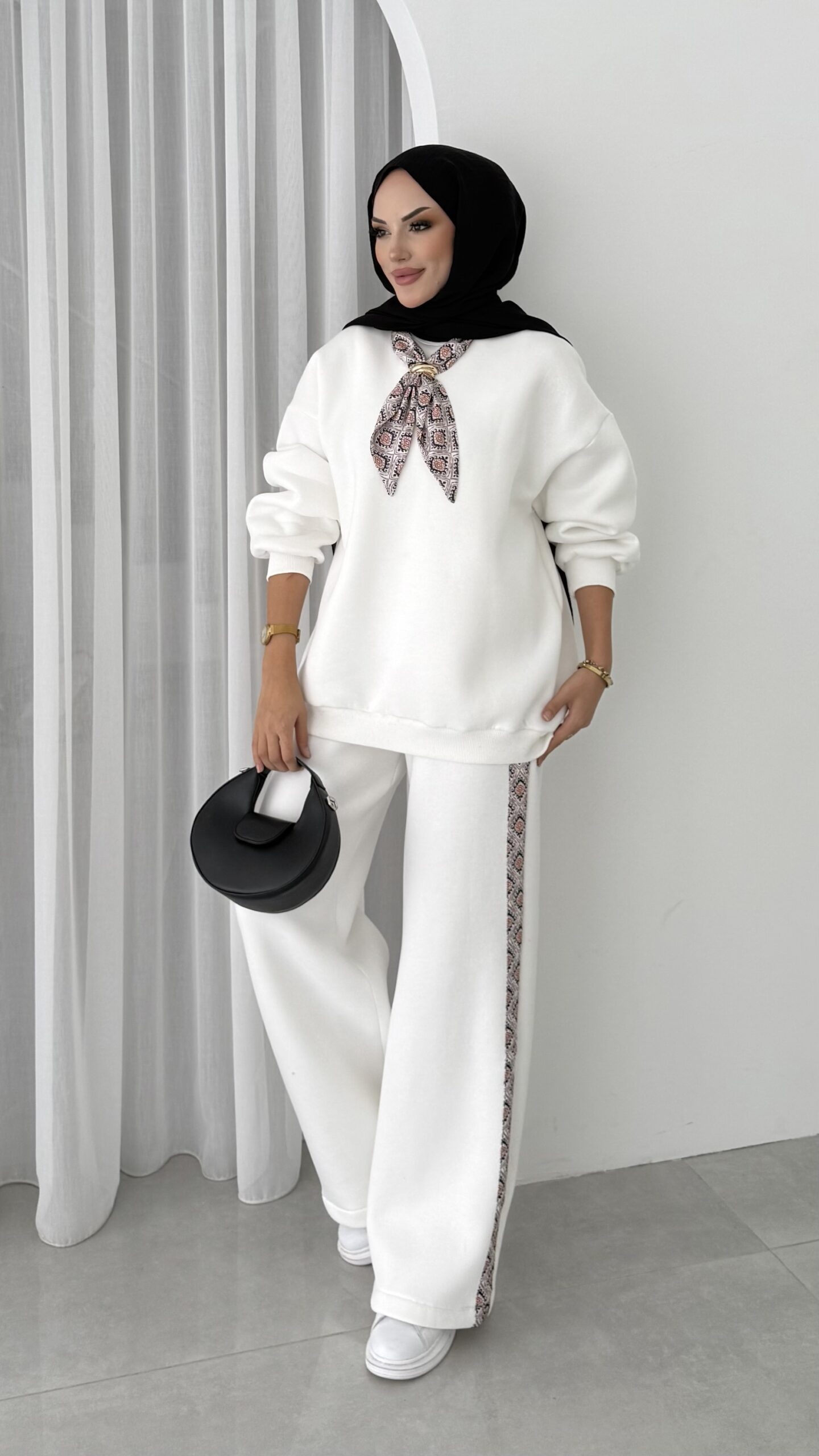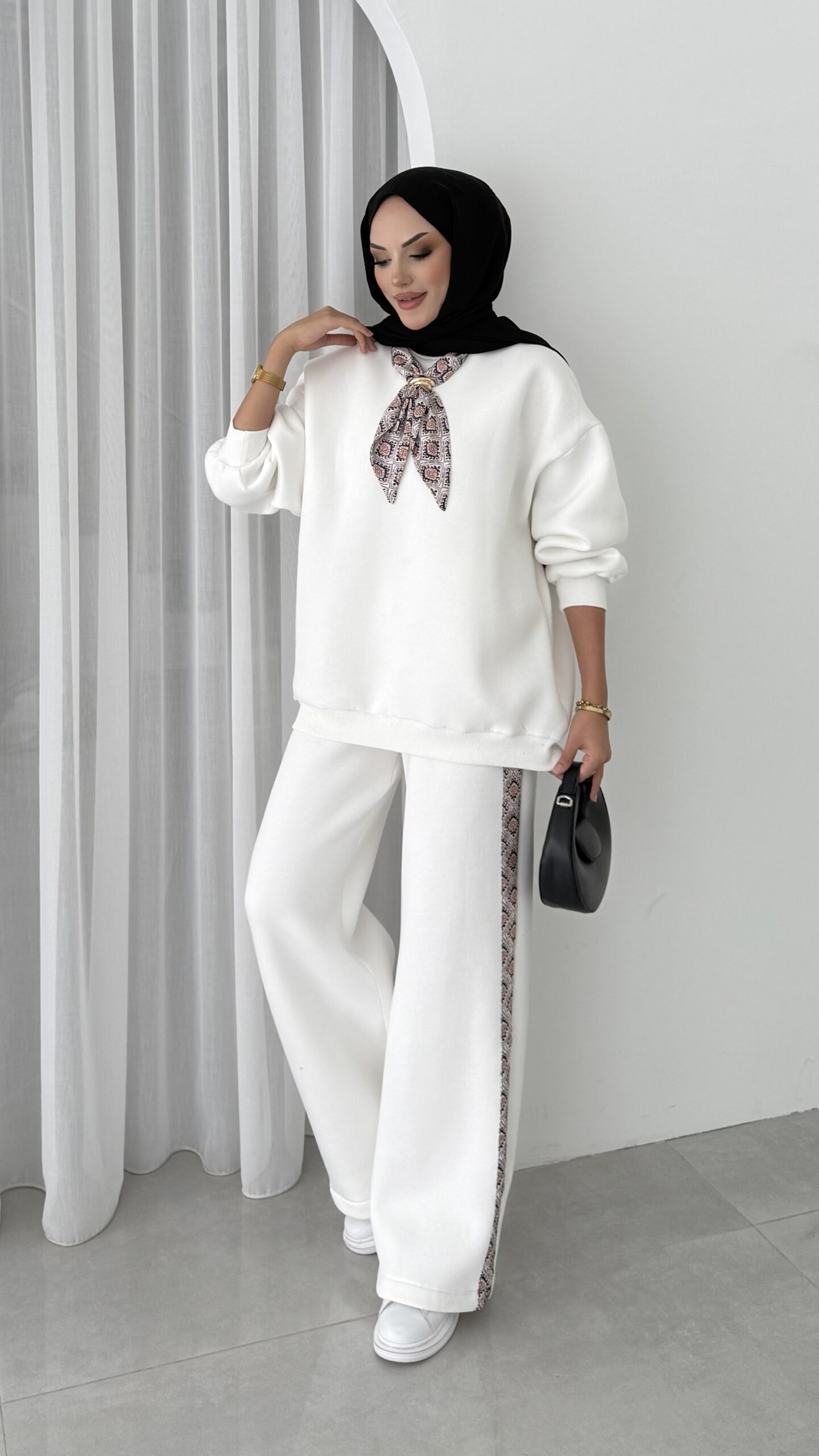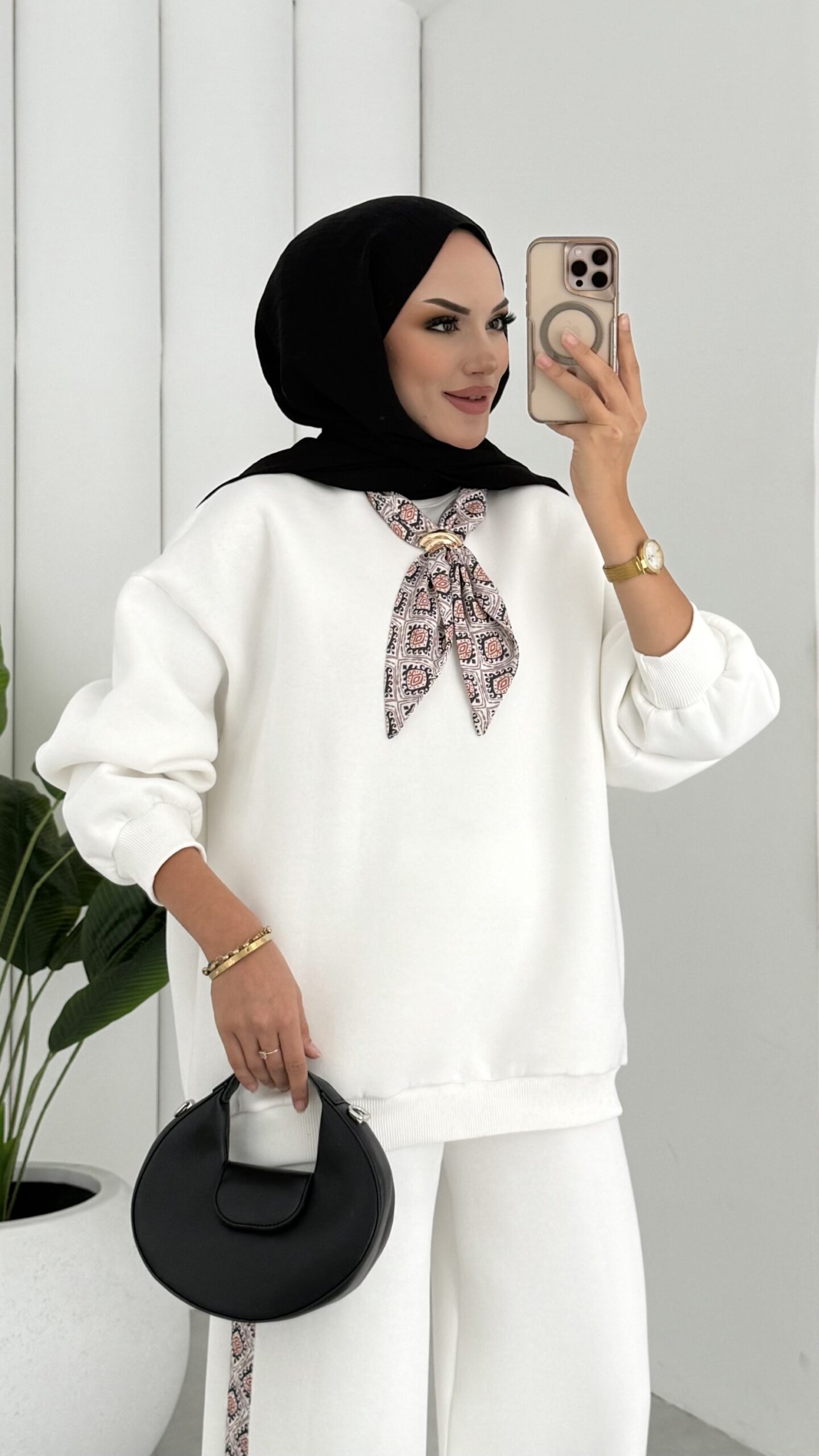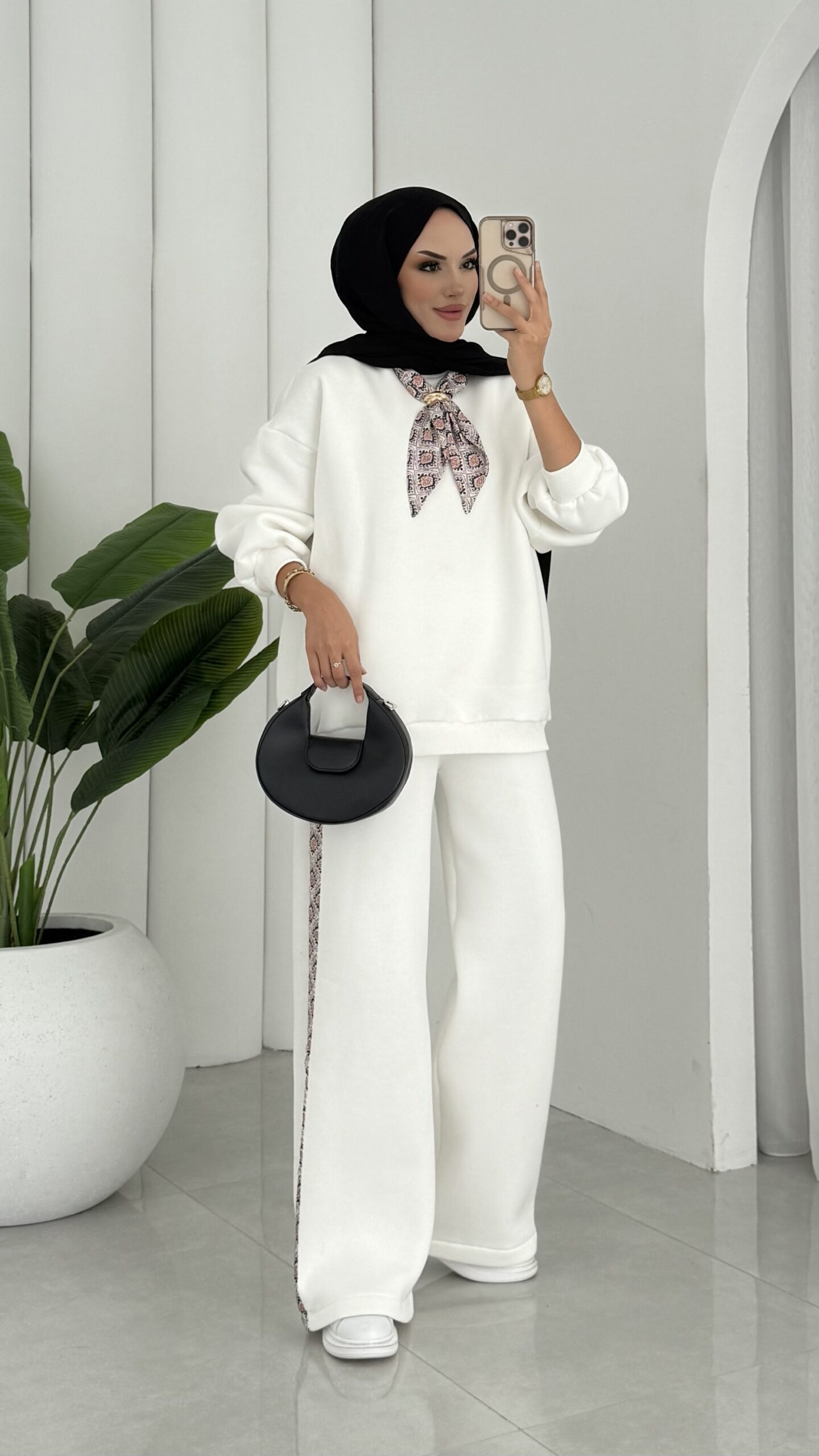 Fular Detaylı Şardonlu Sweat İkili Takım – Beyaz