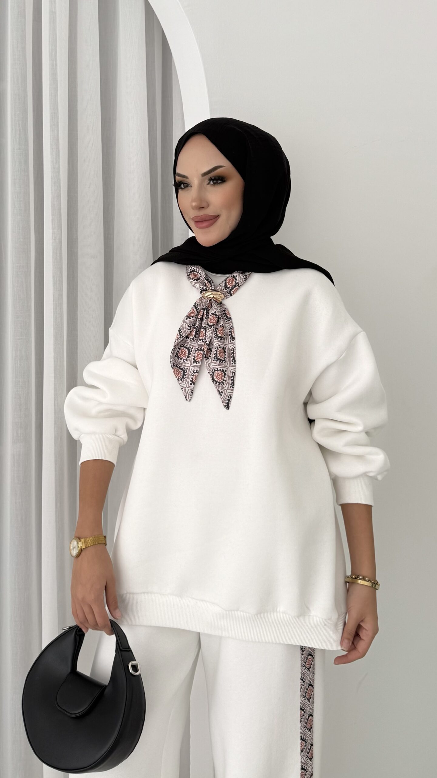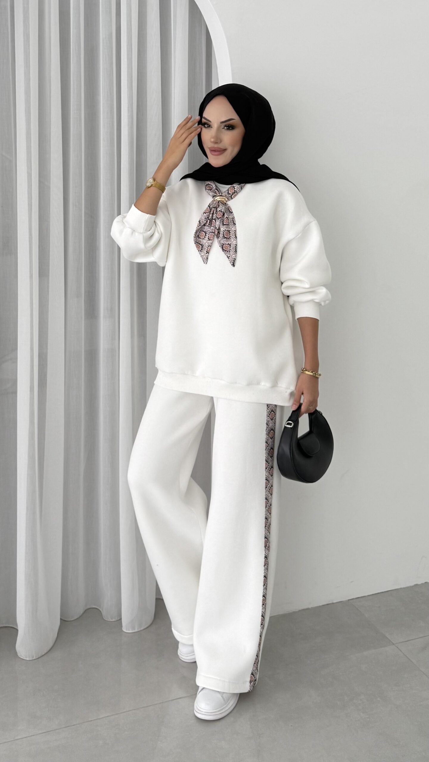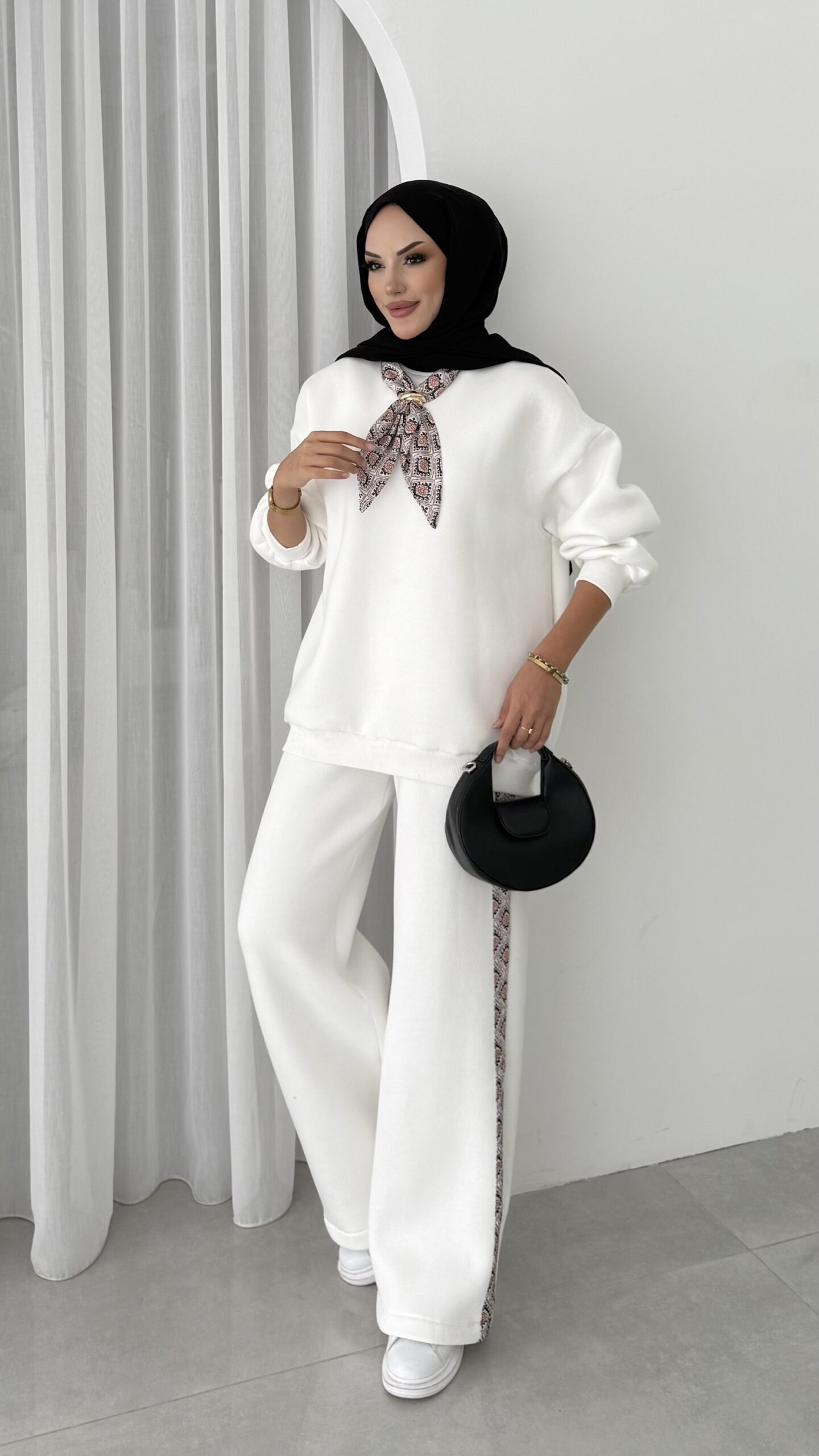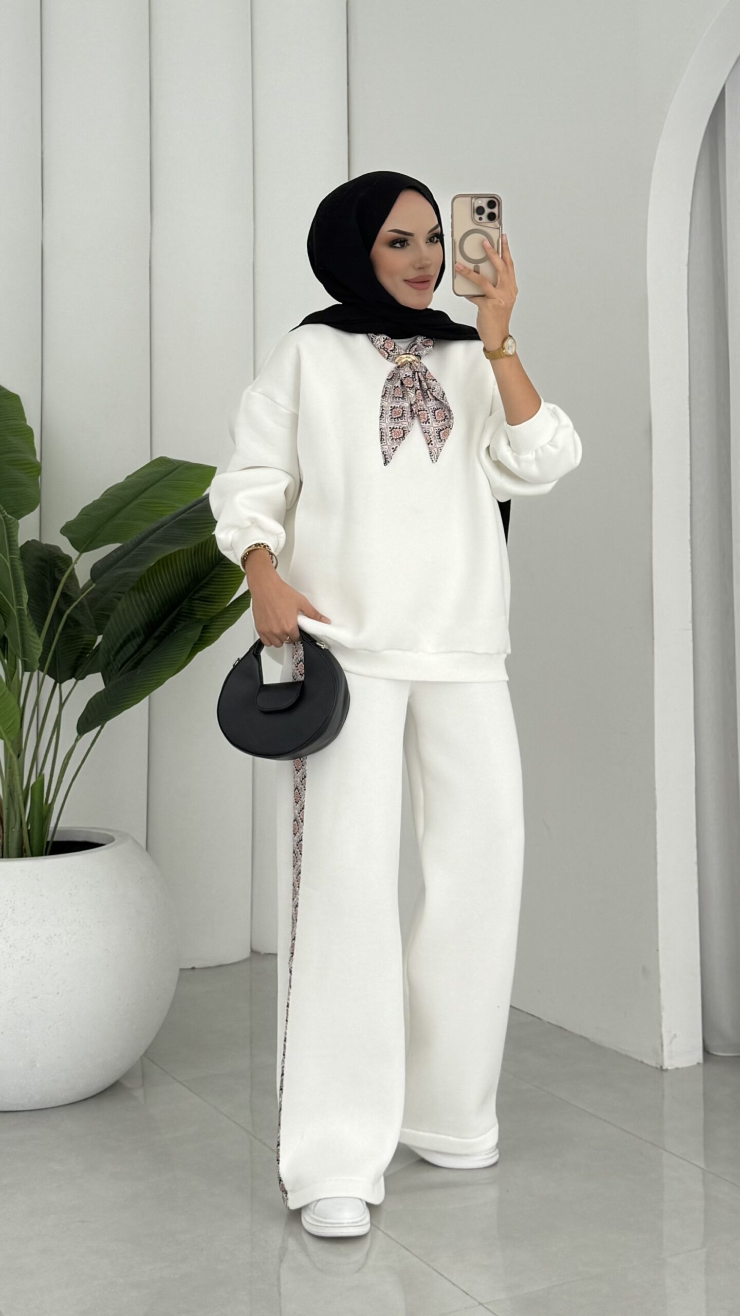 Fular Detaylı Şardonlu Sweat İkili Takım – Beyaz