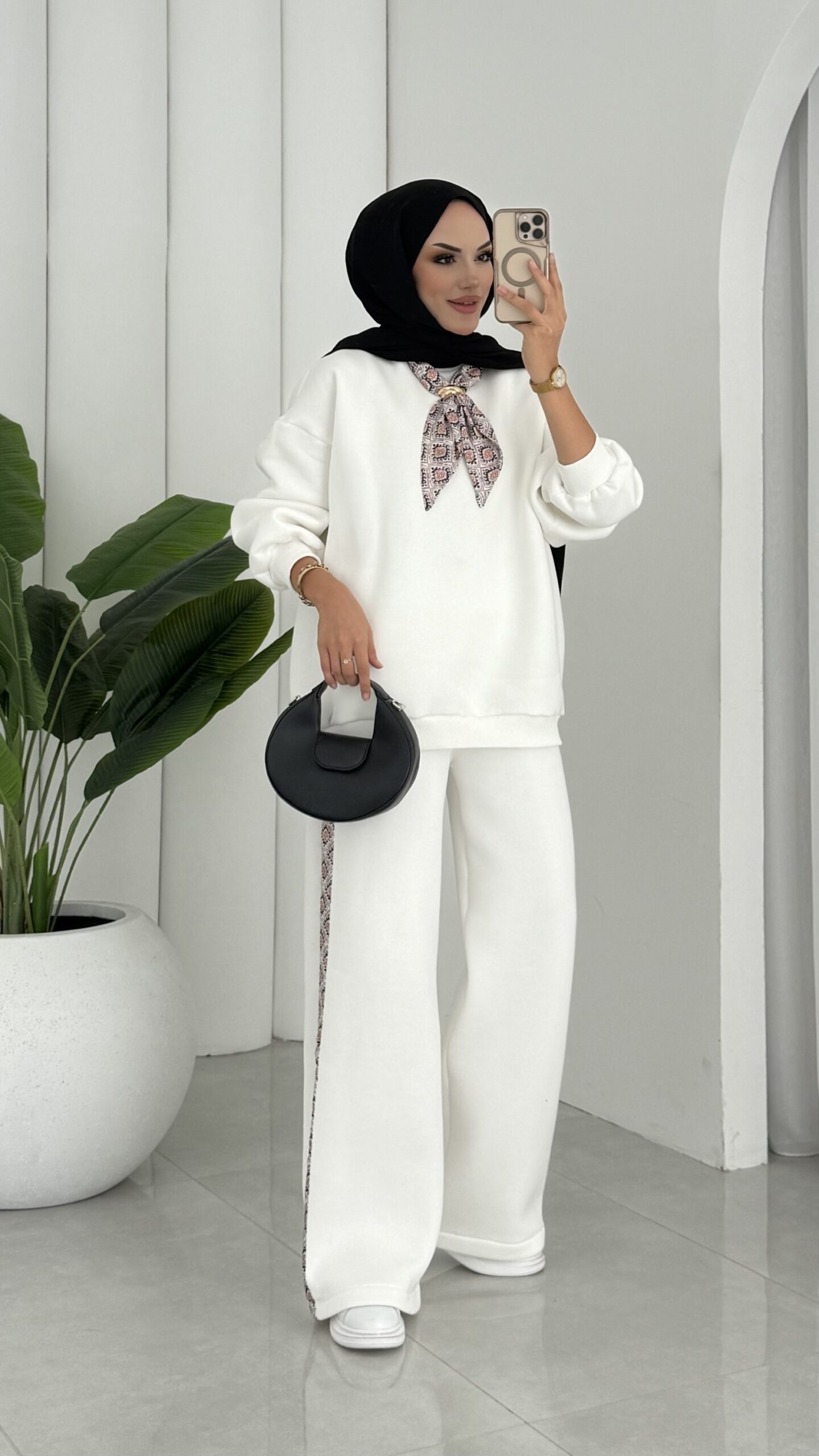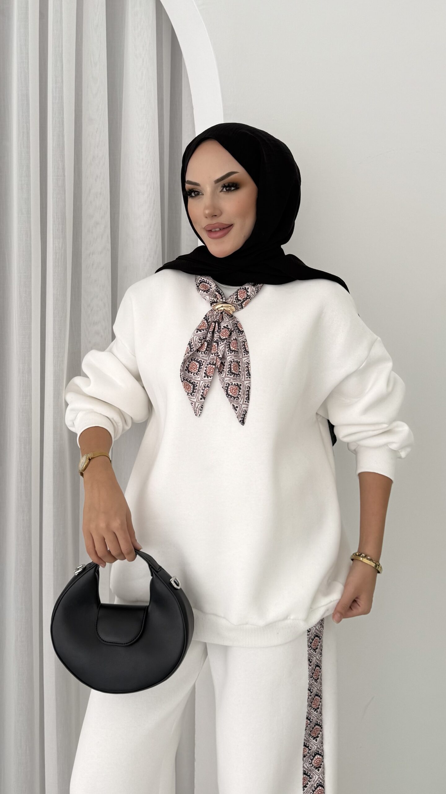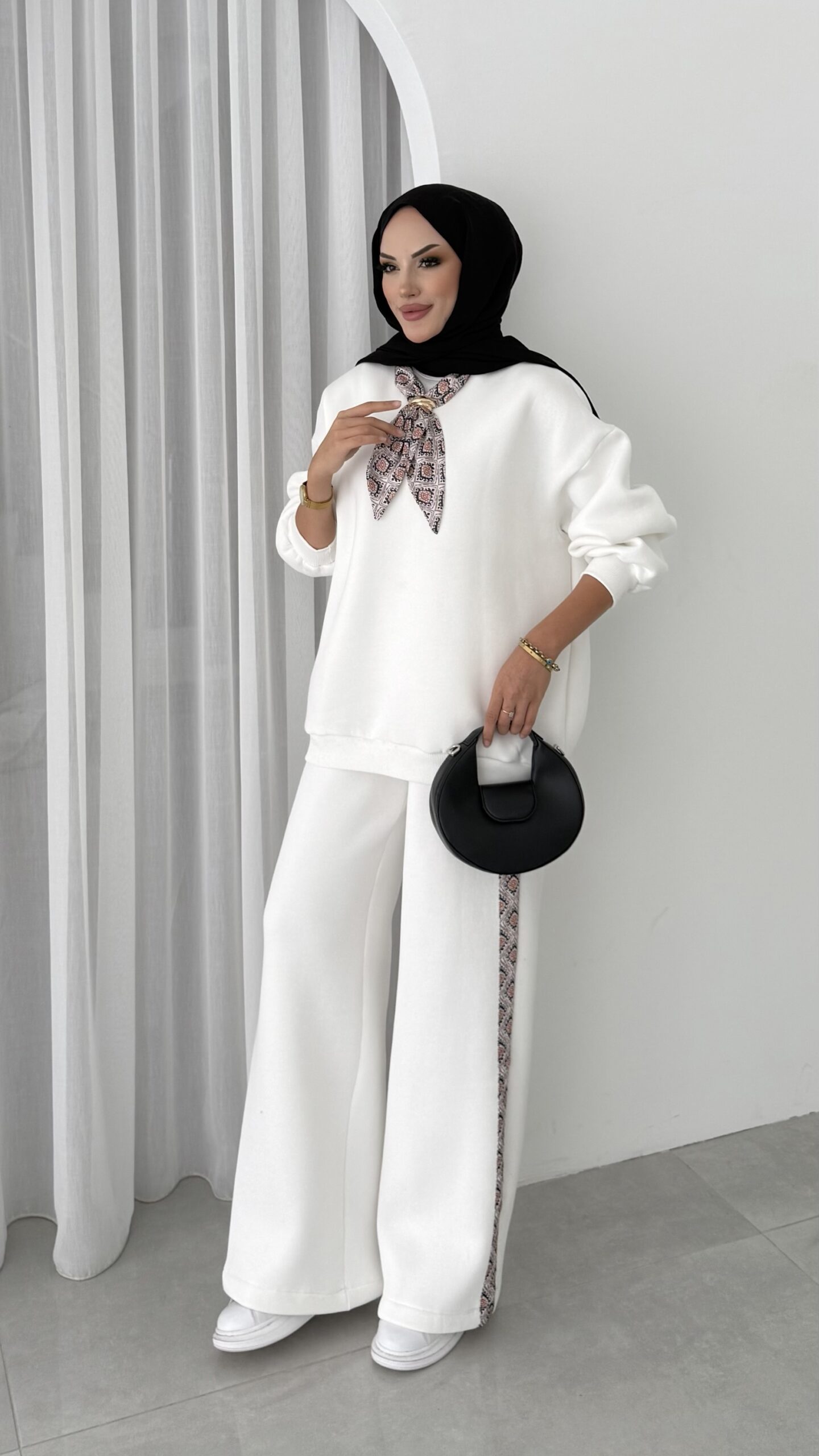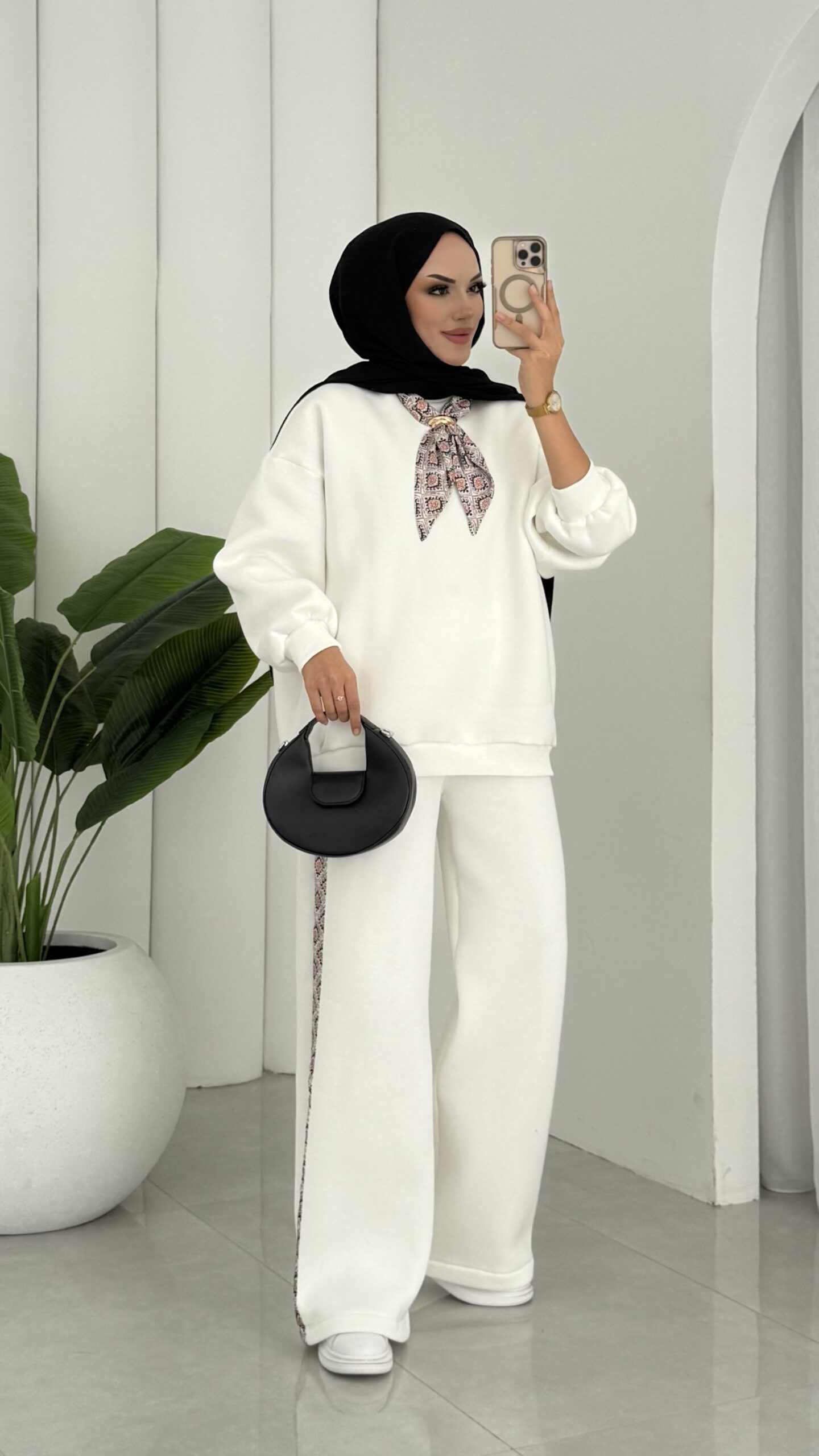 Fular Detaylı Şardonlu Sweat İkili Takım – Beyaz