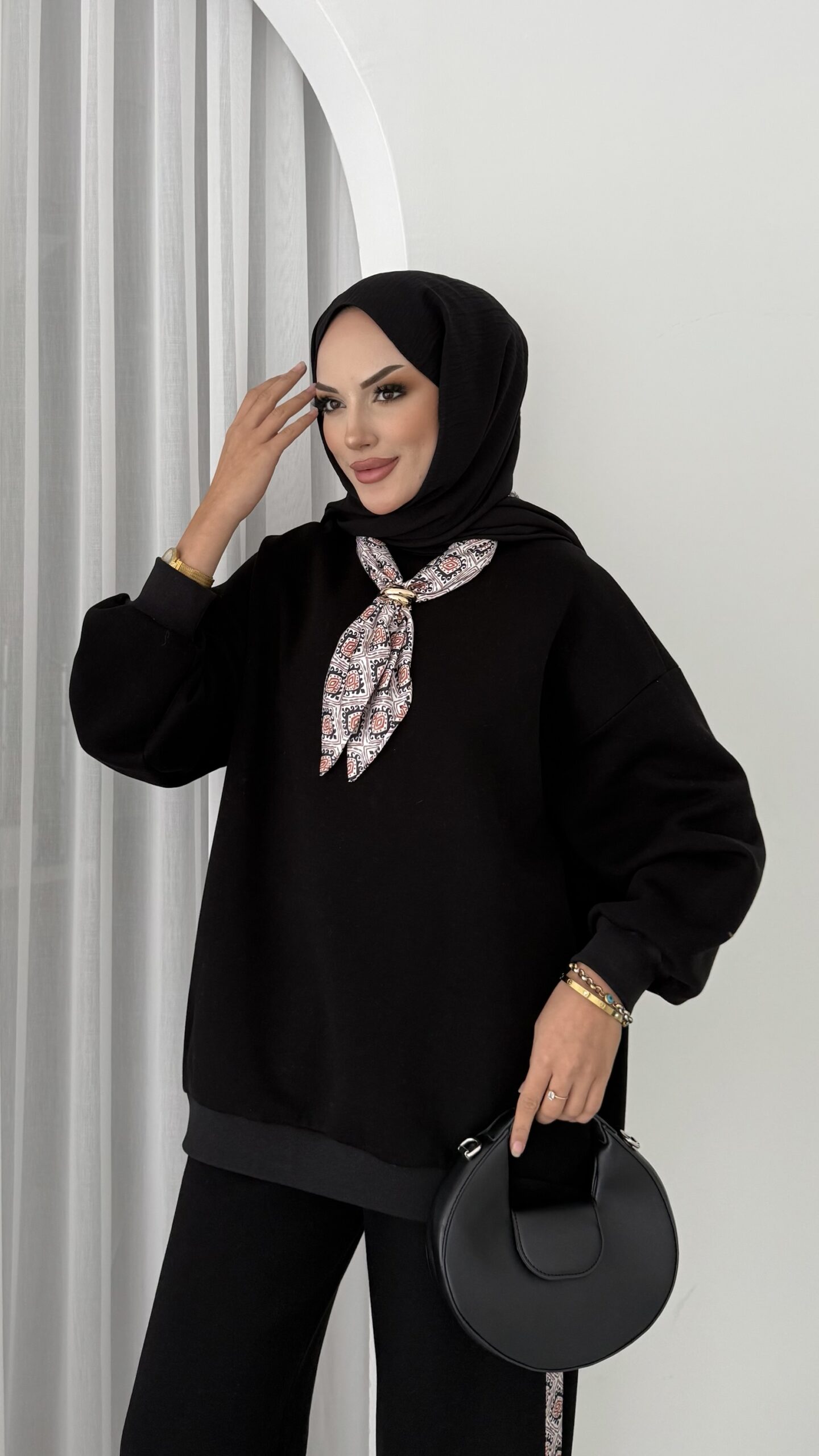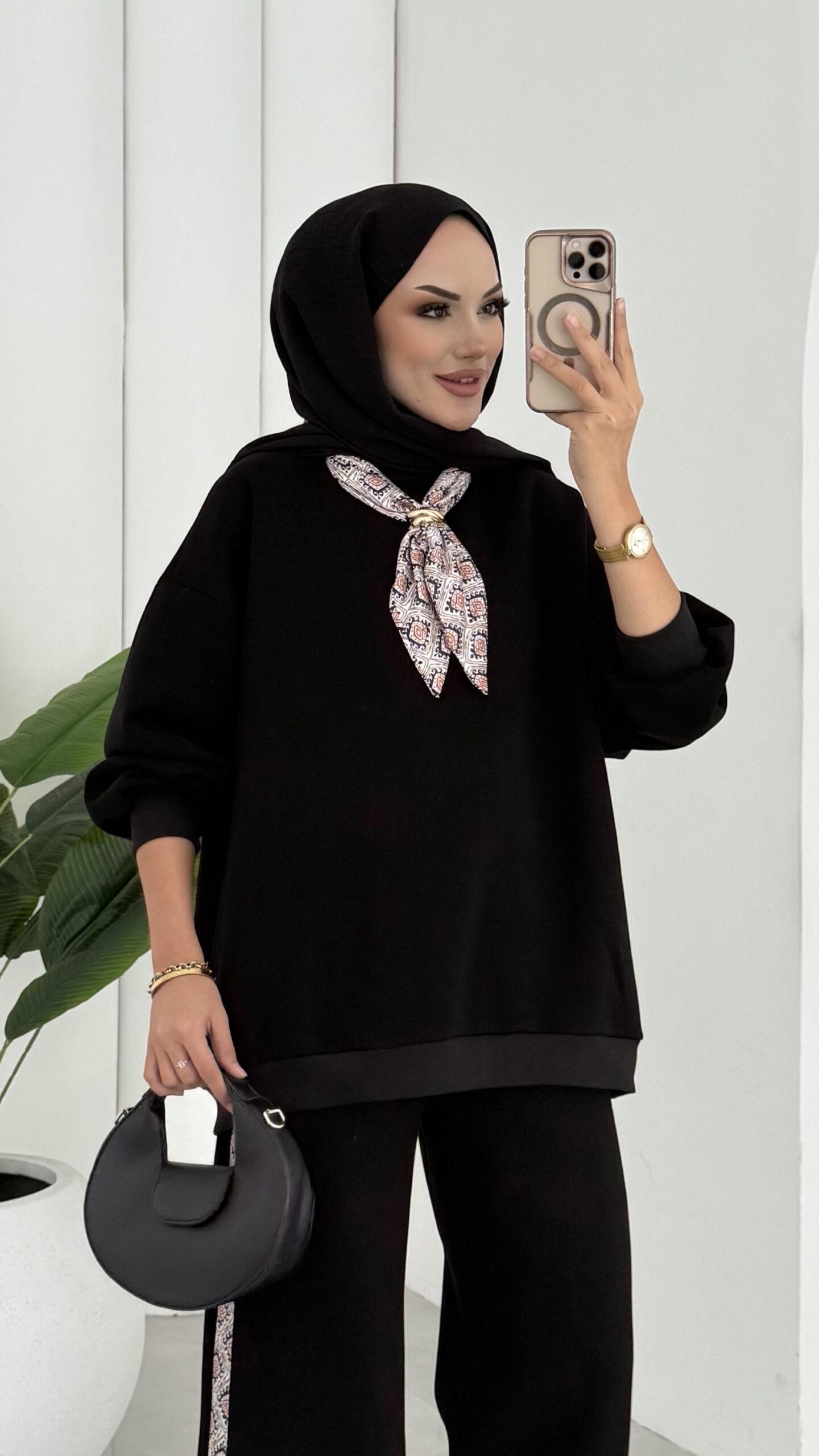 Fular Detaylı Şardonlu Sweat İkili Takım – Siyah
