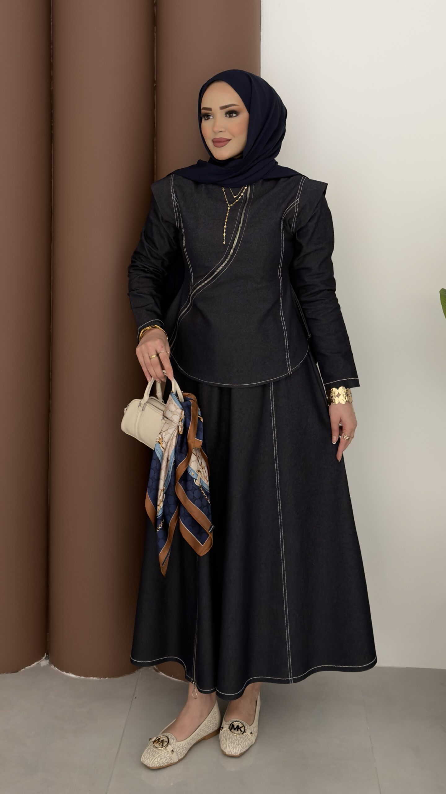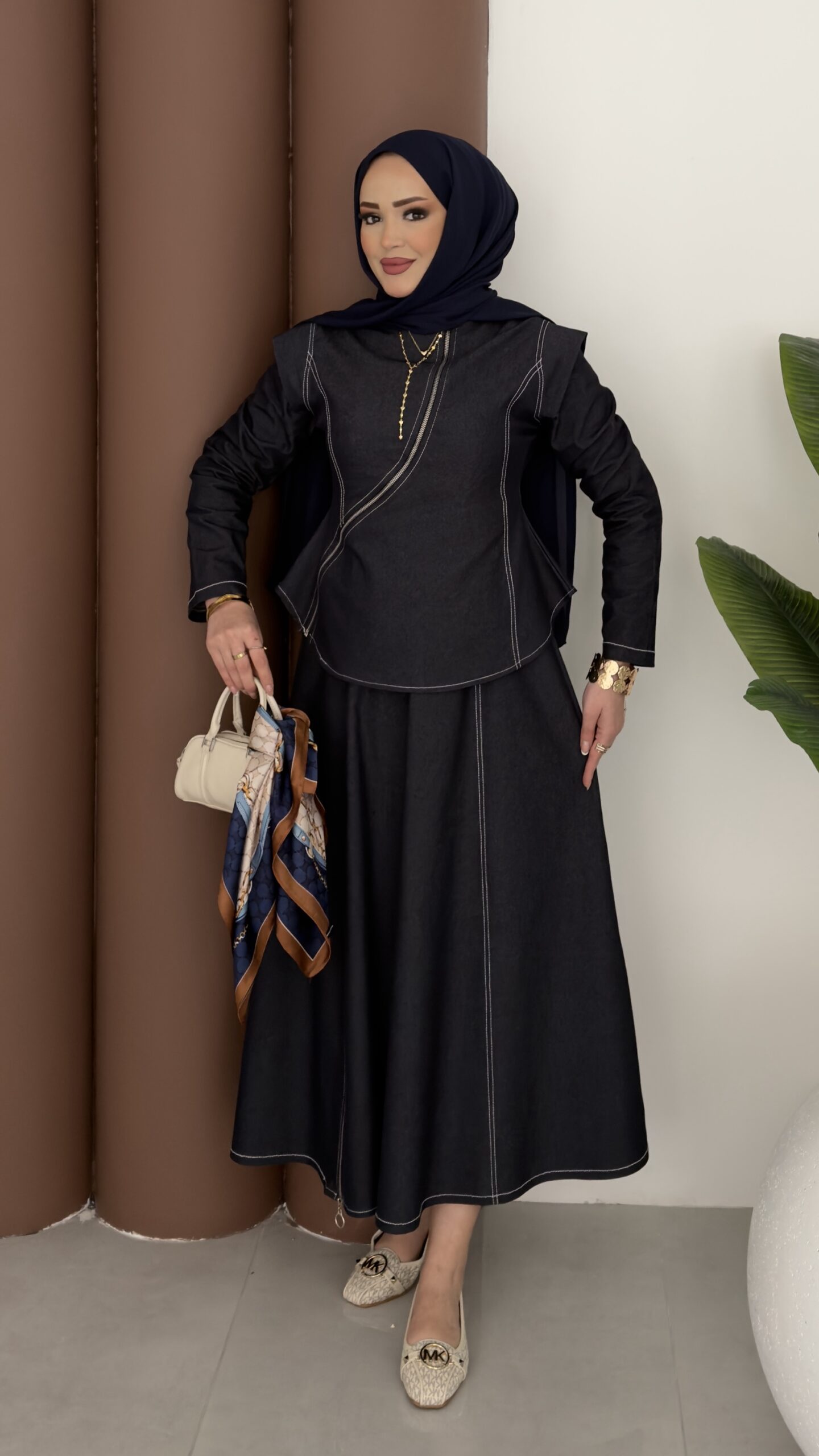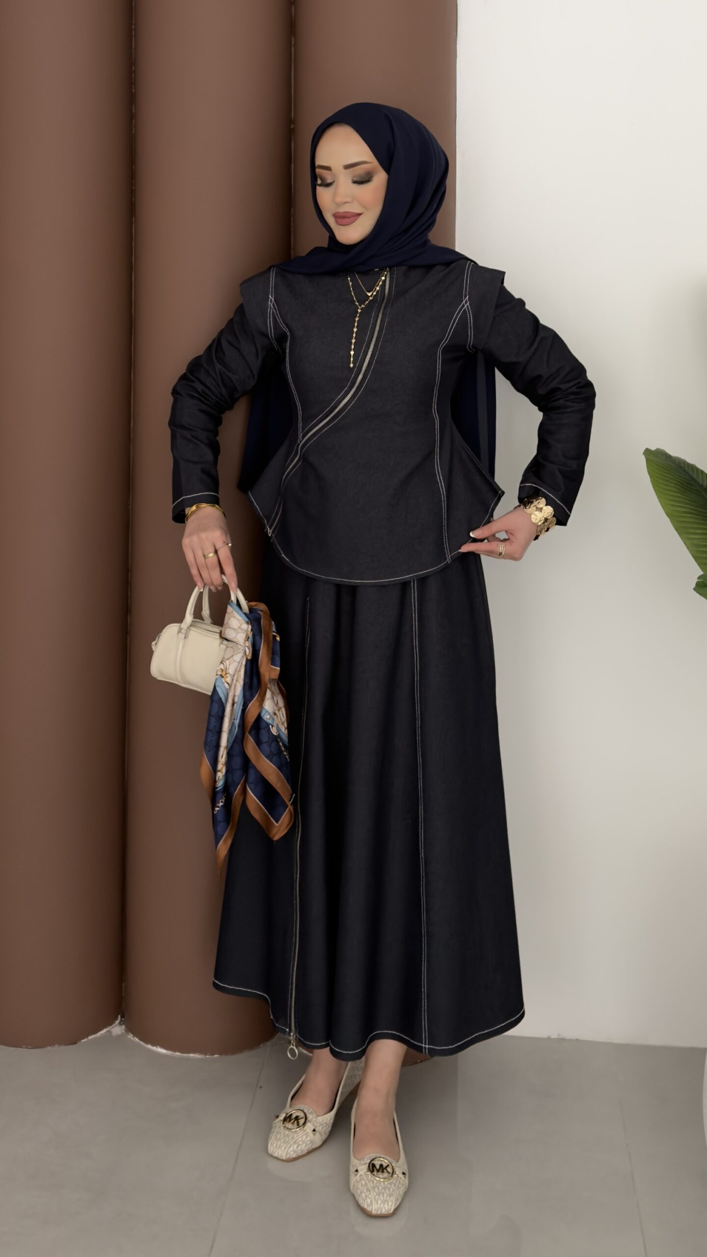 Ghalia Fermuarlı Kot Etekli Takım – Lacivert