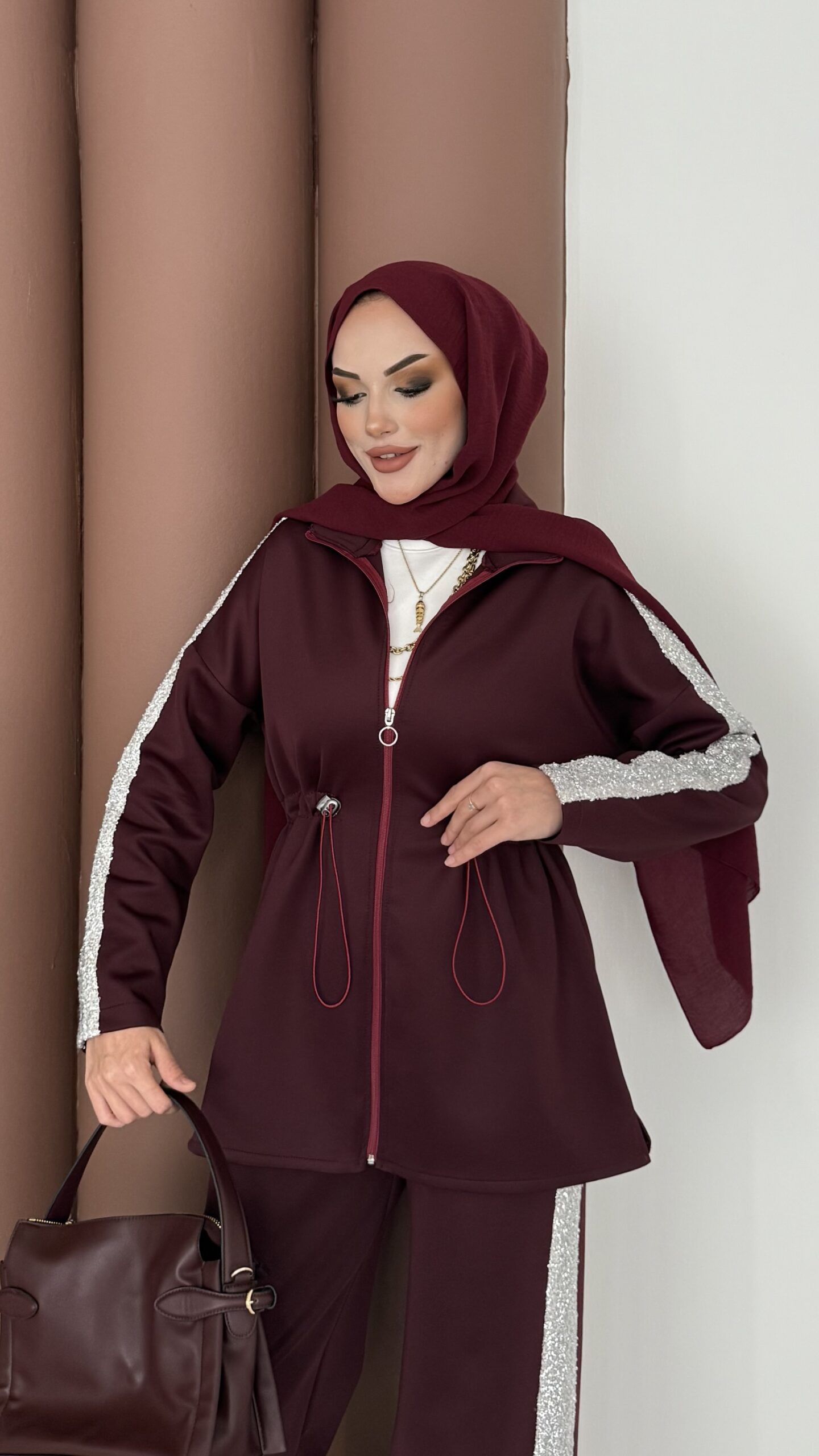 Diamond Taşlı Büzgülü Scuba İkili Takım – Bordo