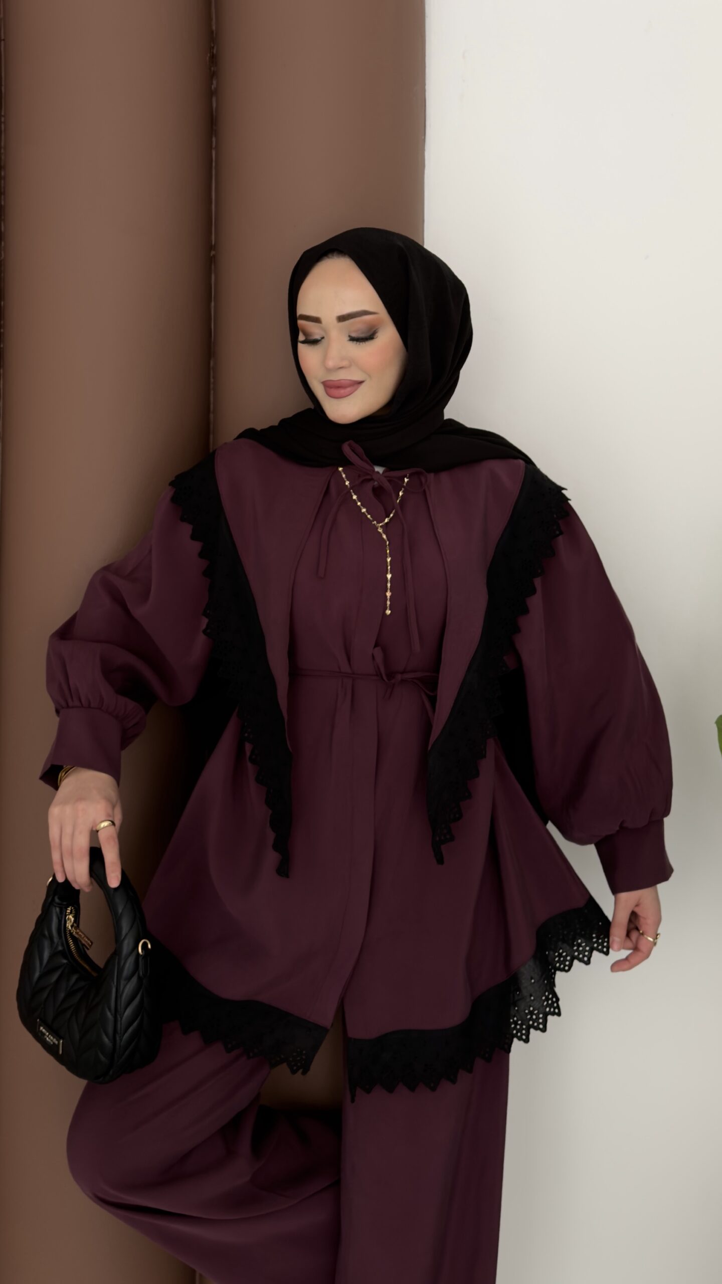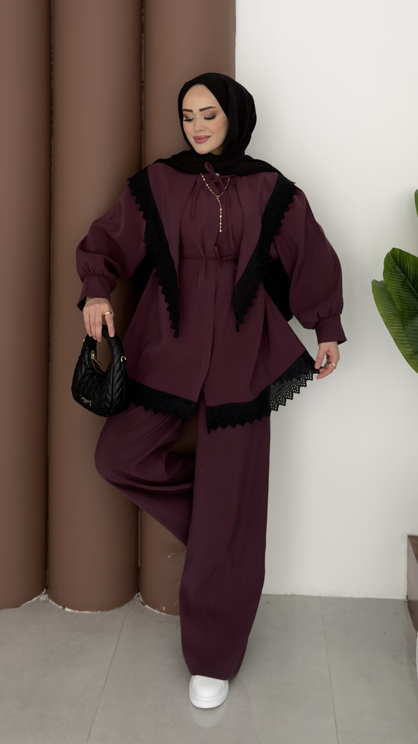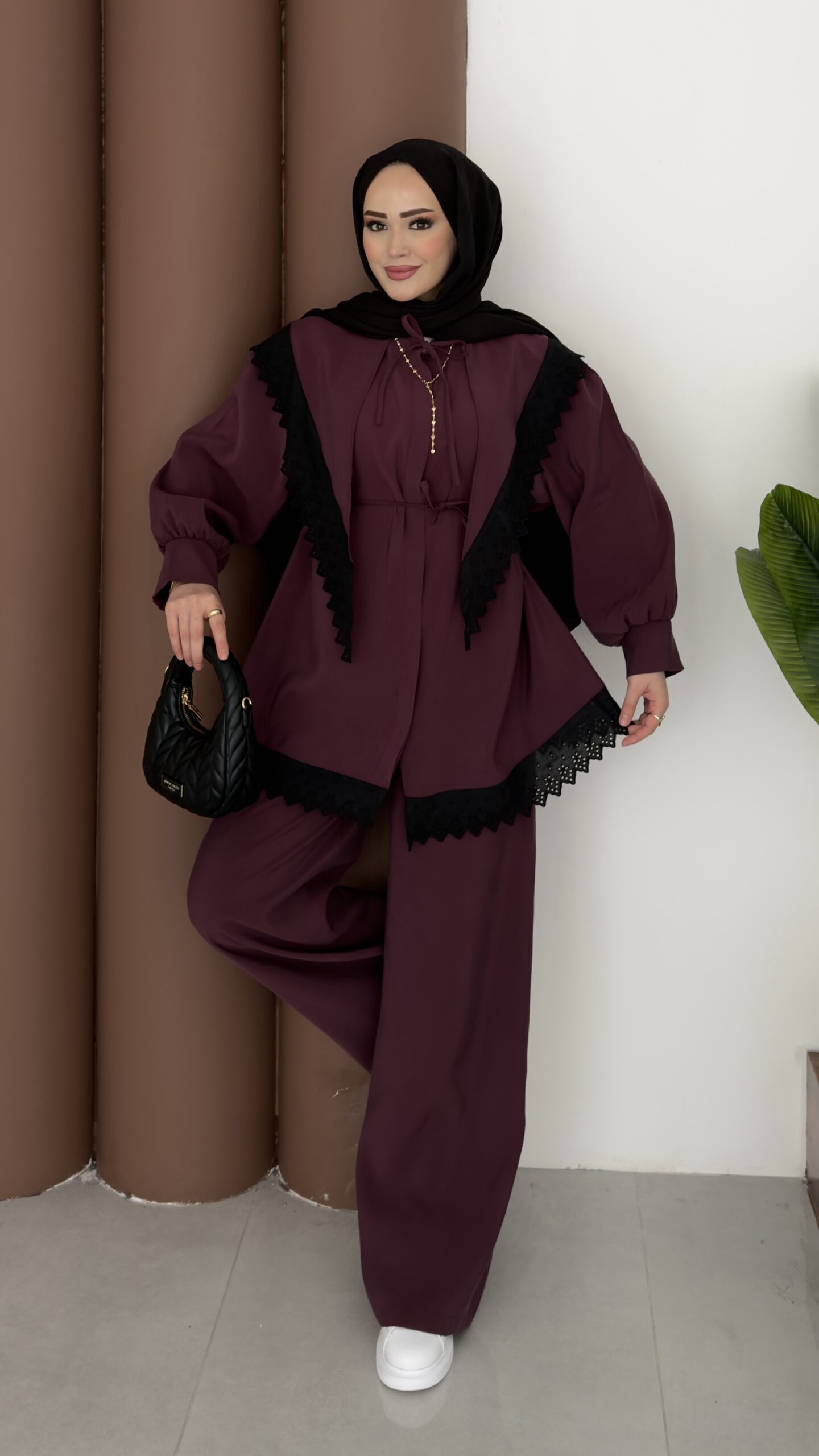 Güpür Yakalı Modal İkili Takım – Mürdüm