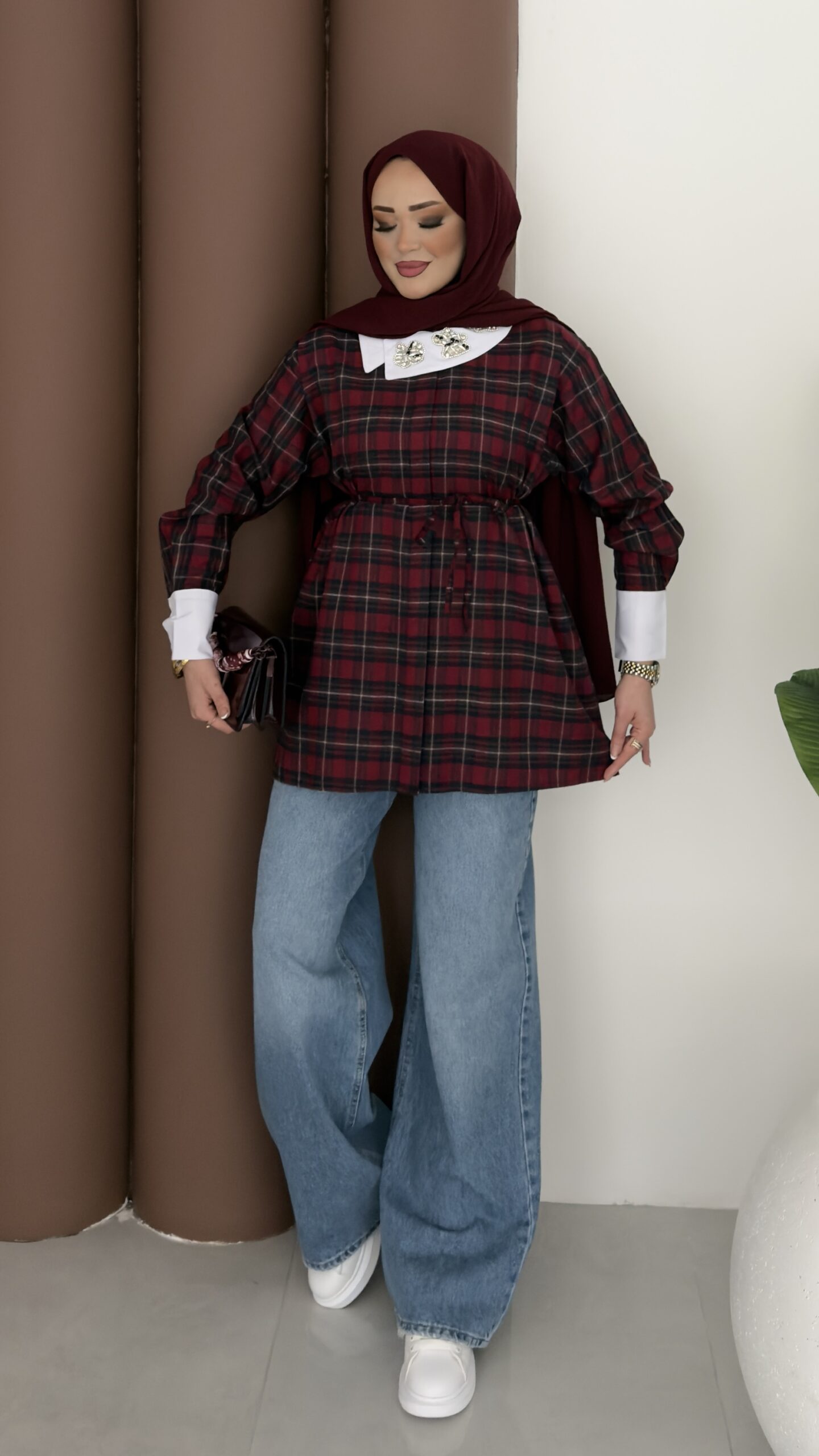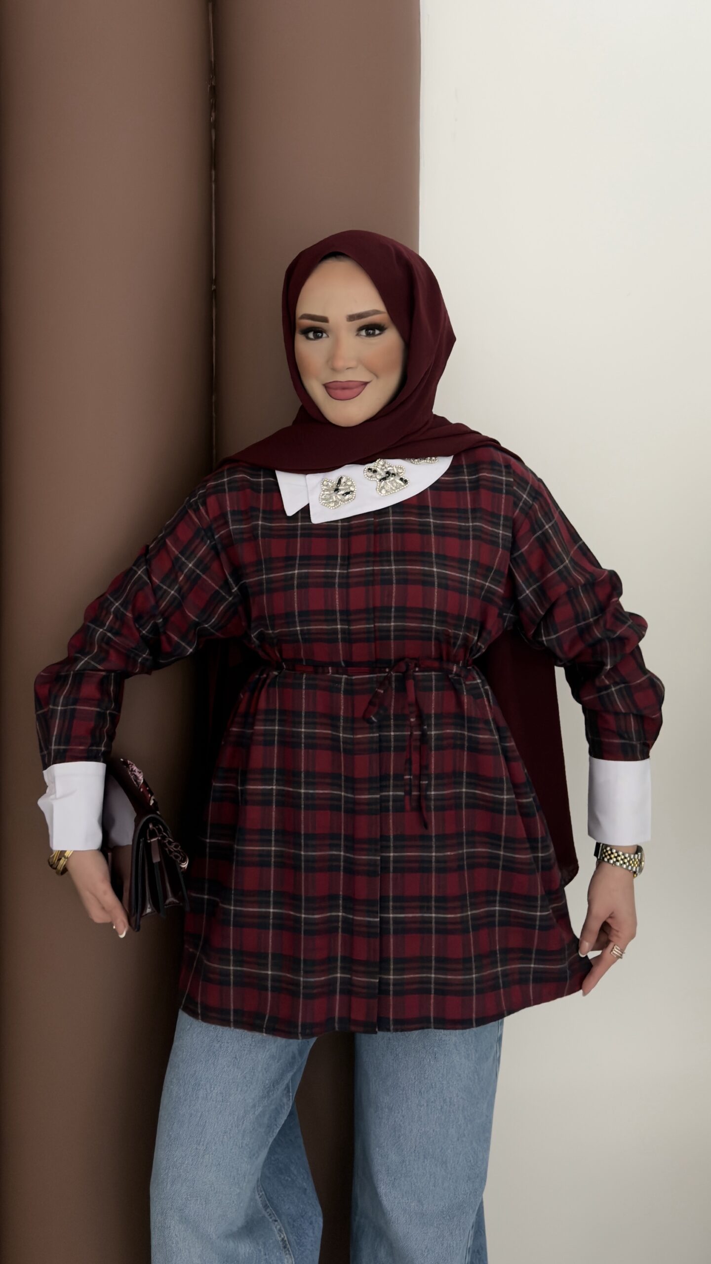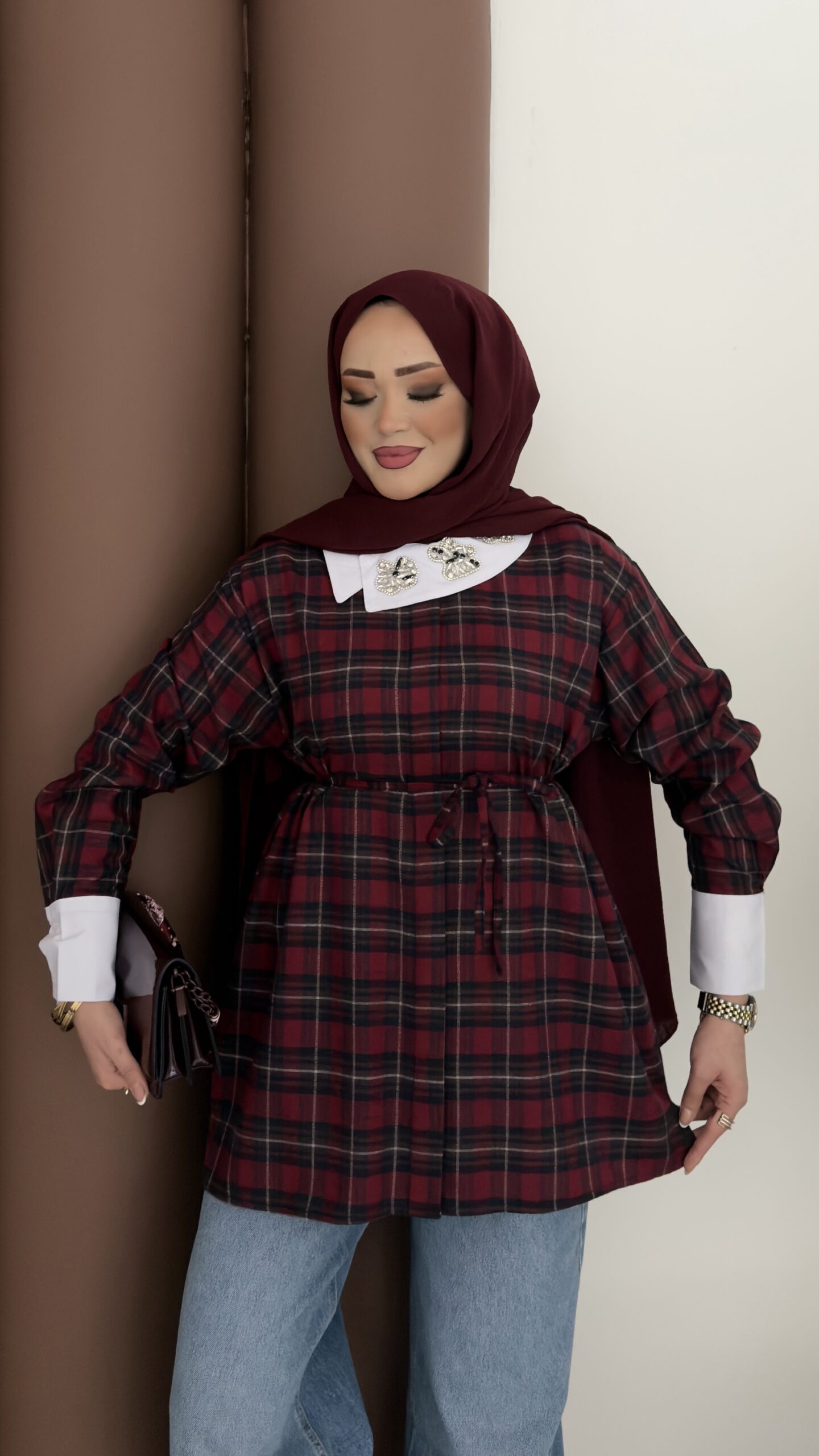 İpekyl Yakası Taşlı Ekose Gömlek – Bordo