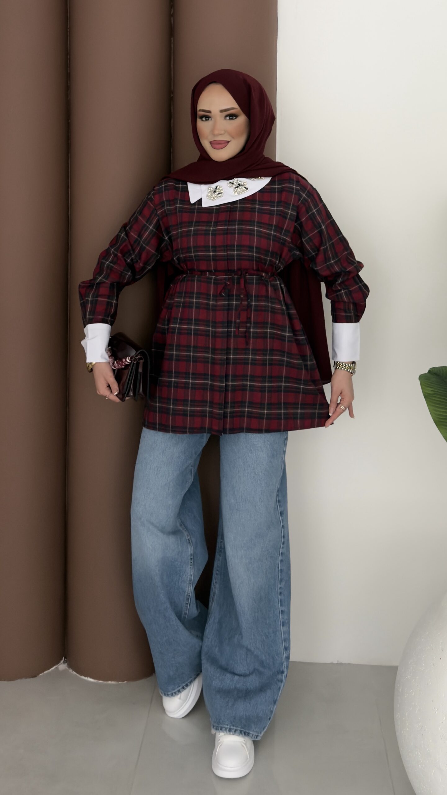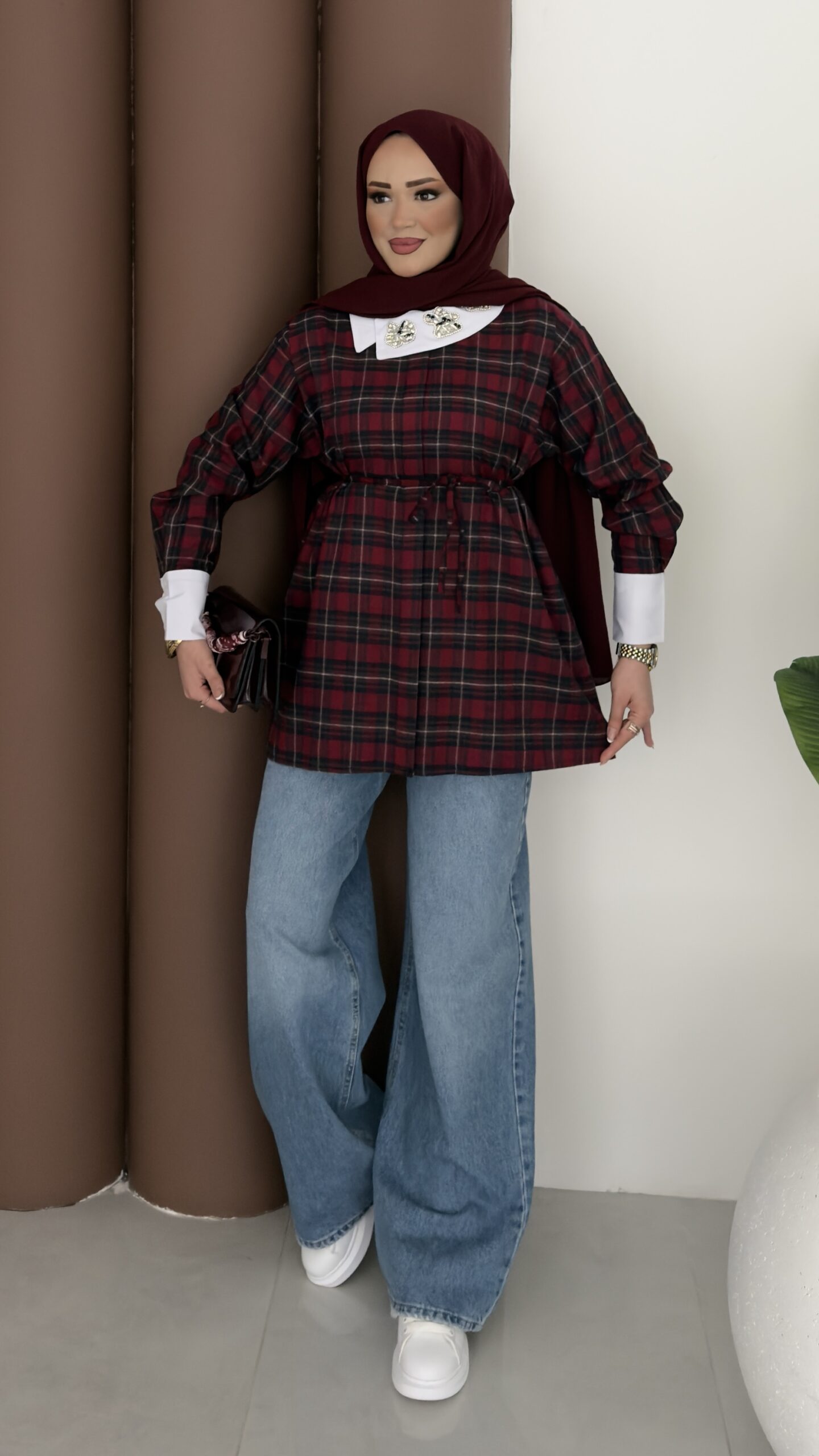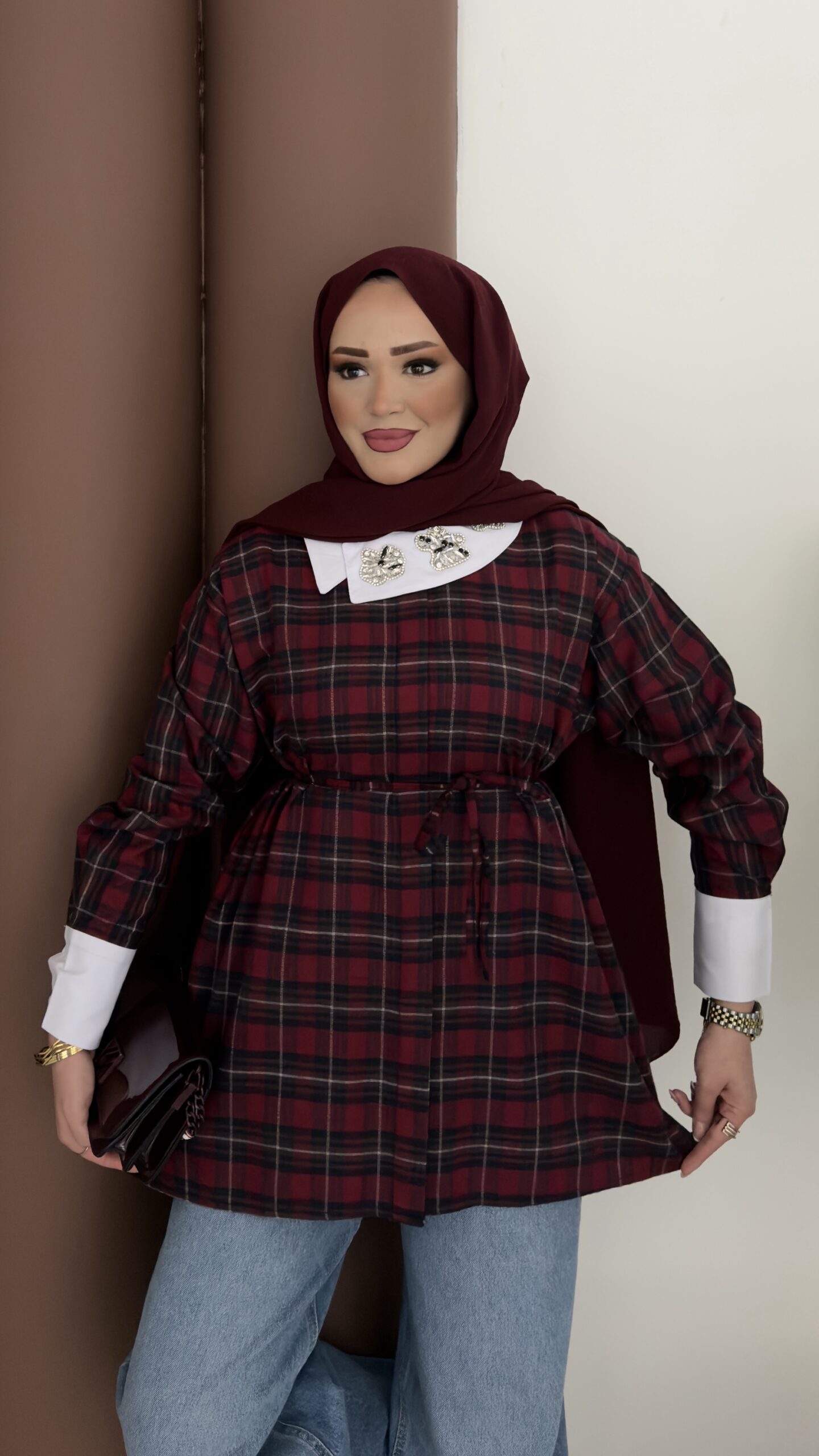 İpekyl Yakası Taşlı Ekose Gömlek – Bordo