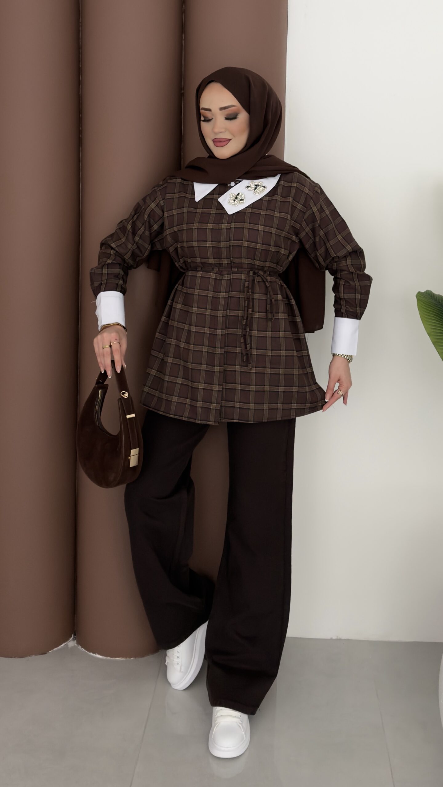 İpekyl Yakası Taşlı Ekose Gömlek – Kahve
