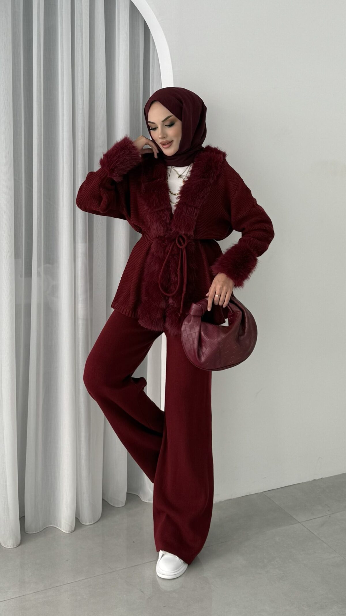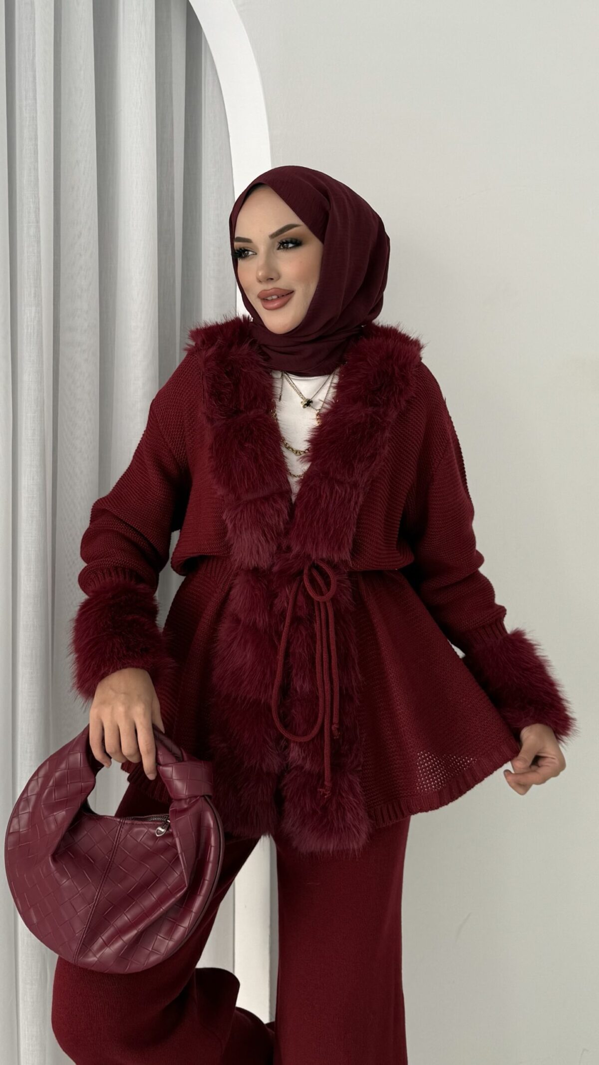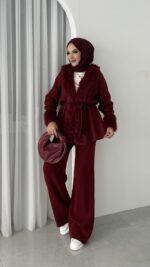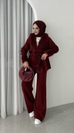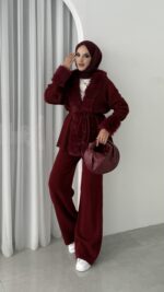 Angora Kürklü Triko İkili Takım – Bordo